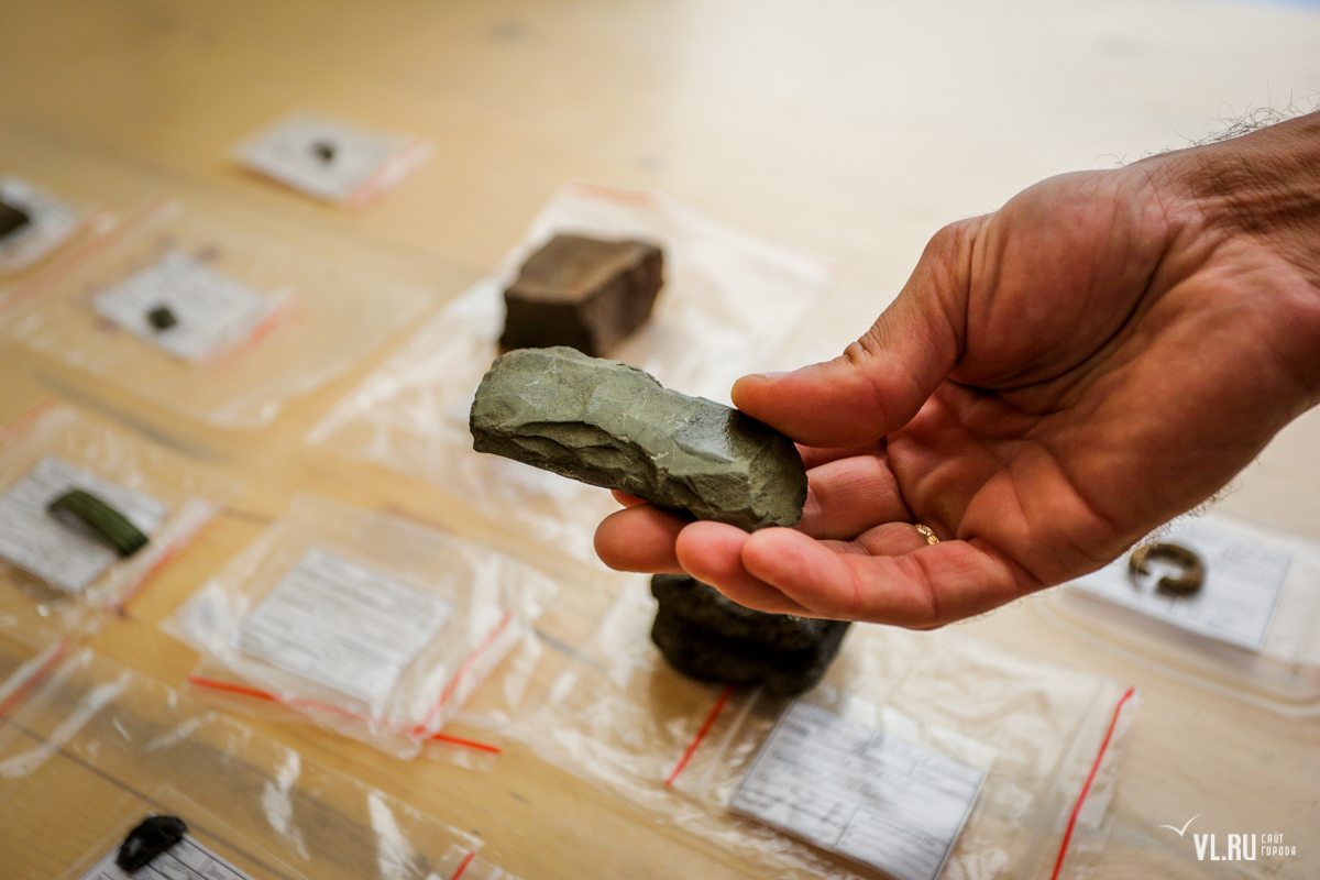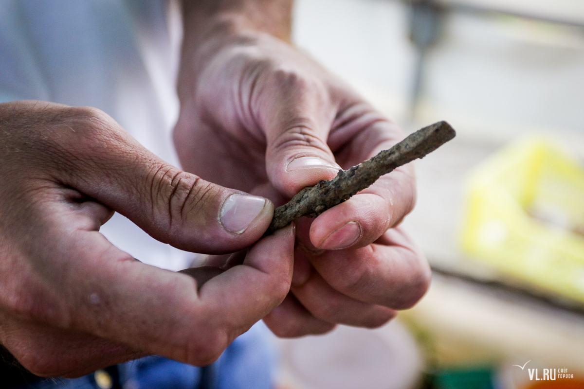 Здесь же, на постаменте в палатке около места раскопок, лежит неплохо сохранившееся пряслице (утяжелитель веретена), железный нож, часть бронзового браслета и наконечник остроги для рыбалки, по виду напоминающий трезубец. Такое орудие, к слову, использовали и жившие здесь позднее коренные малочисленные народы Приморья.