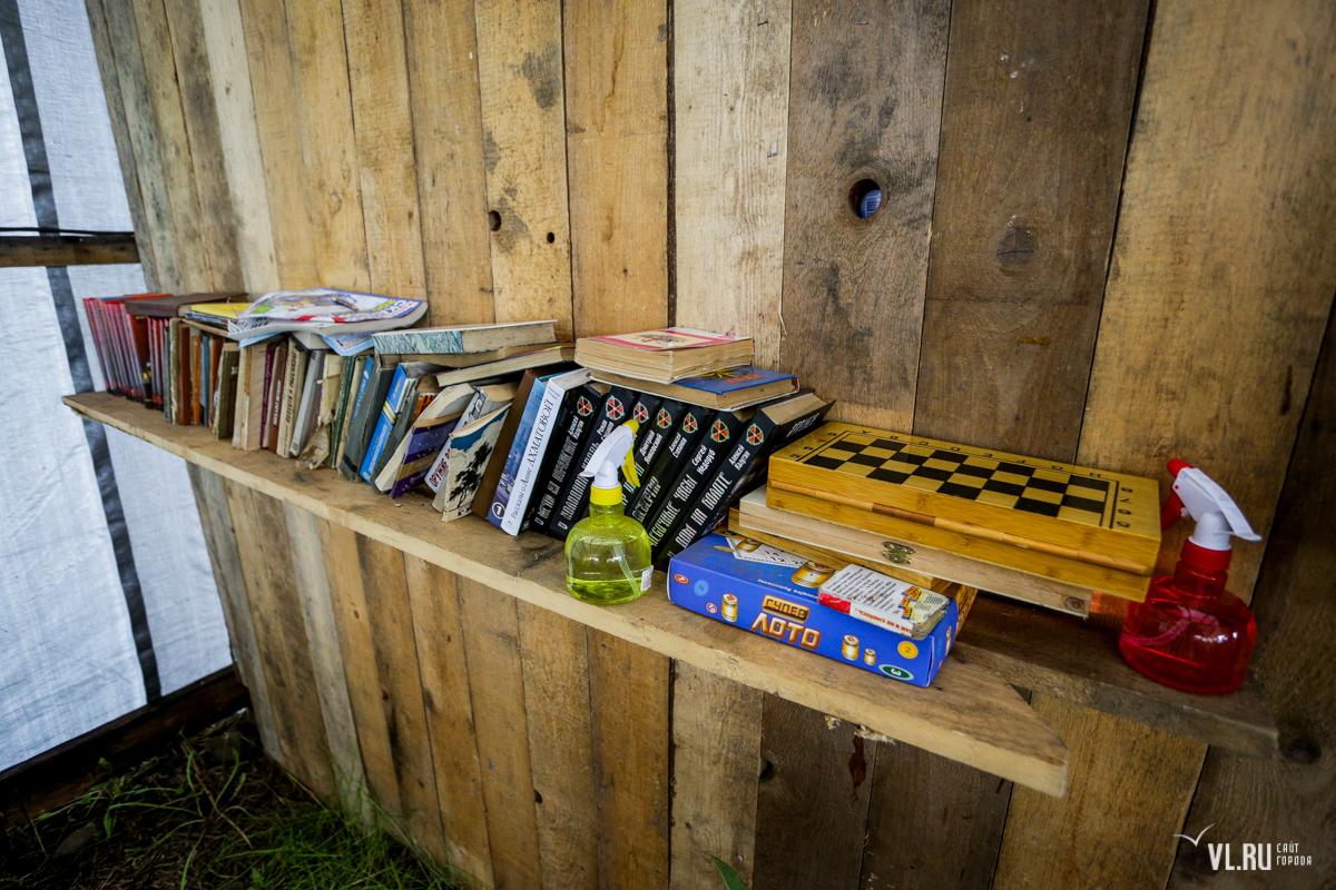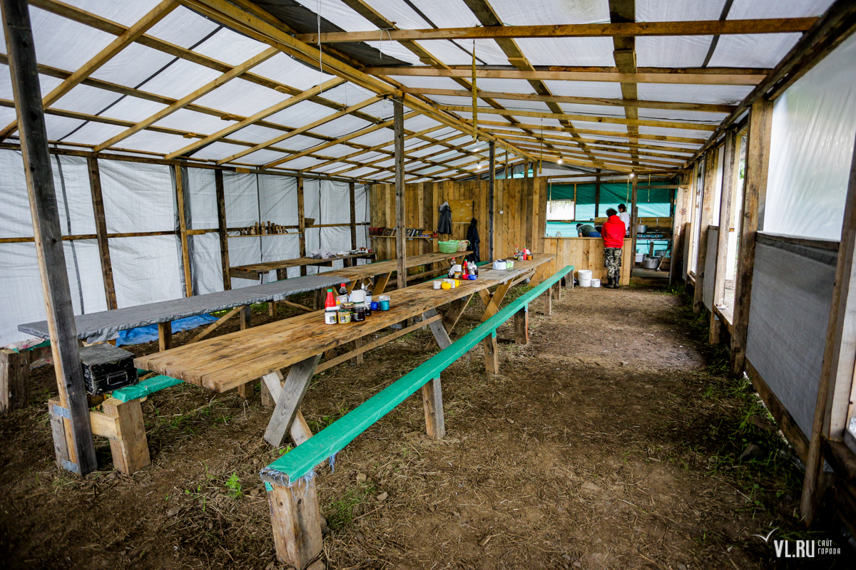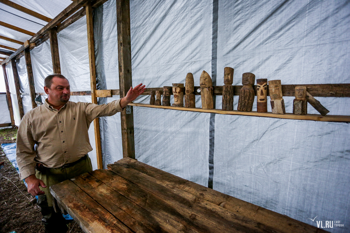 Через дорогу находится большая столовая. Здесь на отдельных столах иногда сушат археологические находки. В отдельном уголке – книжная полка и деревянные истуканы, их археологи по традиции вырезают уже 30 лет. Самый ранний датирован 1991 годом, его сделали на раскопках в бухте Бойсмана. Есть здесь работы, созданные в селе Ветка Ольгинского района и на Лузановой сопке в Ханкайском районе. Самая поздняя работа вытесана в 2017 году неподалёку — в Штыково.