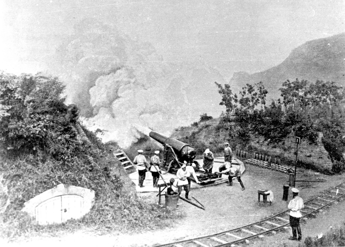Уступную батарею тоже собирались ликвидировать, но пушки её оставили на месте. Кстати, рядом с местом, где располагалась Уступная, одно время стоял маяк. Если посмотреть на карту 1907 года, то как раз над мысом Ларионова и обозначено его положение. Новая же батарея на вершине получила уже более современные орудия – 6-дюймовые пушки Канэ, которые простояли там долгое время до известных всем бурных событий в истории нашей страны.