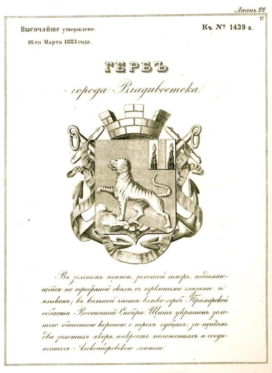 На основе рисунка Юлия Рего петербургские геральдисты создали соответствующее законам гербоведения описание, а также изображение. И 28 марта (16 марта по старому стилю) 1883 года император Александр III утвердил герб города Владивостока: «В зелёном щите золотой тигр, подымающийся по серебряной скале, с червлёными глазами и языком, в вольной части влево – герб Приморской области Восточной Сибири. Щит украшен золотою башенною короною о трёх зубцах, за щитом два золотых якоря, накрест положенных и соединённых Александровской лентой».