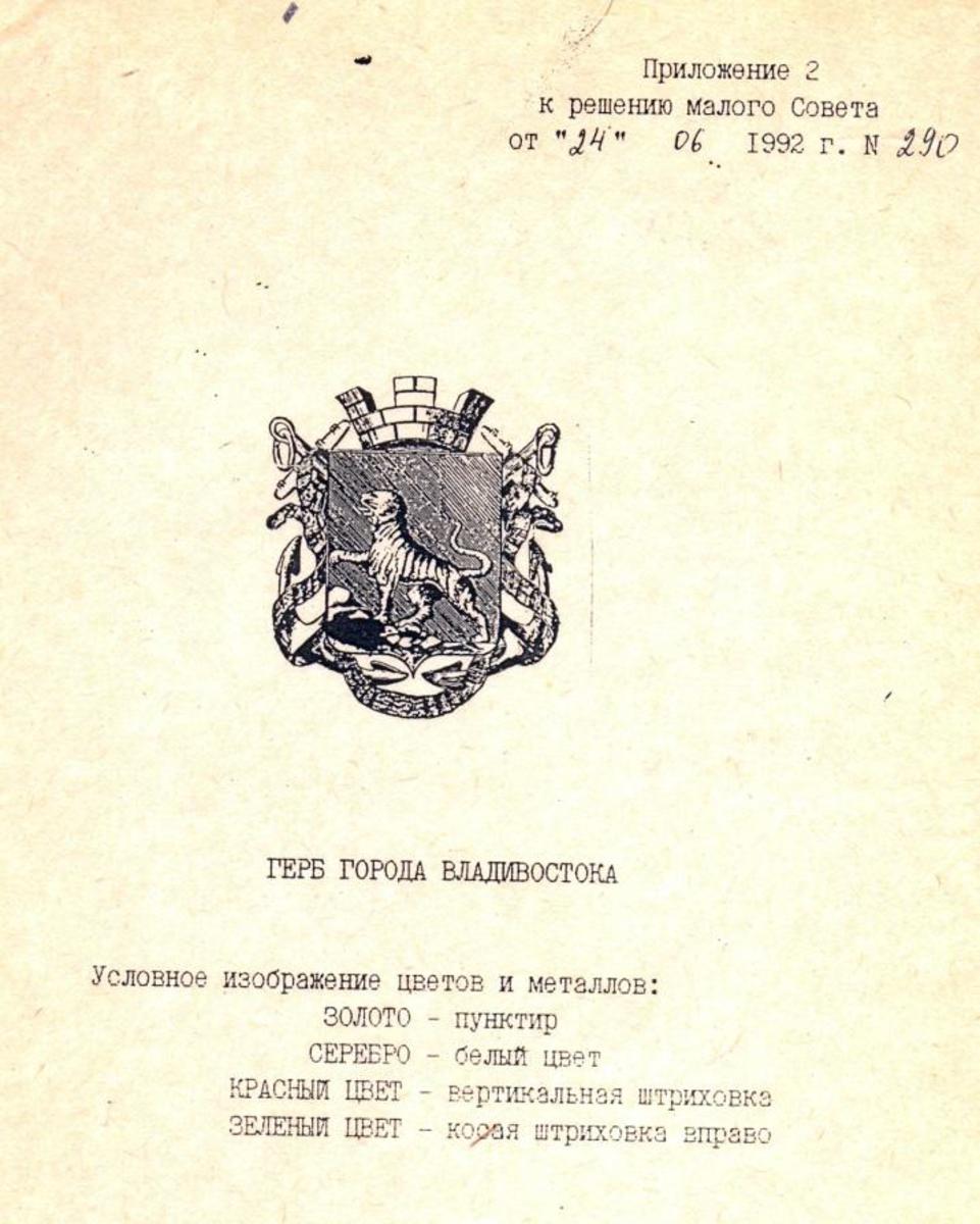 После распада СССР в документооборот стали возвращаться официальные символы местной власти. 24 июня 1992 года решением № 290 Владивостокского городского Совета народных депутатов был восстановлен образец герба, утверждённый Александром III, однако в него было внесено изменение – исключено изображение герба Приморской области, упразднённой ещё в 1922-м.