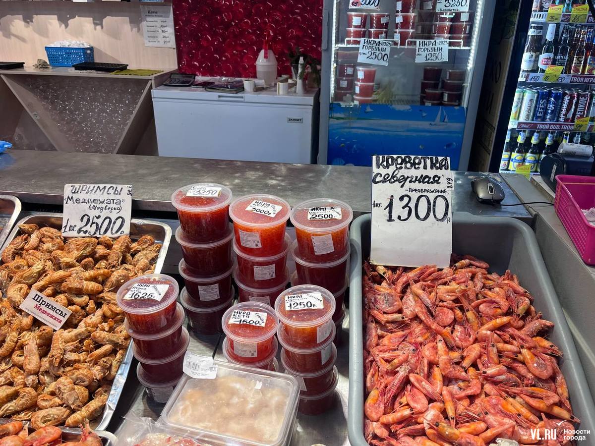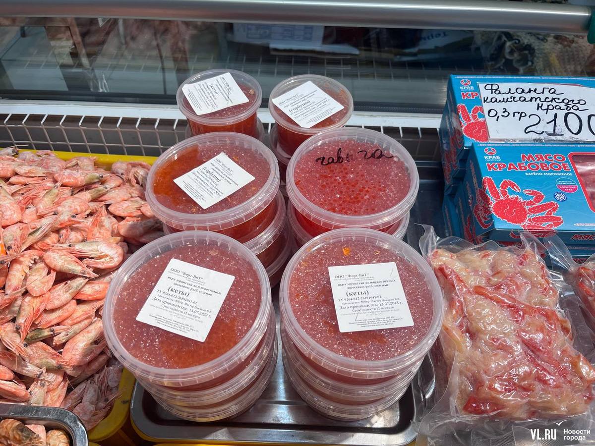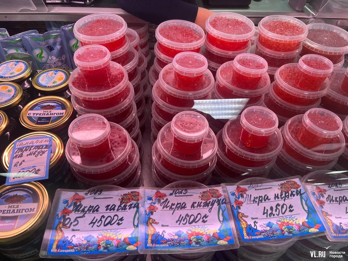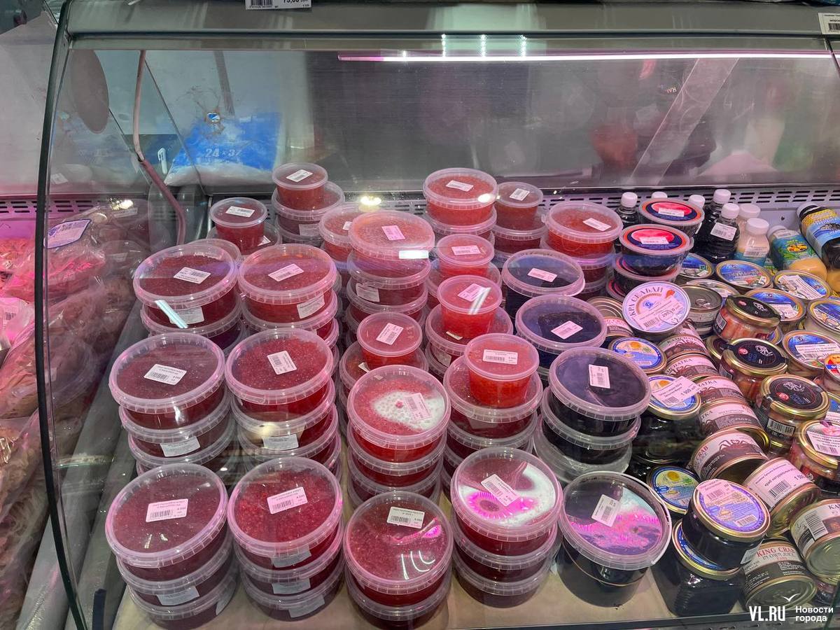 Традиционно самые высокие цены на Первореченском рынке. На прилавках стоят контейнеры по 500, 250 и 125 грамм. В среднем килограмм самой популярной, по словам продавцов, икры горбуши обойдётся в 7500 рублей. Самая дорогая икра кижуча, килограмм стоит около 9000 рублей.