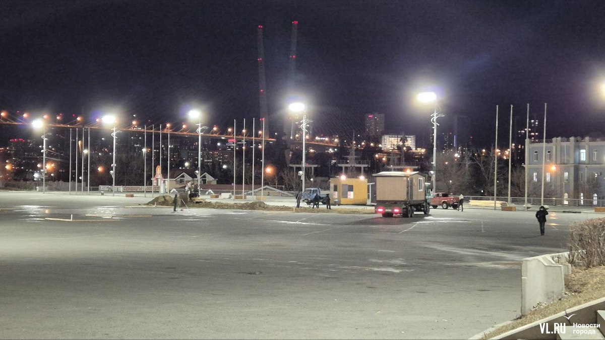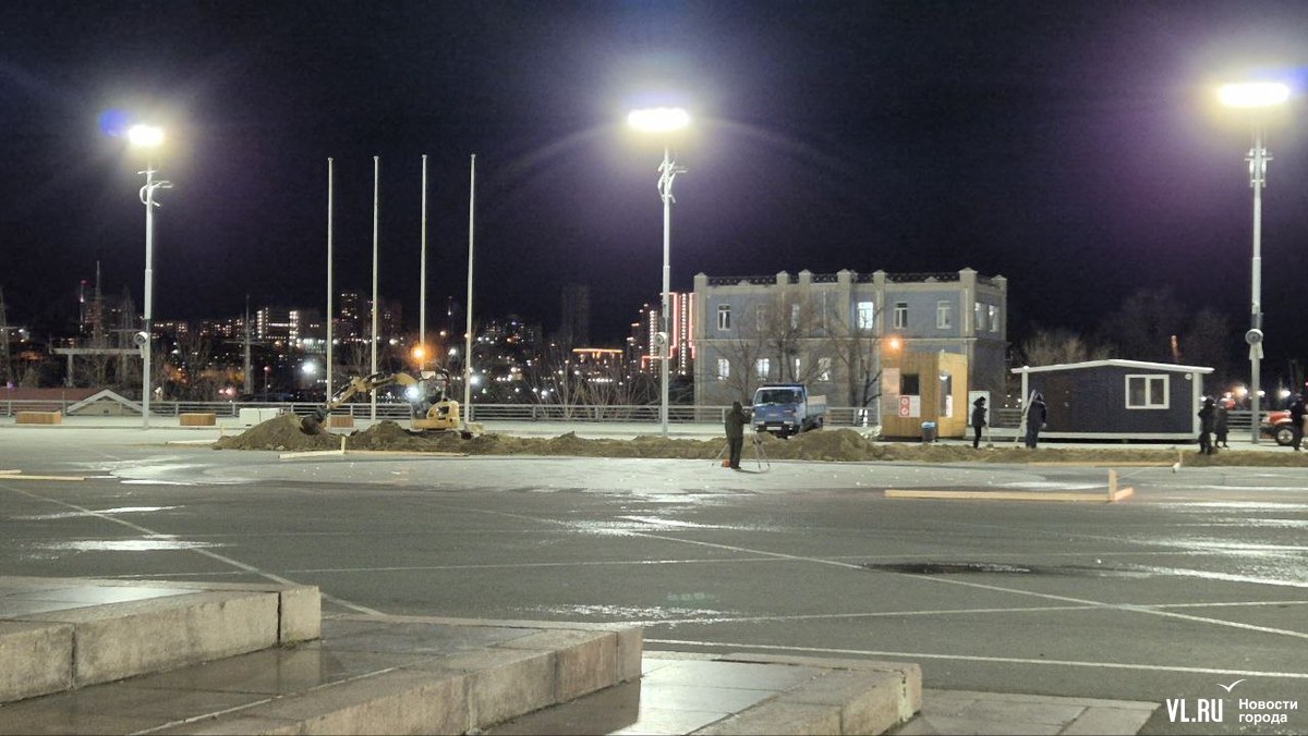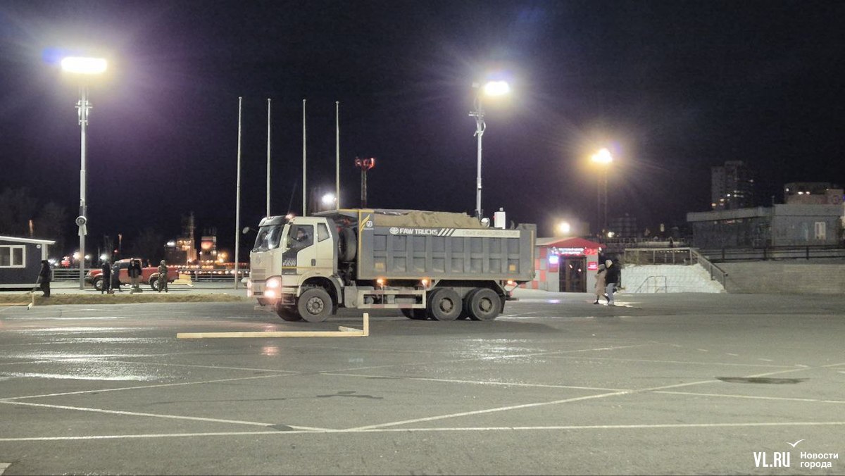 На центральной площади Владивостока начали готовить каток для новогоднего городка. Разметили его будущие границы, завезли бытовки для строителей и уже отгружают песок для заливки льда.