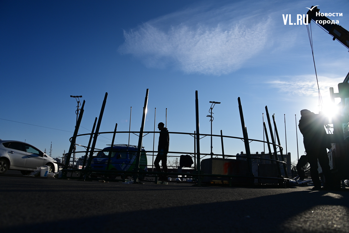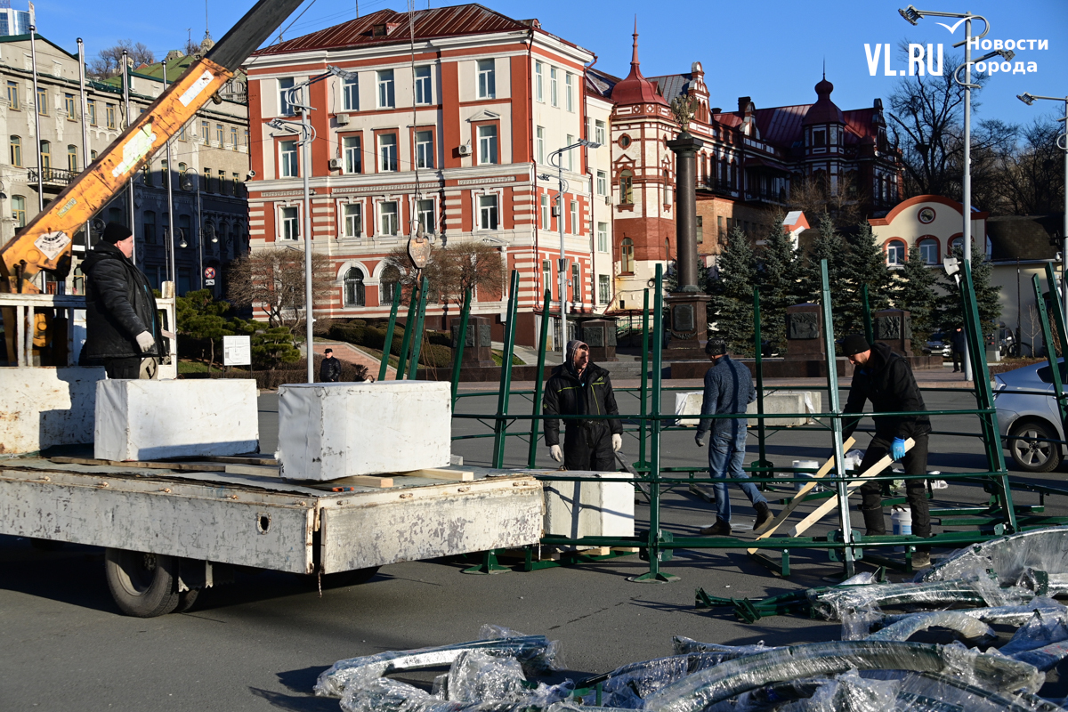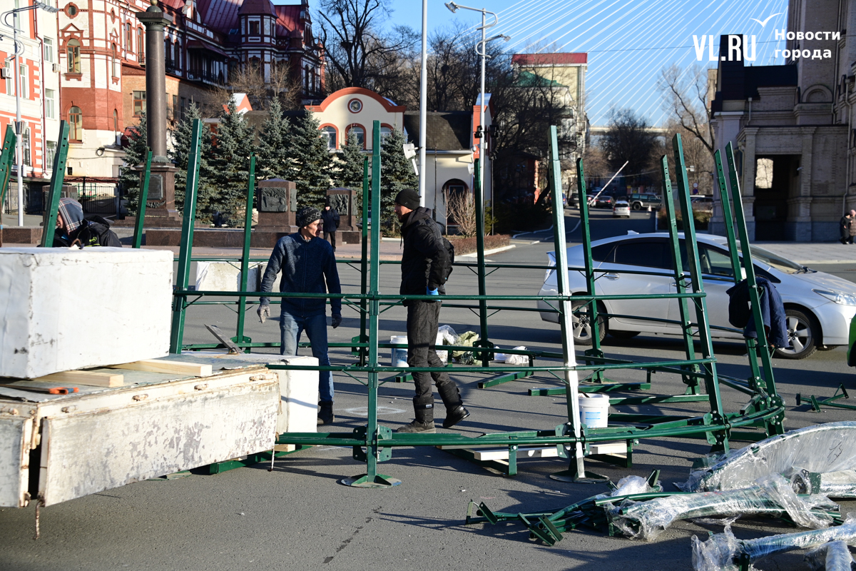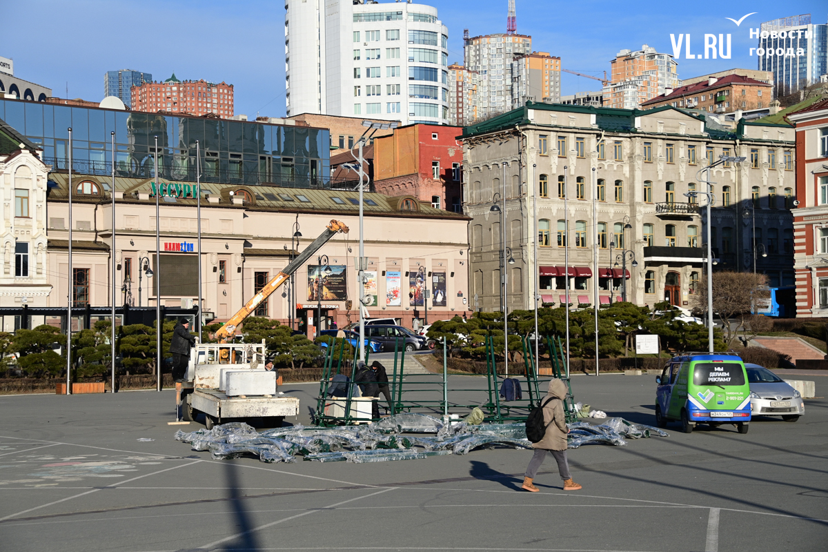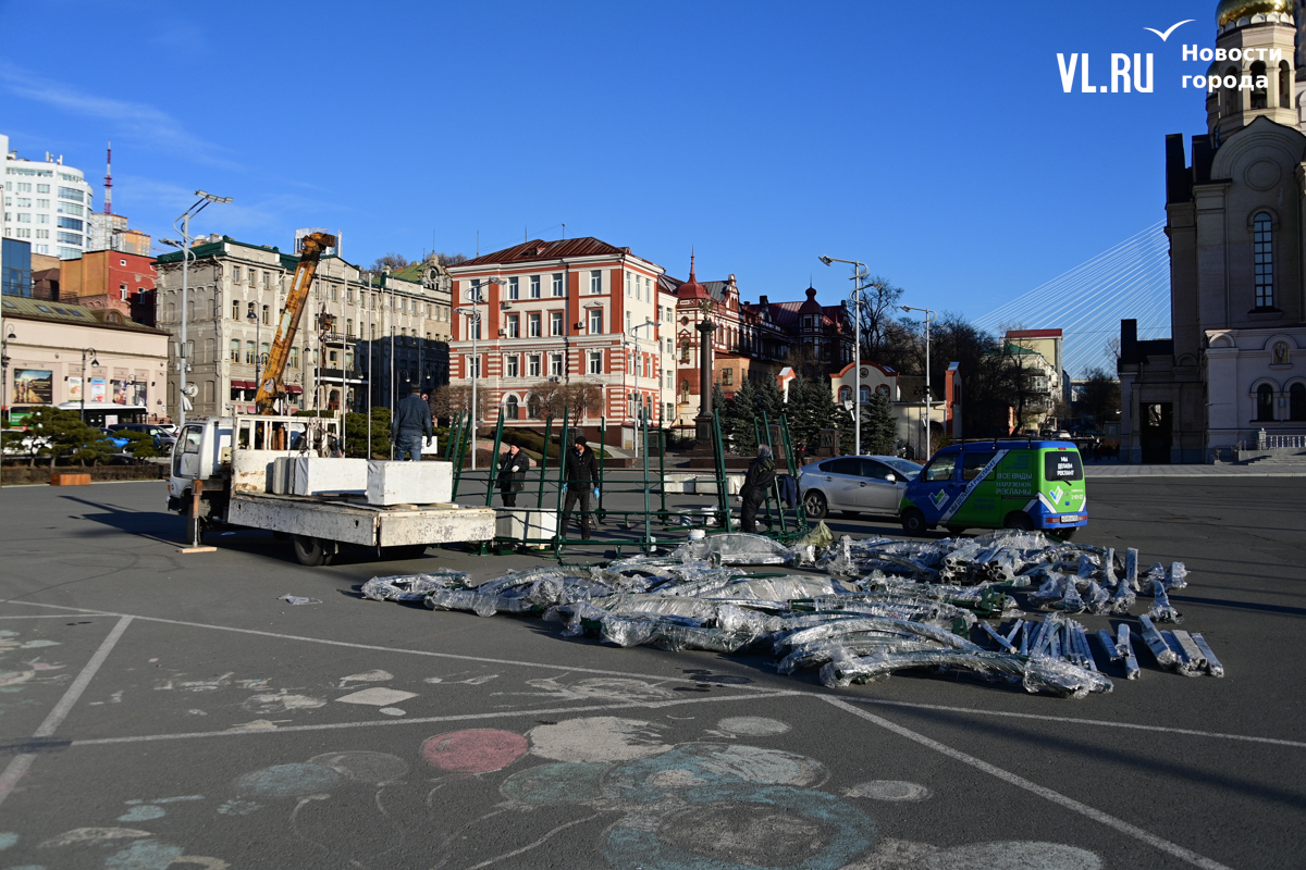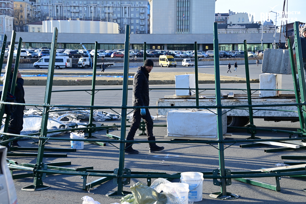 В центре Владивостока начали устанавливать главную новогоднюю ёлку города. Это 20-метровая искусственная новогодняя каркасная световая ель, презентованная в прошлом году Туристским центром Приморского края.