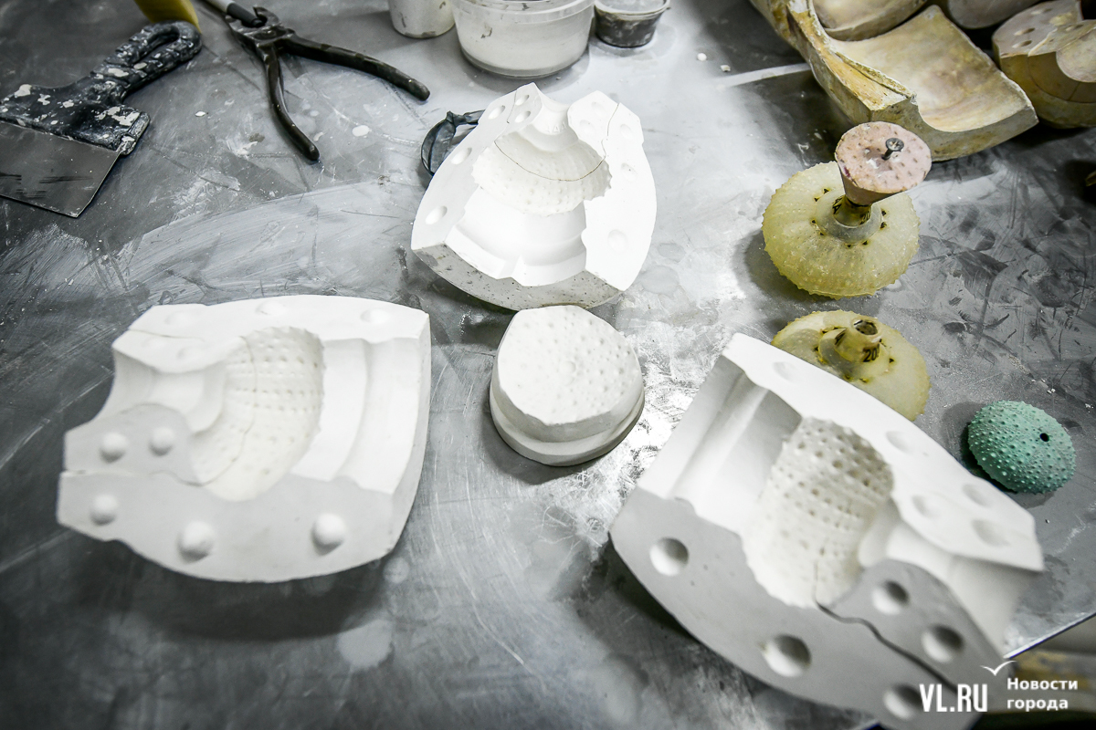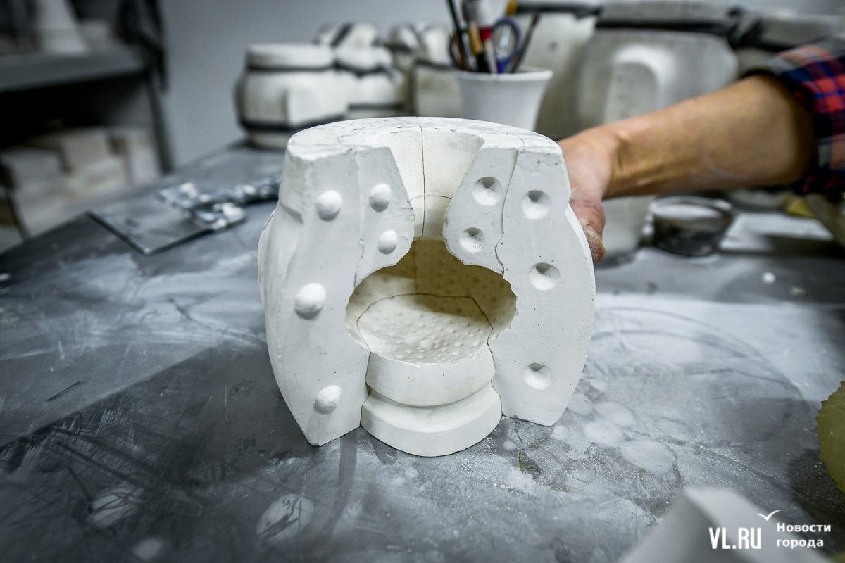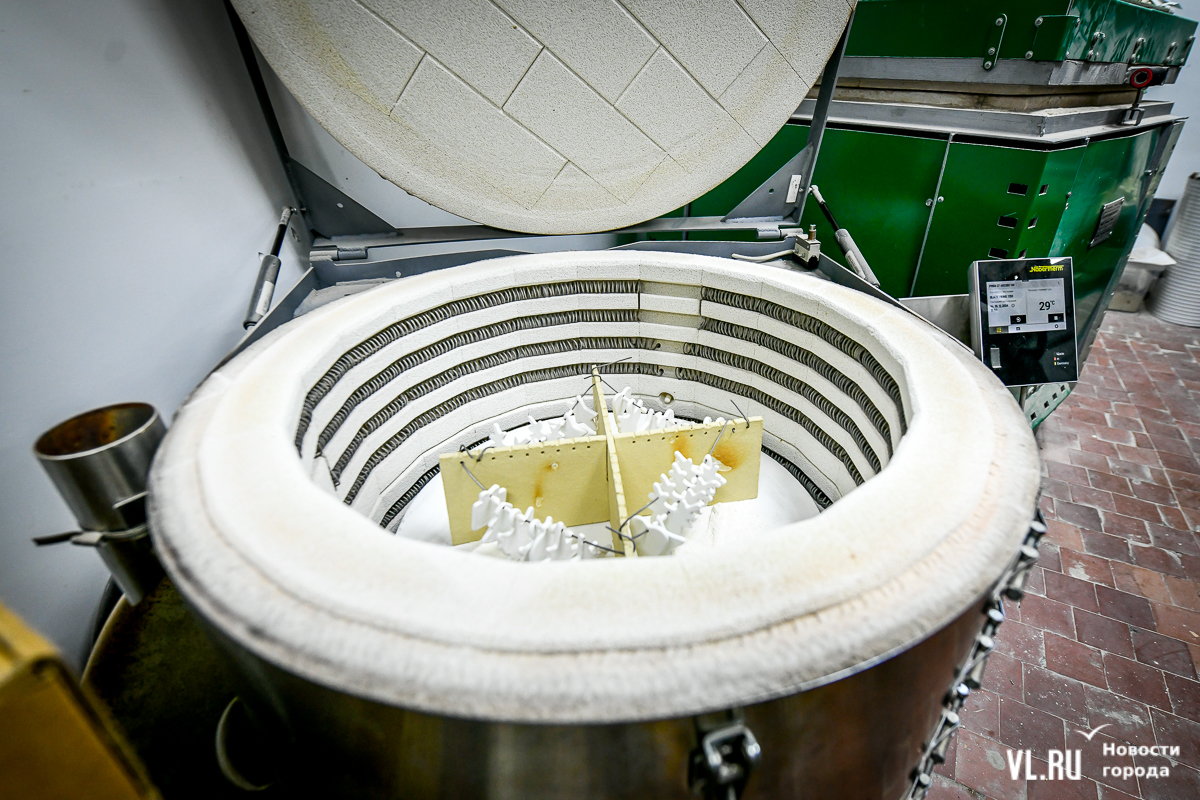 Фотополимерный 3D-принтер тут же, в этой комнате. Он печатает отсканированную модель, а потом с неё сделают черновую форму. Заливают в неё гипс – получается гипсовая модель. А уже с её помощью создают форму для фарфора. В сборе она похожа на бочонок, ещё и опоясана для надёжности. Форма многоразовая, примерно на 30 заливок. Во всём этом процессе много тонкостей и подробностей.