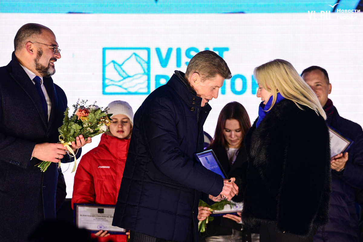 К 19 часам молодых зрителей стало больше. Губернатор края и мэр Владивостока поздравили жителей с наступающими праздниками, пригласили проводить выходные на площади и обязательно прийти на открытие бесплатного катка на стадионе «Авангард», а также наградили молодых людей за активность в проектах Молодёжной столицы.