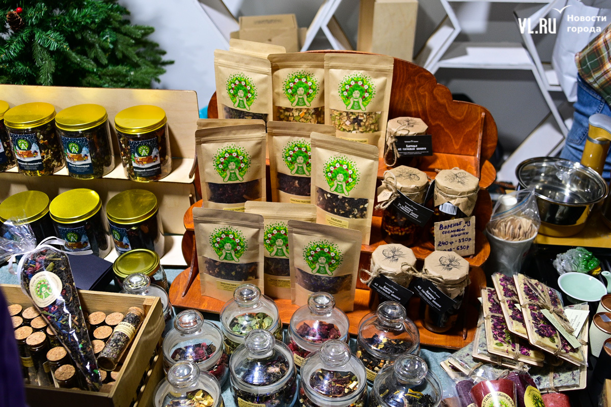 На входе в павильон встречал и угощал чаем Павел из магазина «Чай да травы». Композиции из трав, зелёного и чёрного чая, специй и ягод составляют владивостокские мастера и упаковывают в красивые колбы за 200 рублей, конусы за 300 рублей, пакеты по 100 граммов от 150 до 500 рублей. Среди «пуншей», иммунных и восточных сборов продают и чай с приморским настроением – «Земля леопарда».