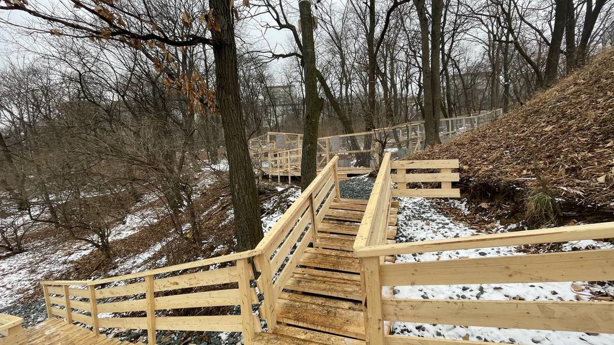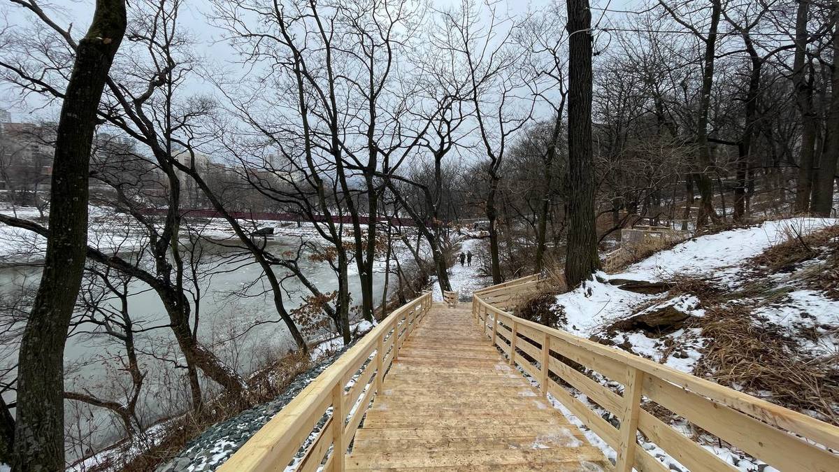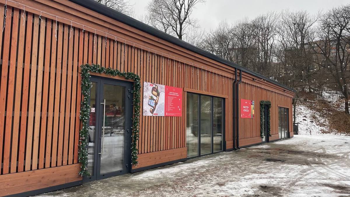 На выходных новогодний городок будет работать с 10:00, а в 12:00 должны прийти Дед Мороз со Снегурочной. Зайти в парк можно со стороны верхнего озера, от остановки «Поликлиника». Центр парка (где играли в шахматы и установлен памятный камень) сейчас закрыт, там идёт стройка. Поэтому тем, кто идёт от Карской, нужно будет повернуть в проход между верхним и средним озёрами. Для пешеходов там построены деревянные лестницы и настилы.