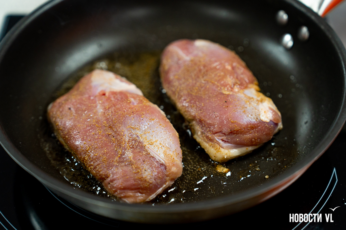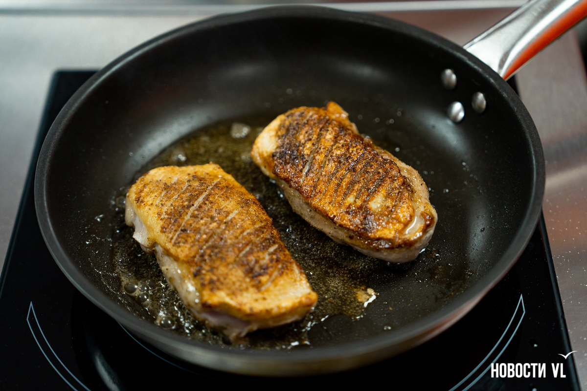 Оливье и селёдка под шубой – хорошо знакомые блюда и практически мастхэв любого новогоднего стола. Но это не значит, что пробовать что-то новое и хотеть разнообразить своё меню запрещено. Добавить вкуса празднику Роман Котовский предложил с помощью утиного филе с грушей и кофейно-брусничным соусом. Новых для владивостокцев ингредиентов здесь нет. Например, мясо утки приморцы знают из китайской культуры, а брусника растёт, в том числе, и на берегах нашего региона. Тем не менее вкус отличается своей яркостью и приятным сладким ароматом, а после сборки внешним видом перегонит любой майонезный салат.