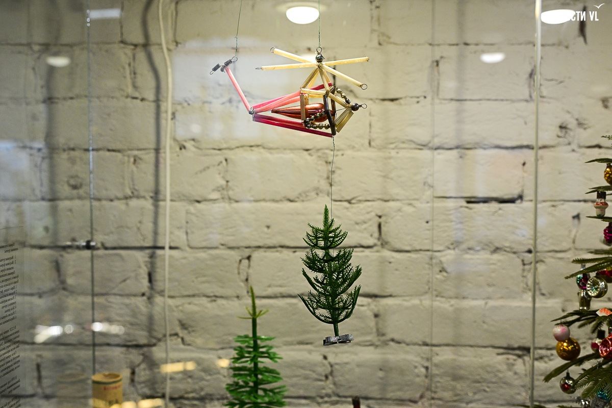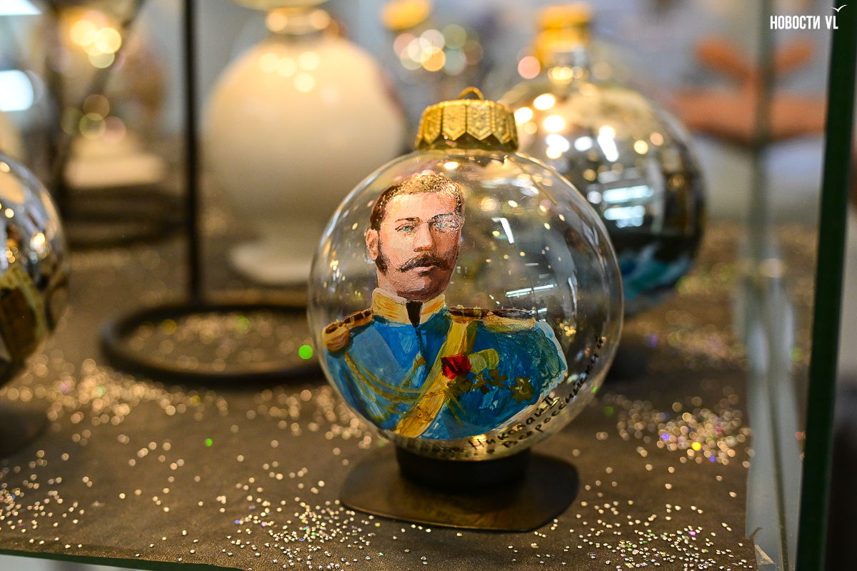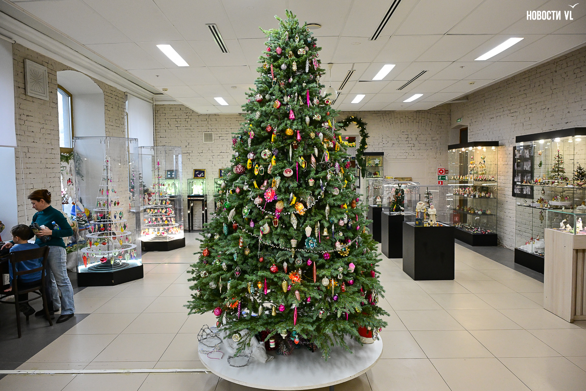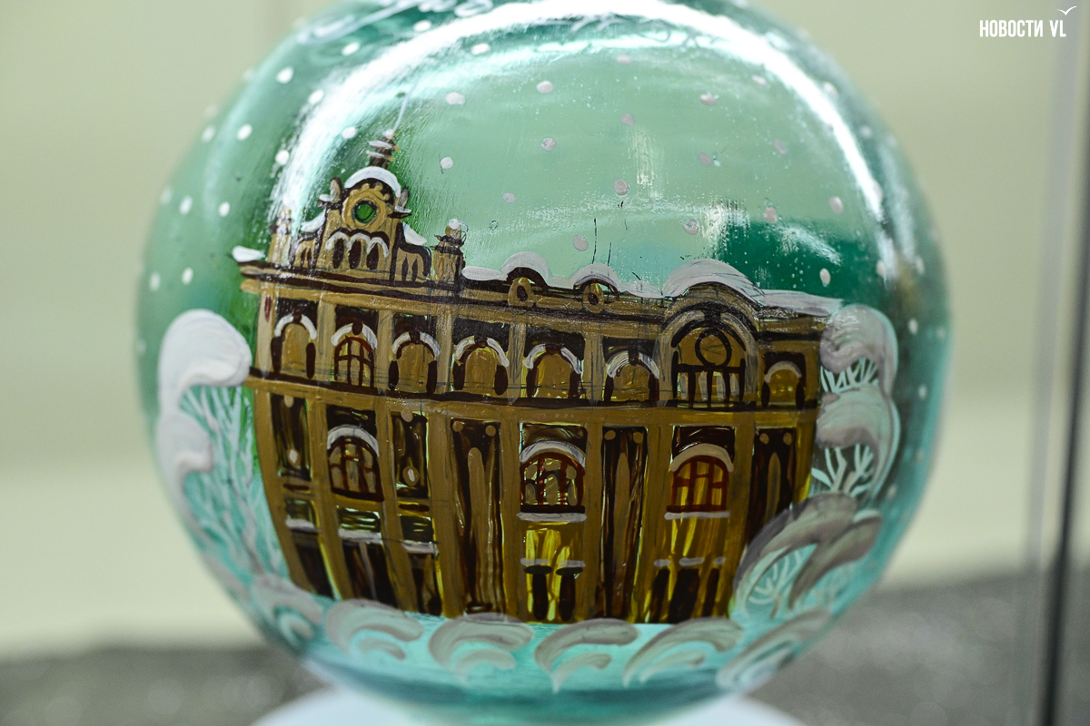 В центре первого зала встала высоченная ёлка, украшенная бусами, большими разноцветными шишками, мишками, часами и гирляндой с фонариками, сияющими тёплыми оттенками жёлтого, красного и синего. Слева от неё – экспозиция проекта «Сферы искусства» с шарами, расписанными известными приморскими художниками. Сам проект реализовывали совместно с музеем ёлочной игрушки «Новый год круглый год» и силами самой Ирины Кейчиной.