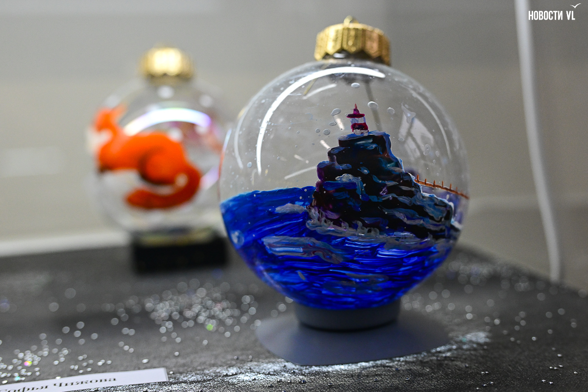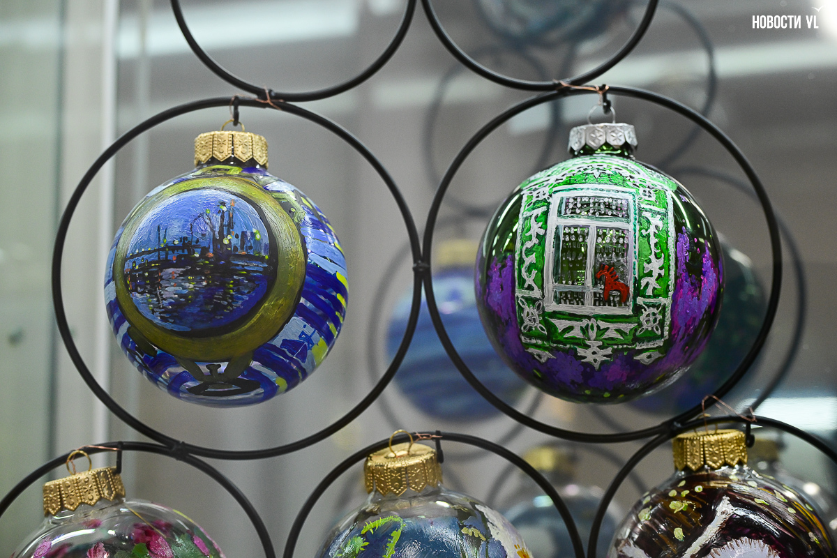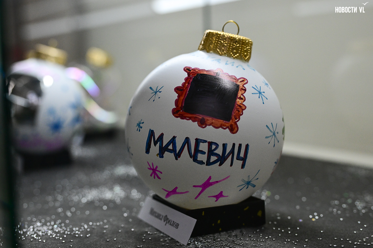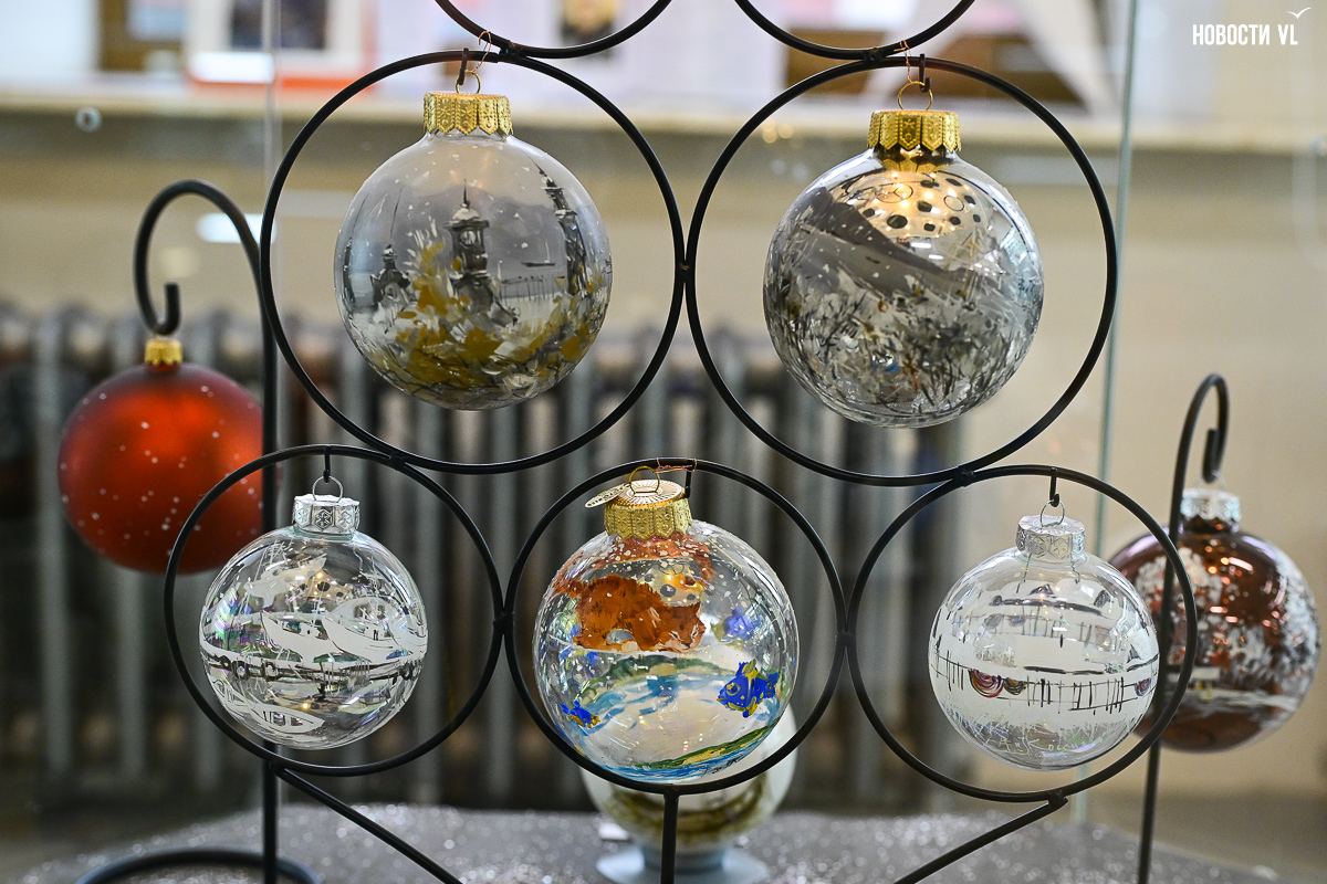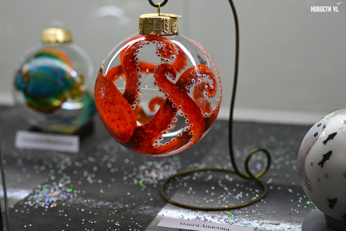 Почти все художники расписали не один, а сразу несколько шаров, каждая «серия» явно отличается от той, что стоит по соседству. Шары Светланы Мироновой двусторонние – с дневным и ночным Владивостоком. Михаил Фролов продемонстрировал свой авторский взгляд на супрематизм – поместил «Чёрный квадрат» Малевича на белый фон и окружил голубыми звёздами, у Елены Гуляевой, наоборот, шары не закрашены, остаются прозрачными, и на этом хрупком стекле – такие же полупрозрачные проулки Владивостока и железнодорожный вокзал. На ярко-оранжевых шарах Владимира Погребняка – примитивные фигуры, вызывающие ассоциации с чем-то из детства. Самая любимая гостями выставки игрушка – оранжевый осьминог, щупальцами захватывающий ёлочный шар от Ольги Апасовой.