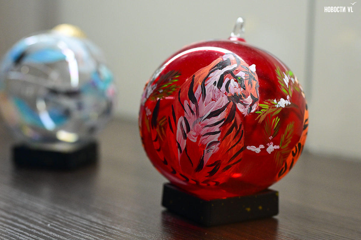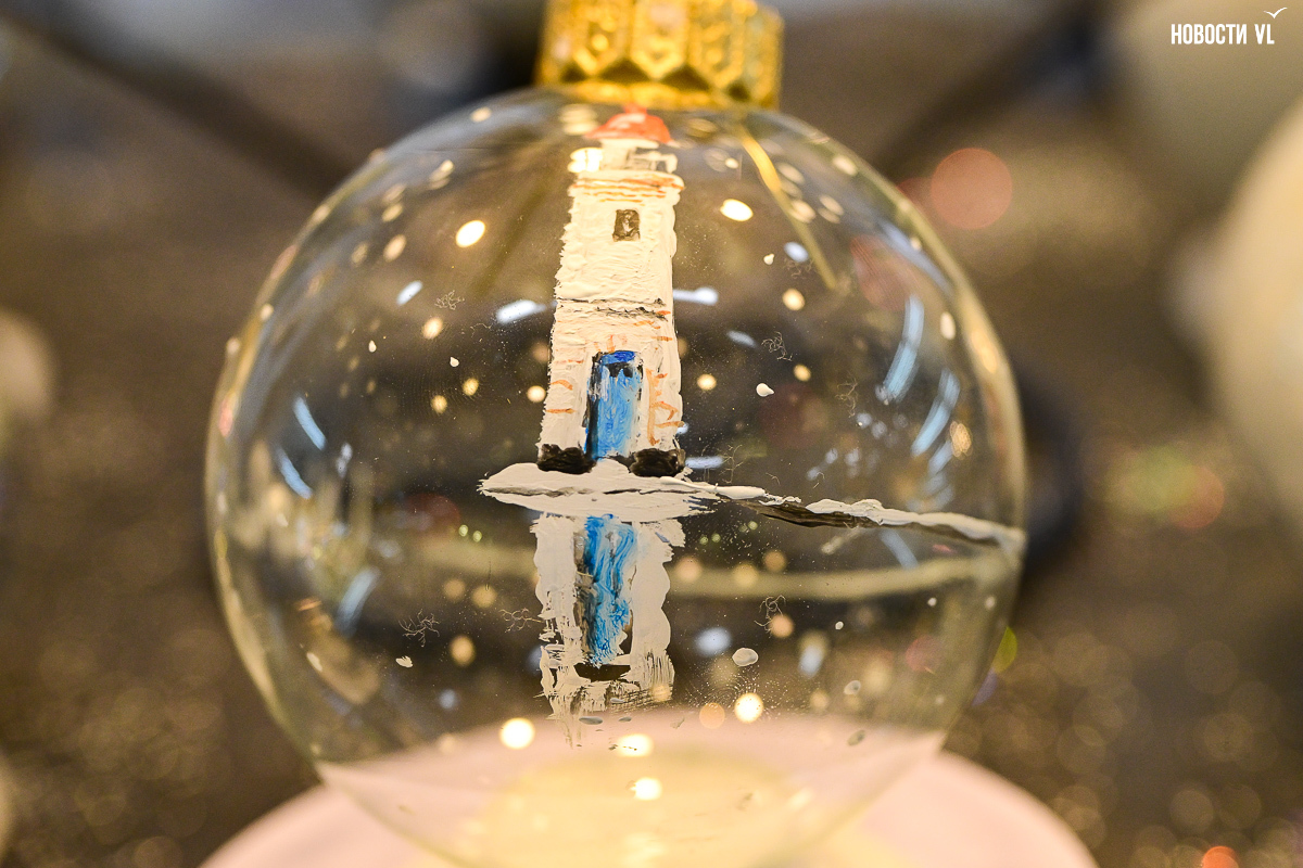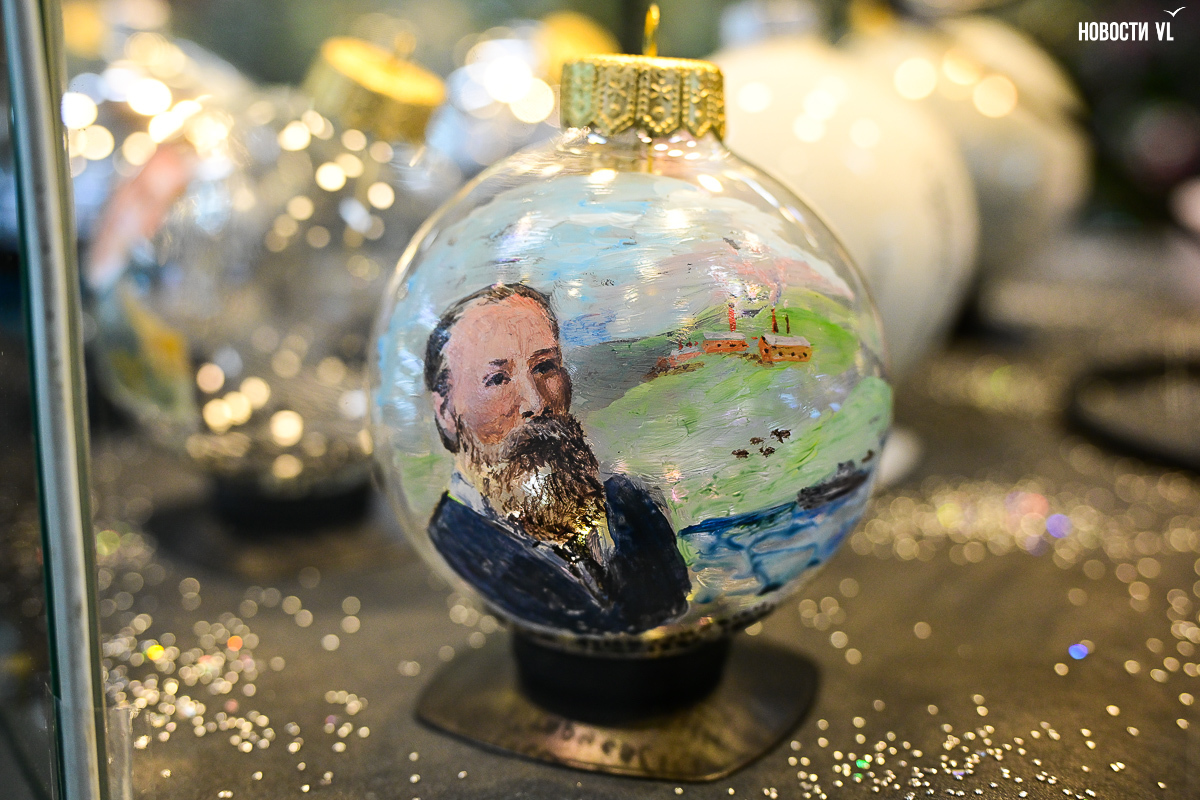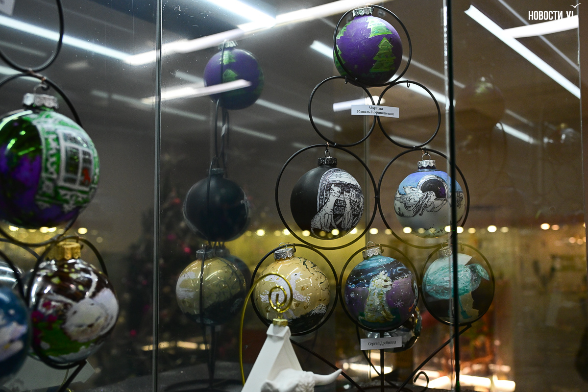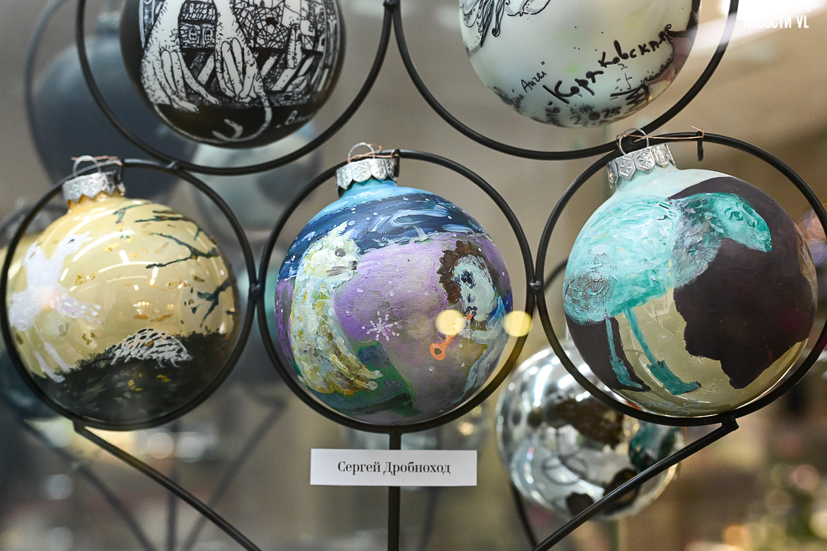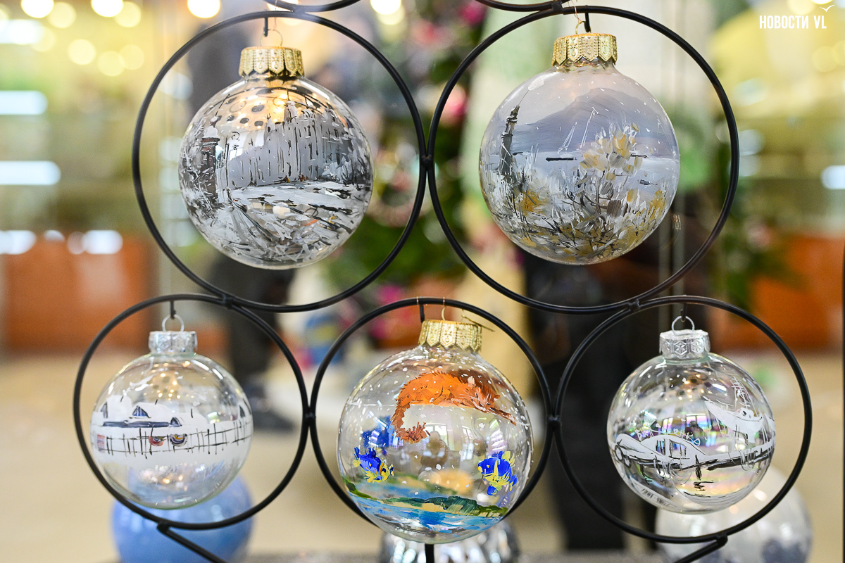 Почти все художники расписали не один, а сразу несколько шаров, каждая «серия» явно отличается от той, что стоит по соседству. Шары Светланы Мироновой двусторонние – с дневным и ночным Владивостоком. Михаил Фролов продемонстрировал свой авторский взгляд на супрематизм – поместил «Чёрный квадрат» Малевича на белый фон и окружил голубыми звёздами, у Елены Гуляевой, наоборот, шары не закрашены, остаются прозрачными, и на этом хрупком стекле – такие же полупрозрачные проулки Владивостока и железнодорожный вокзал. На ярко-оранжевых шарах Владимира Погребняка – примитивные фигуры, вызывающие ассоциации с чем-то из детства. Самая любимая гостями выставки игрушка – оранжевый осьминог, щупальцами захватывающий ёлочный шар от Ольги Апасовой.