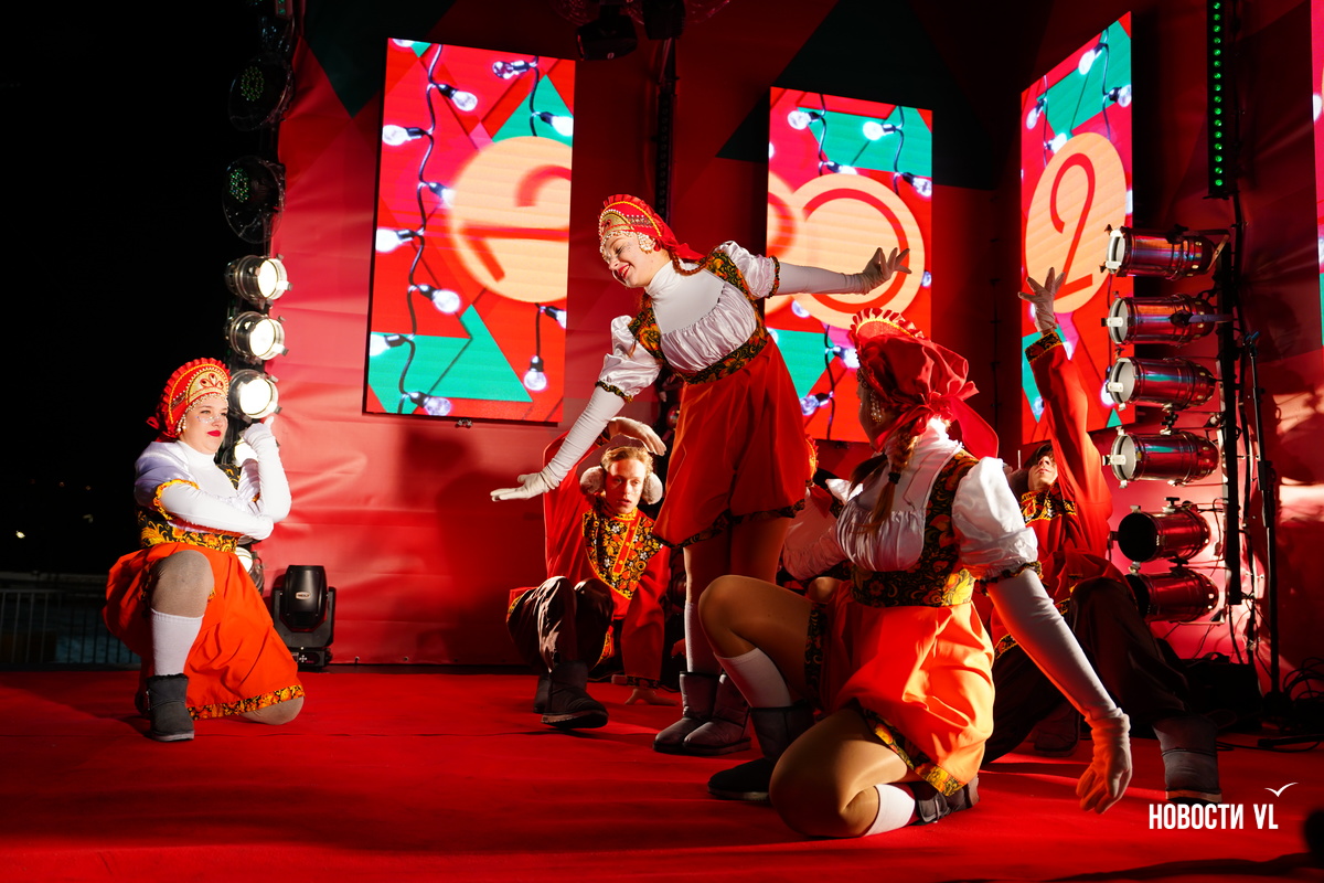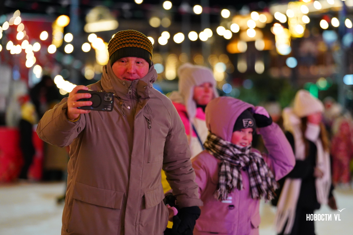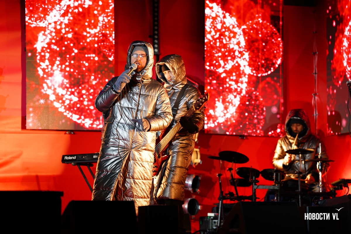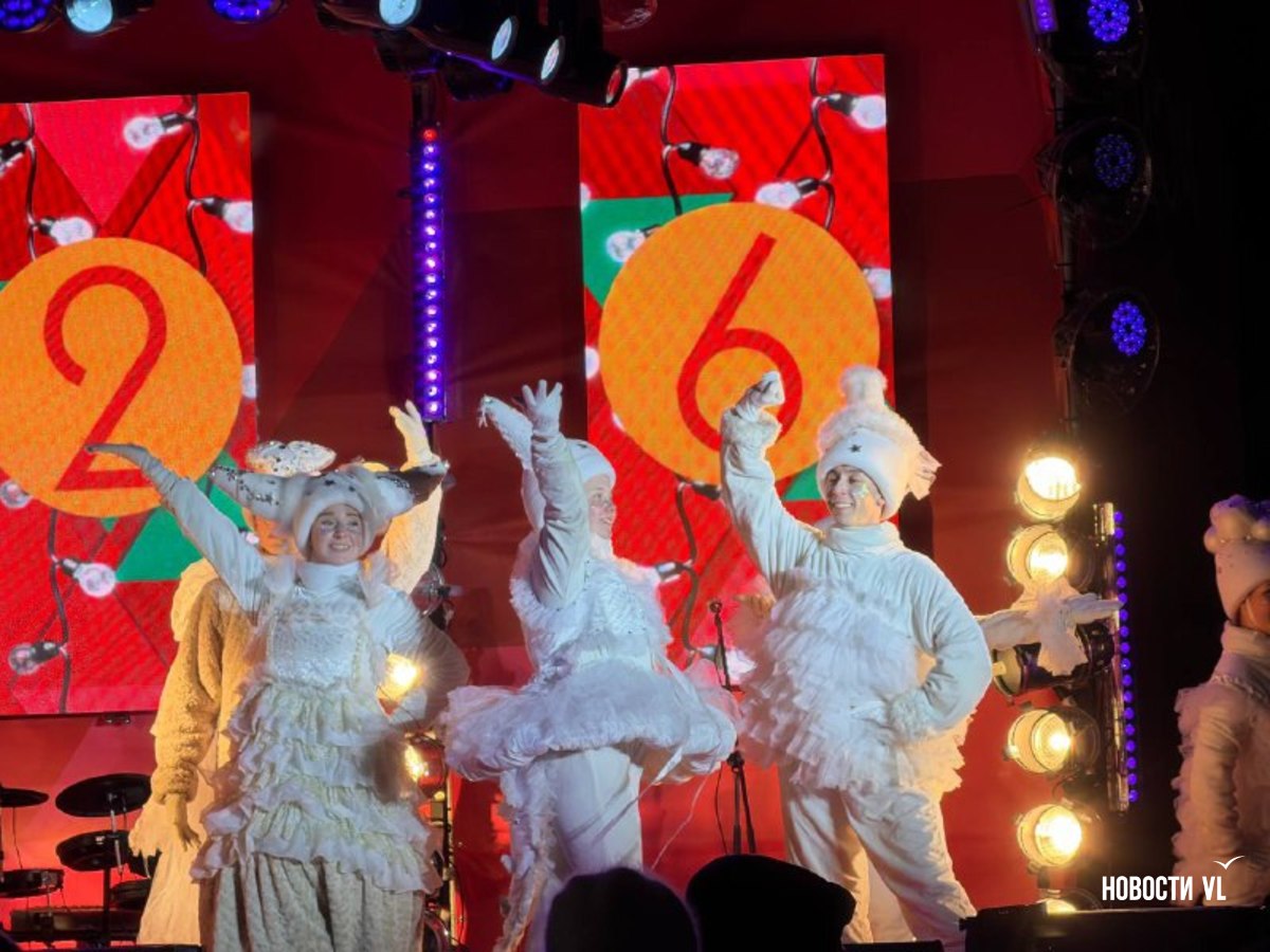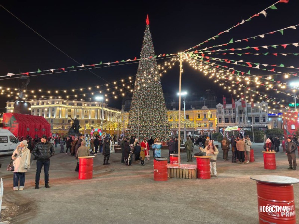 На центральной площади Владивостока горожане и гости города провожают 2025 год и встречают новый, 2026-й. Людей пока мало, но с каждой минутой их становится всё больше. В основном собираются возле главной сцены, где сейчас выступают творческие коллективы, поют новогодние песни о зиме и главном зимнем празднике.