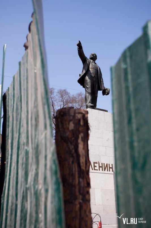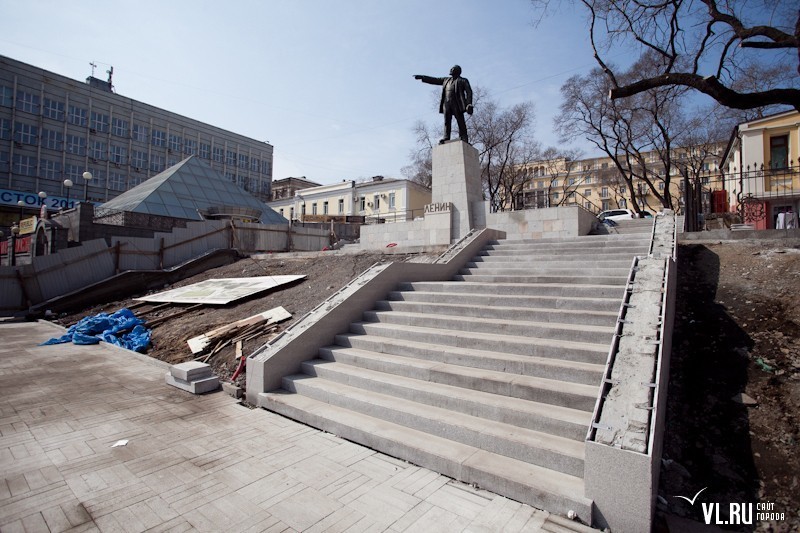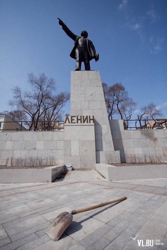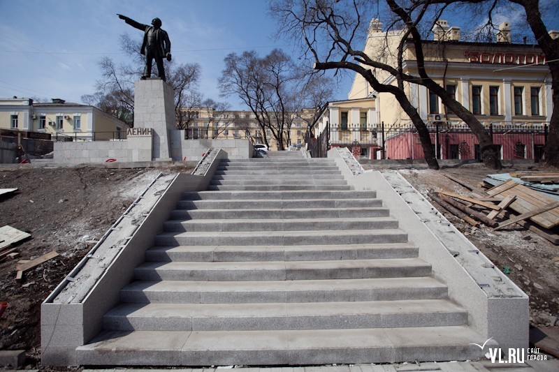 Еще осенью здесь были проведены земляные работы и планировка территории, проложены сети для новых энергосберегающих фонарей, частично смонтированы ступени. При помощи специальных моющих средств со скульптуры вождя удалены загрязнения, следы окисления, возвращен естественный бронзовый блеск, устранены сколы и трещины.