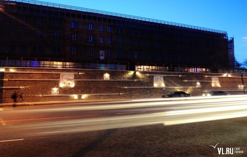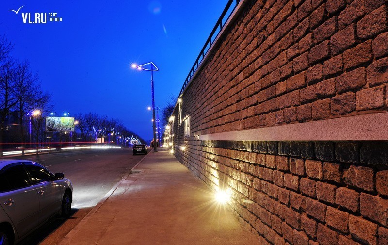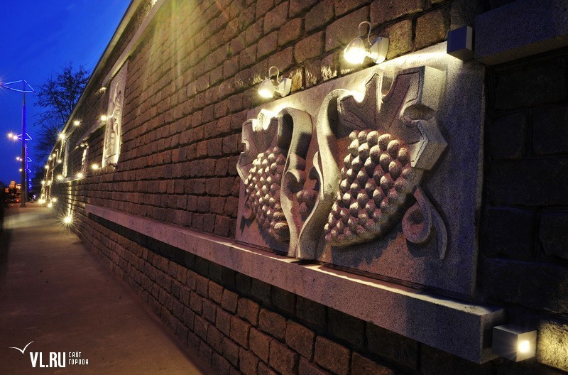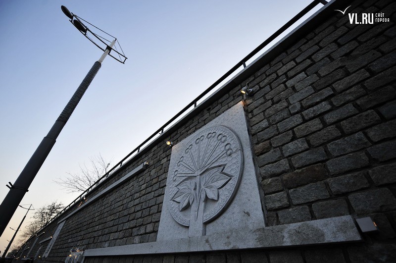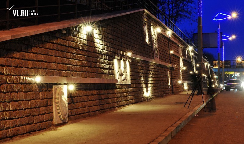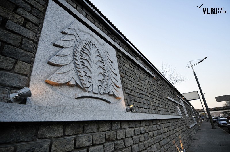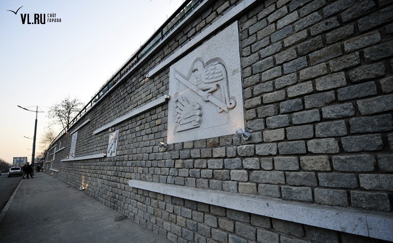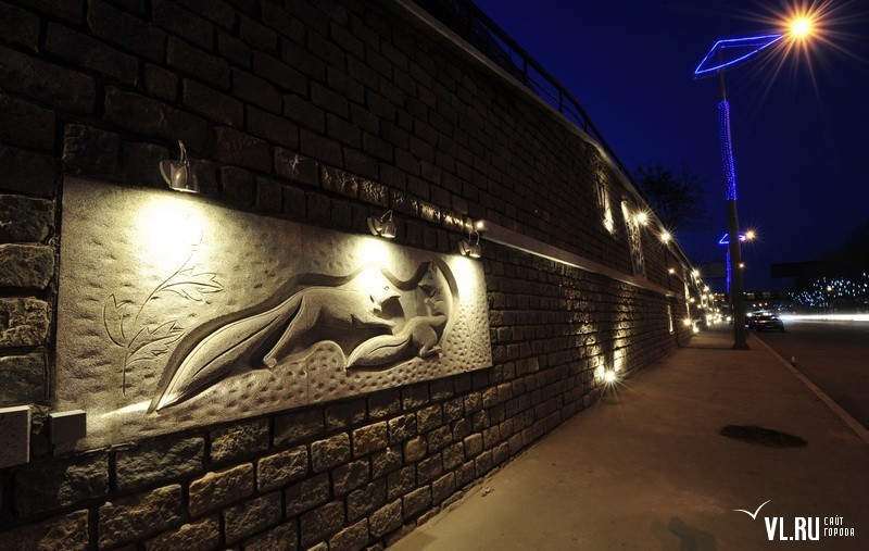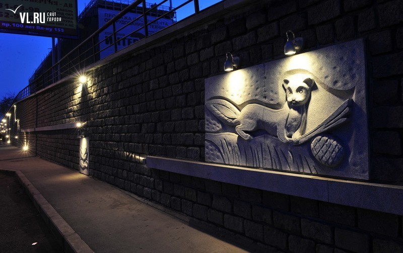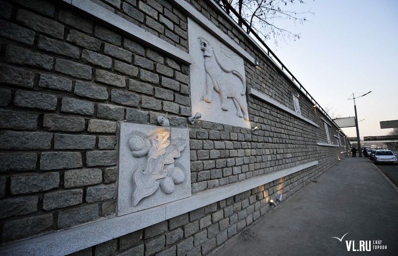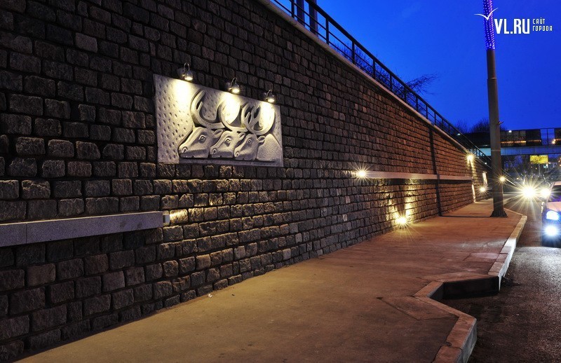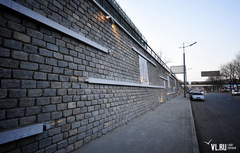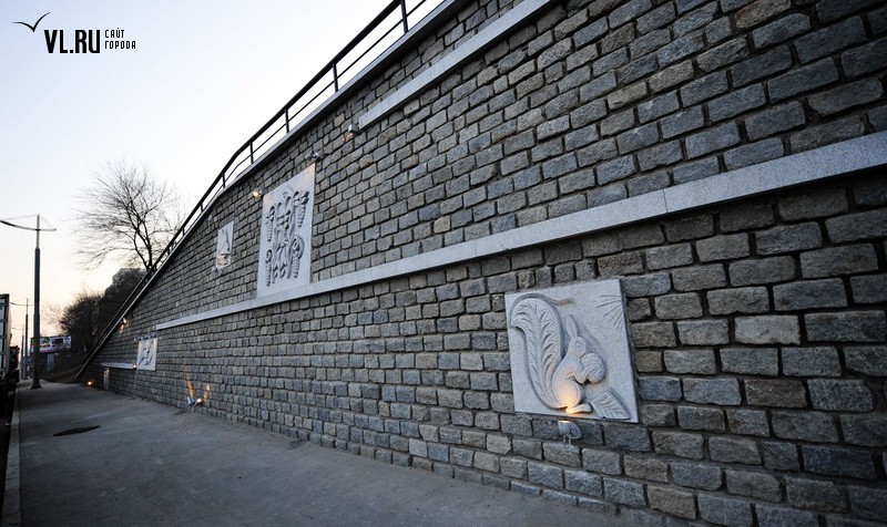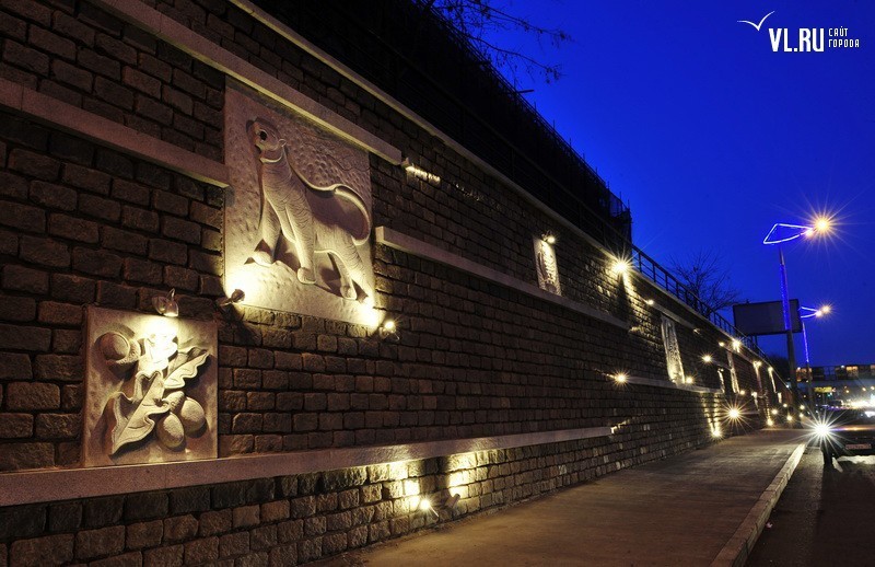Реконструкция подпорной стены в районе ост. "Фабрика "Заря" и "Магнитогорской" завершена. Строители укрепили верхний край стены гранитной плиткой, обновили систему водоотведения, установили новые барельефы с изображением животного и растительного мира Приморья, сделали подсветку, для которой используется энергосберегающее оборудование.