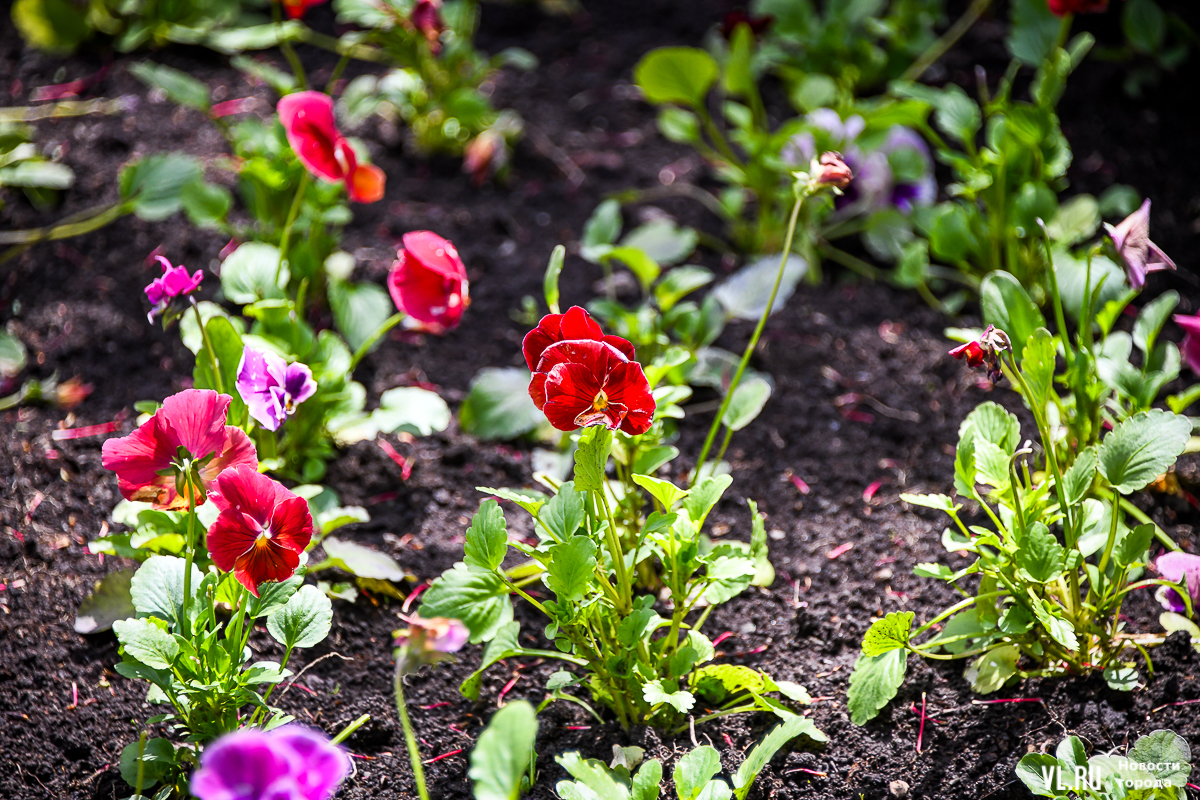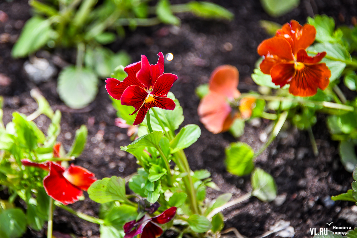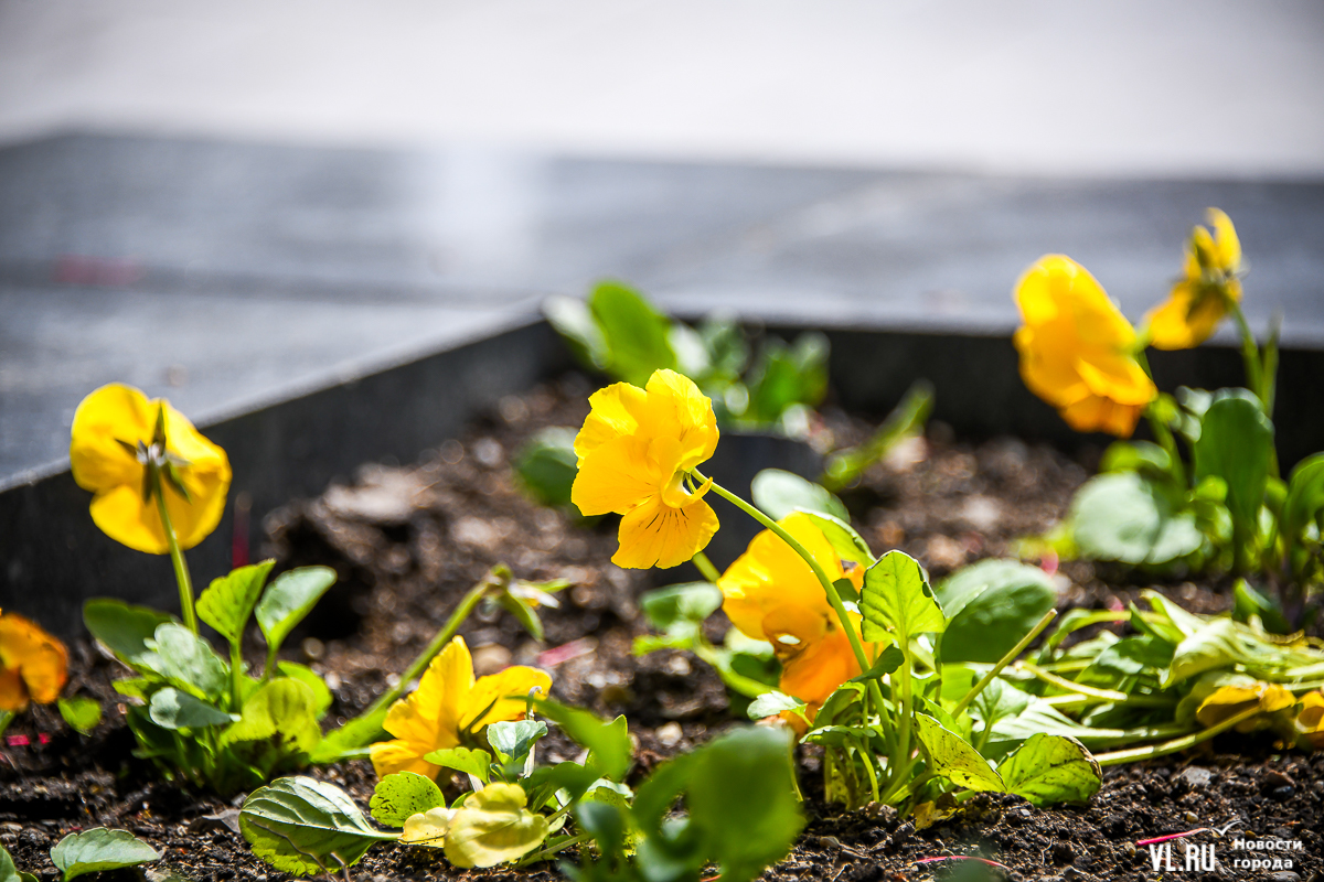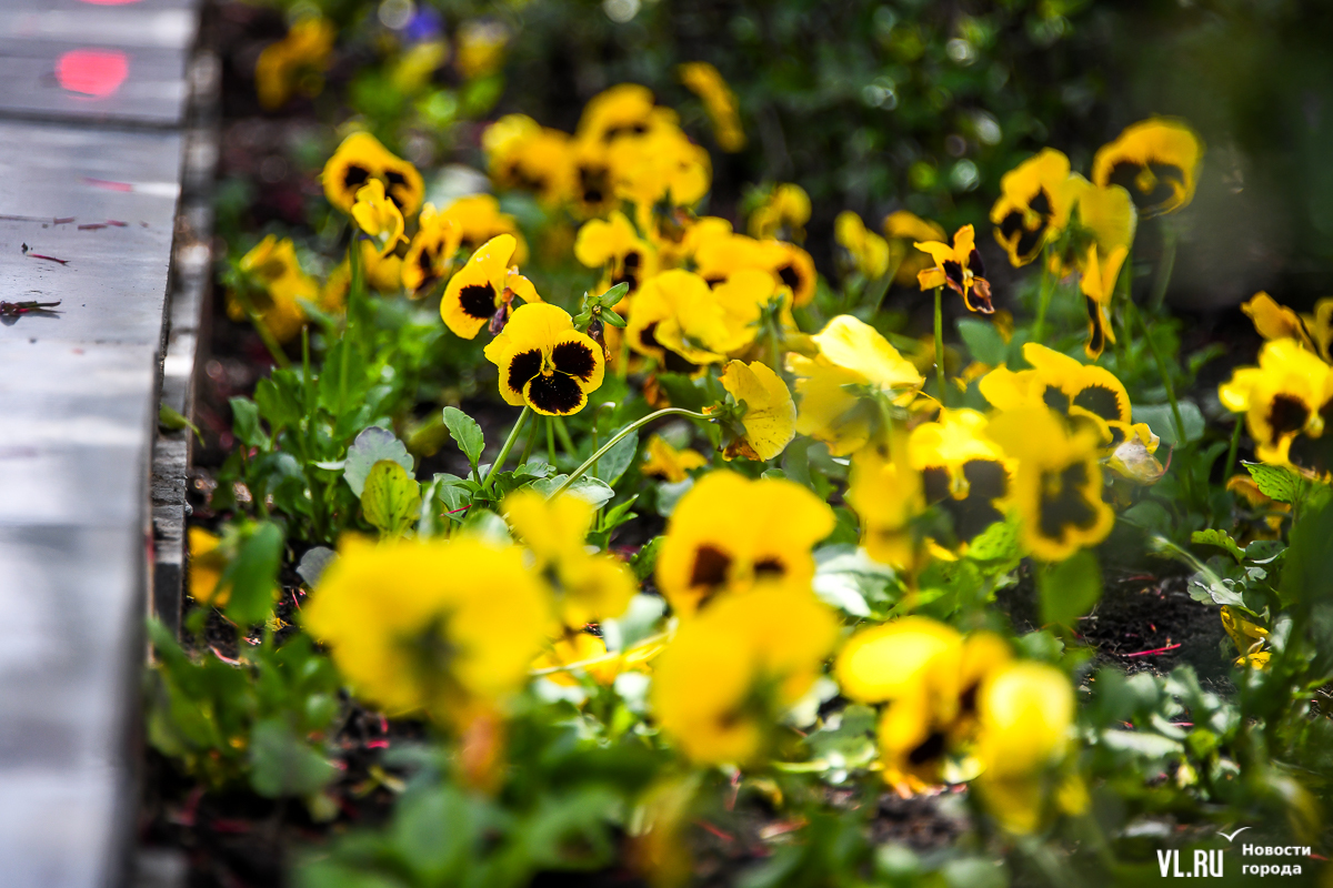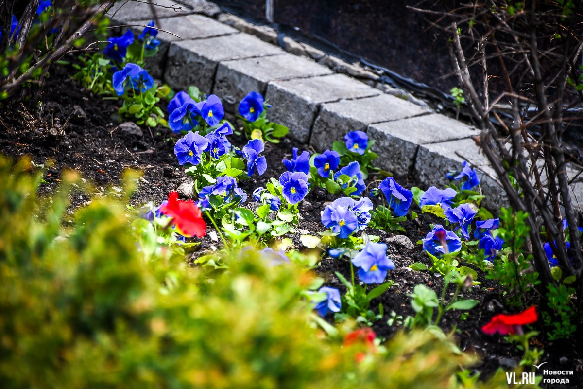 В центре Владивостока зацвели фиалки, петунии и львиный зев. Их высадили на клумбах около памятника Борцам за власть Советов, на улицах Адмирала Фокина и Светланской. А около погрануправления сейчас цветут красные тюльпаны.