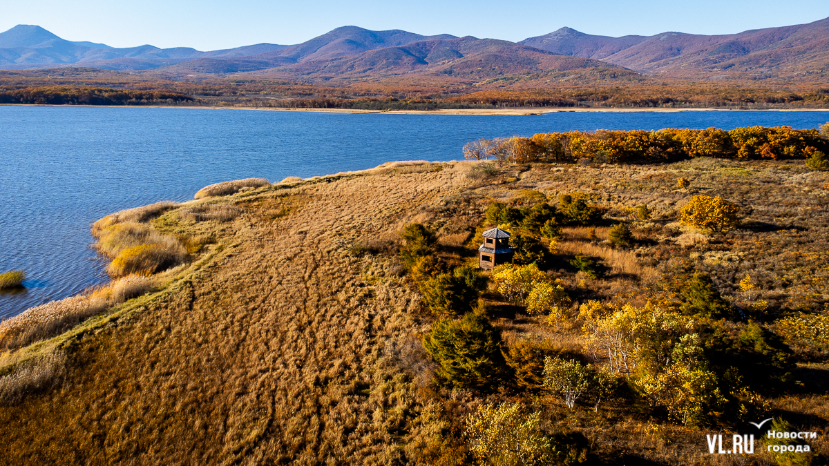 Третий маршрут Сихотэ-Алинского заповедника, который нам удалось посетить, – «Озеро Благодатное». Здесь среди деревьев и камышей то и дело встречаются скрадки и наблюдательные вышки, благодаря которым учёные наблюдают за птицами, а фотографы делают редкие снимки. Эти постройки скрываются среди сухой озёрной растительности и становятся менее заметны в осенний период. Так как озеро находится практически на морском побережье, деревья здесь также однообразны по цвету и в основном уже приняли жёлтый и золотистый окрас.