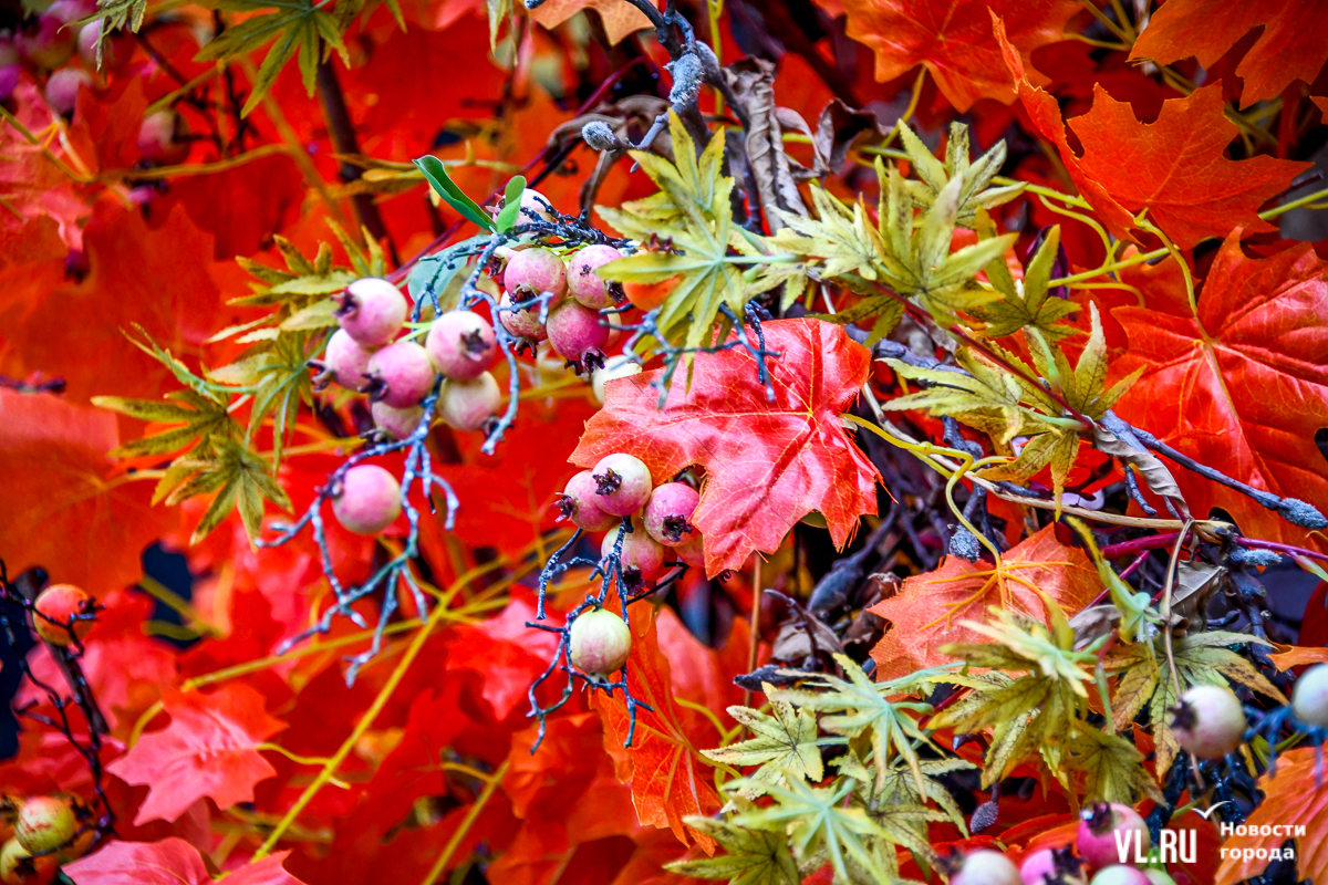 На пешеходной части улицы Фокина, владивостокском «Арбате», бар Bricks украсил свой фасад ветками красных клёнов, а бар «Виновники» – вездесущие костры рябин. Ресторан «Дело в мясе» добавил к тыквам осенней листвы.
