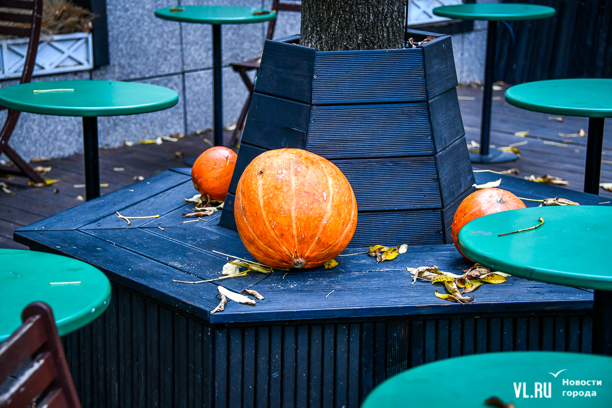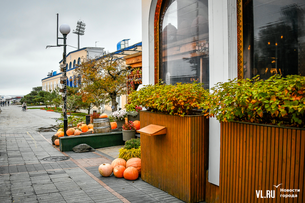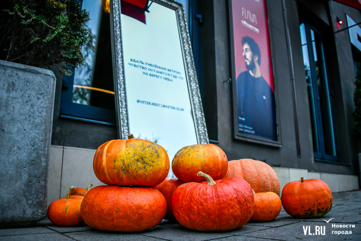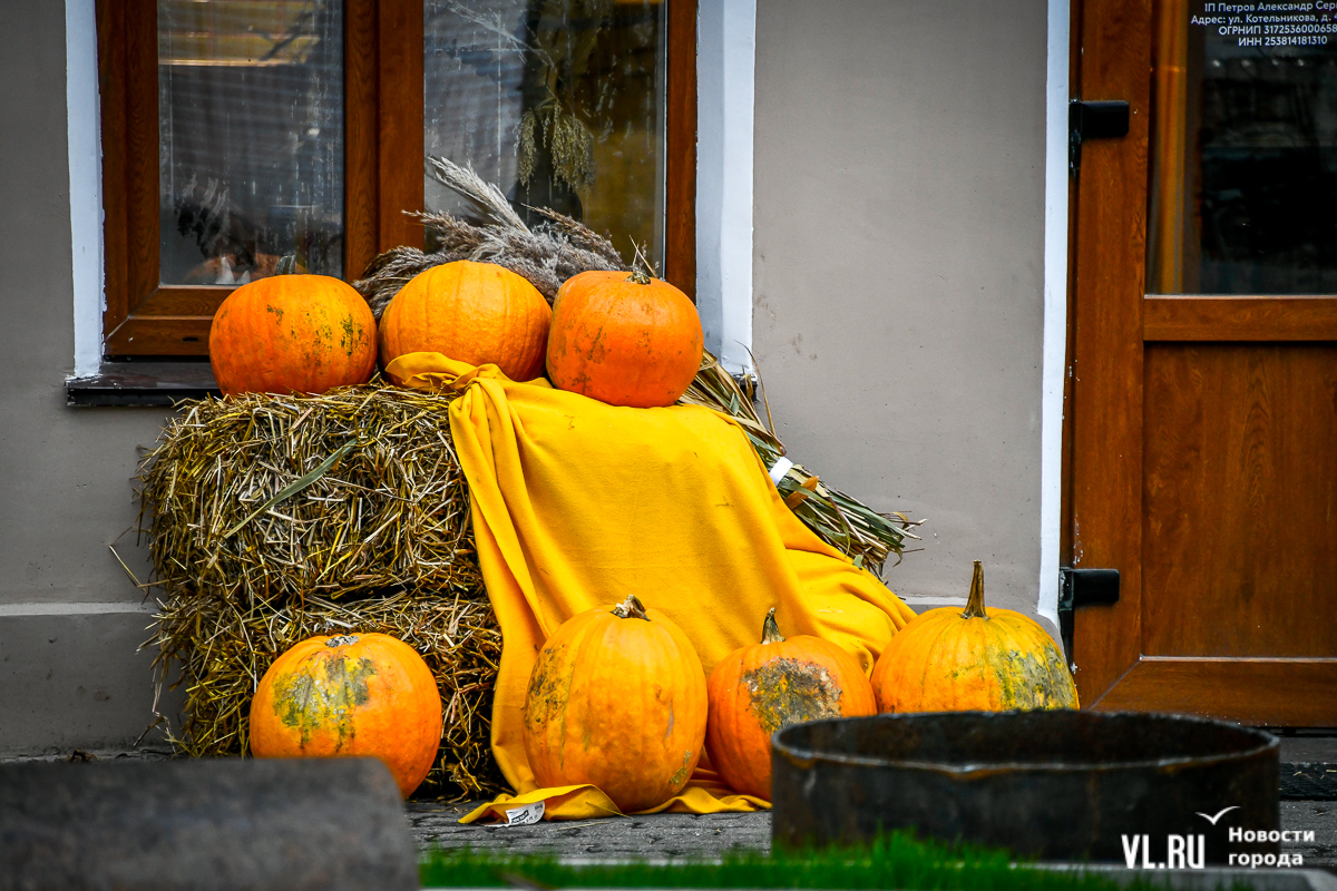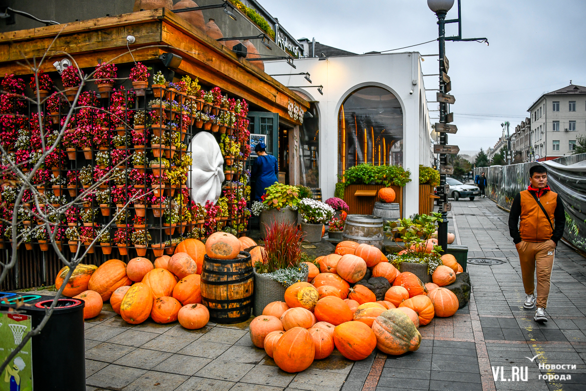 Костры рябин давно отгорели, а календарь стремительно переворачивается к зиме – ярких красок становится меньше, и владельцы различных заведений во Владивостоке восполняют этот пробел. Кто-то украшает свои входные группы цветами и красивым сухостоем, кто-то привёз, кажется, целый грузовик тыкв. «Хэллоуинскую» символику уже почти не используют, отдавая предпочтение просто осеннему убранству.
