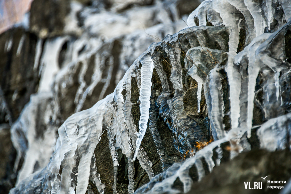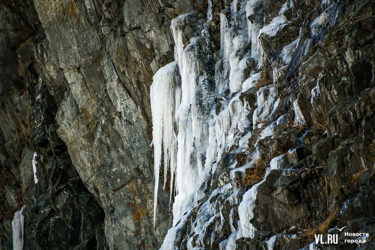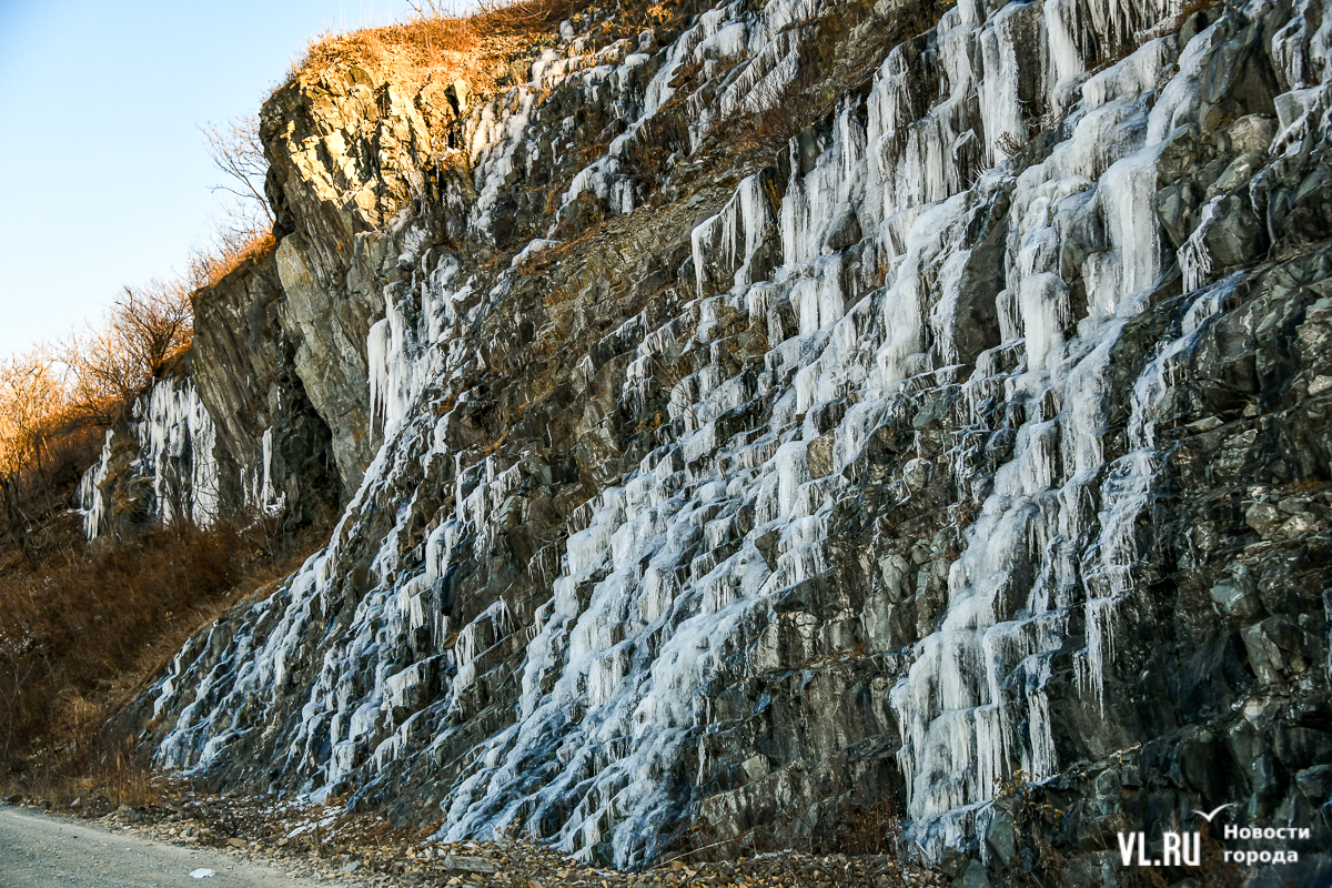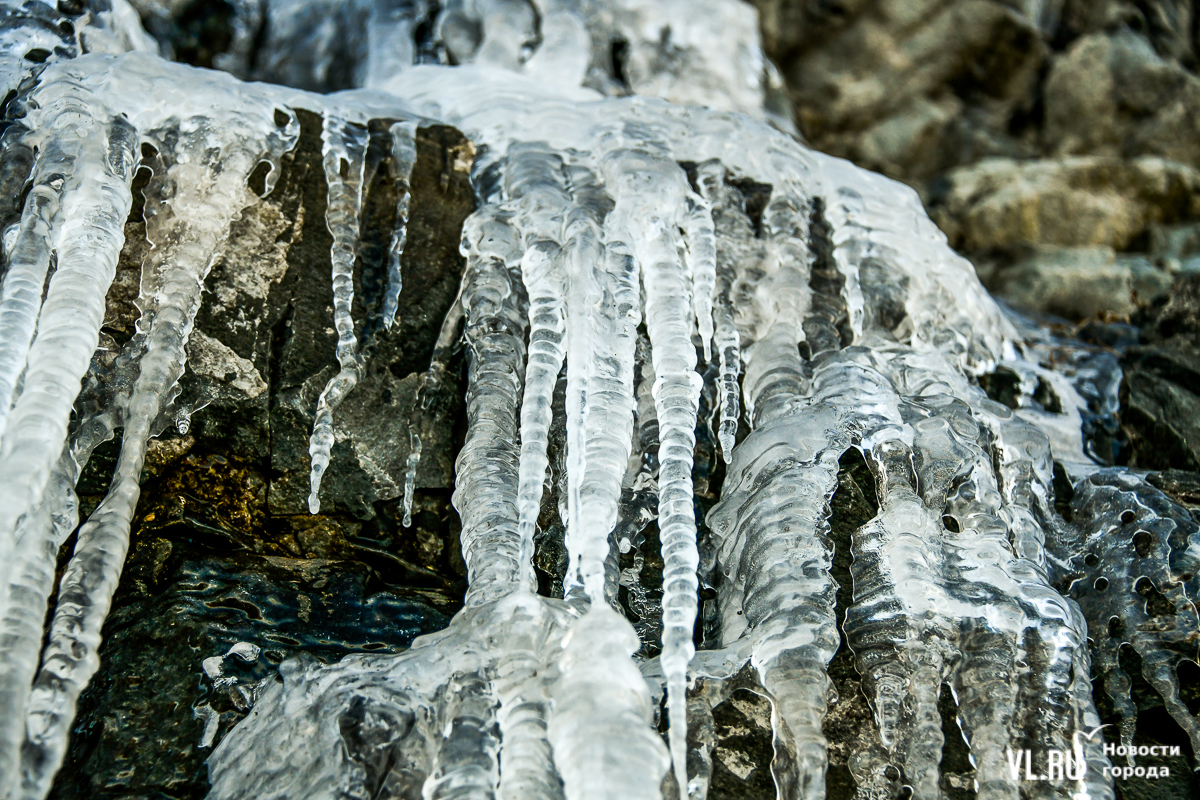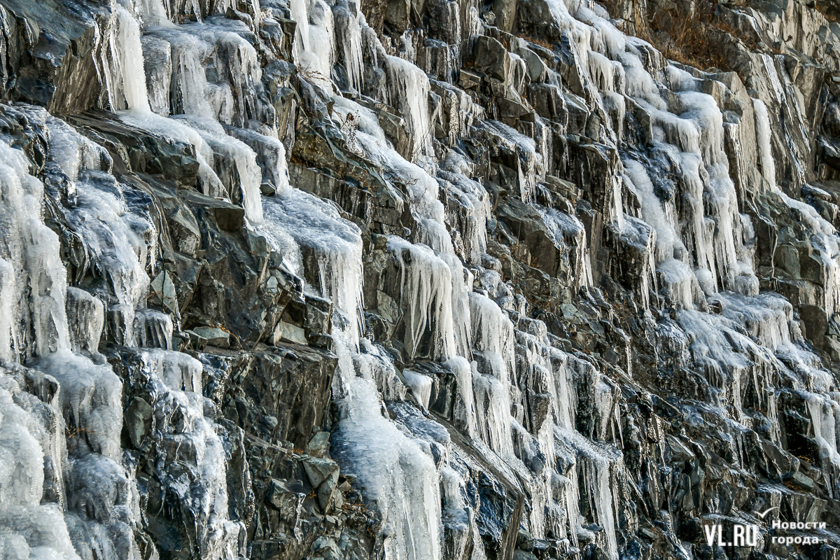 В последние дни во Владивостоке резко похолодало. Вода, которая проступает сквозь скалы, окружающие объездную трассу, замёрзла длинными сосульками.
