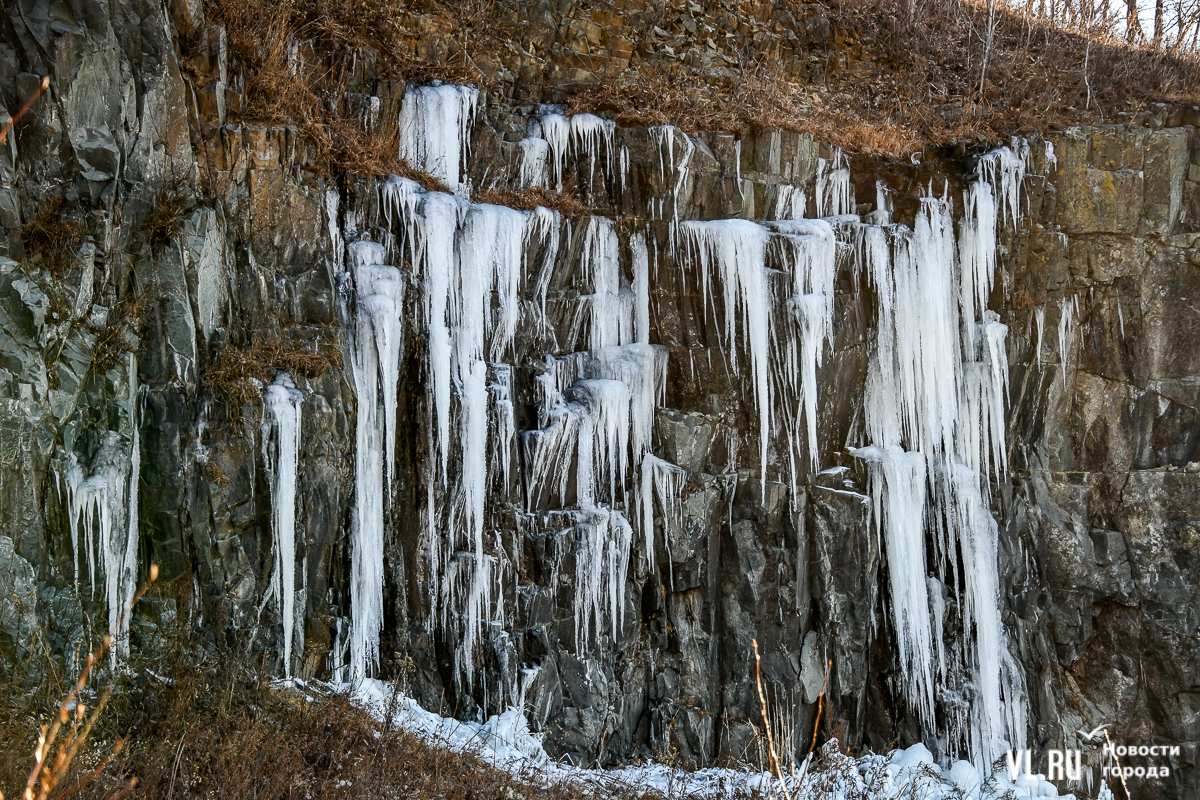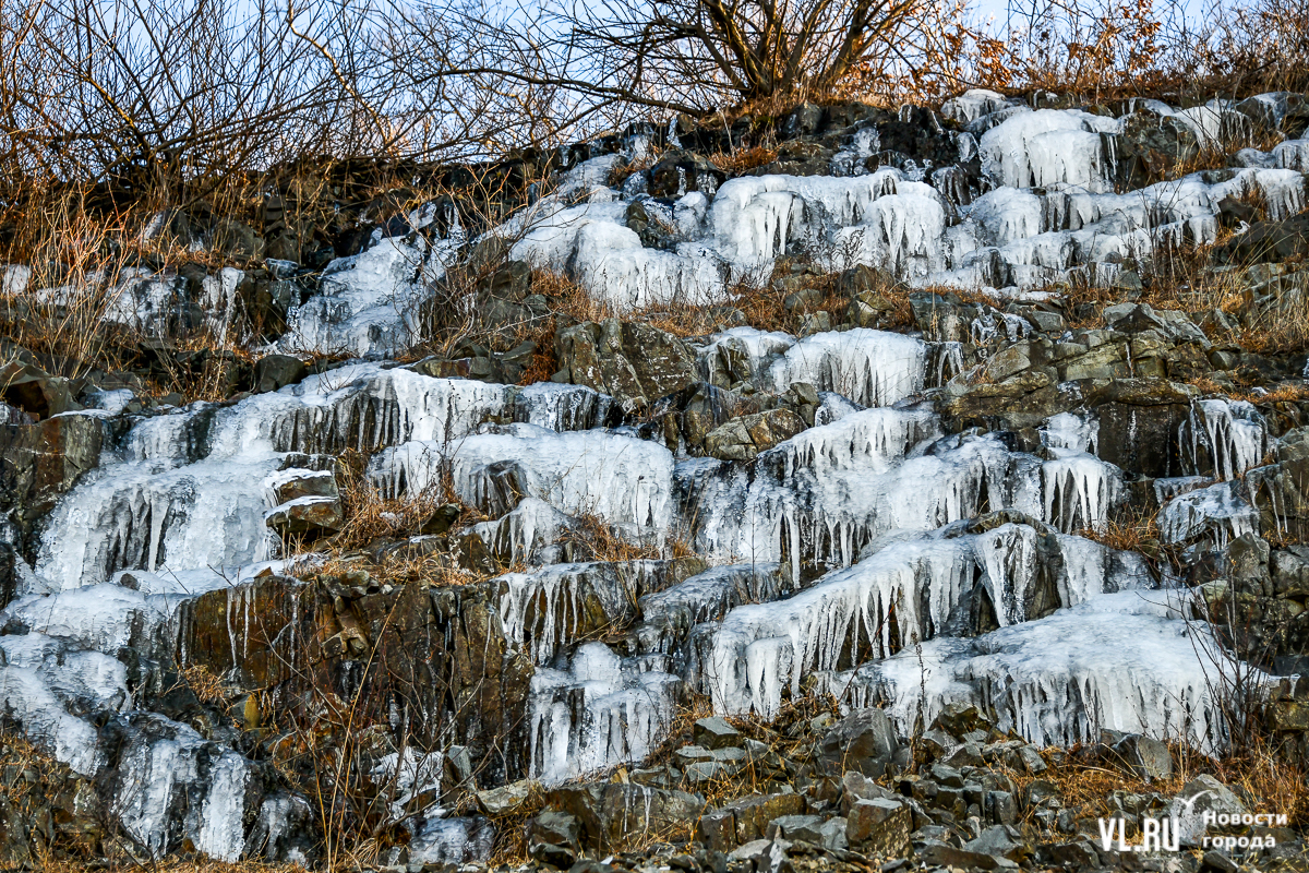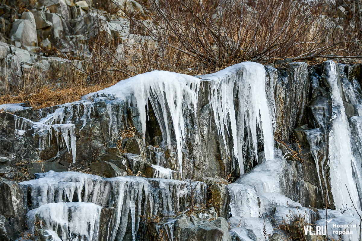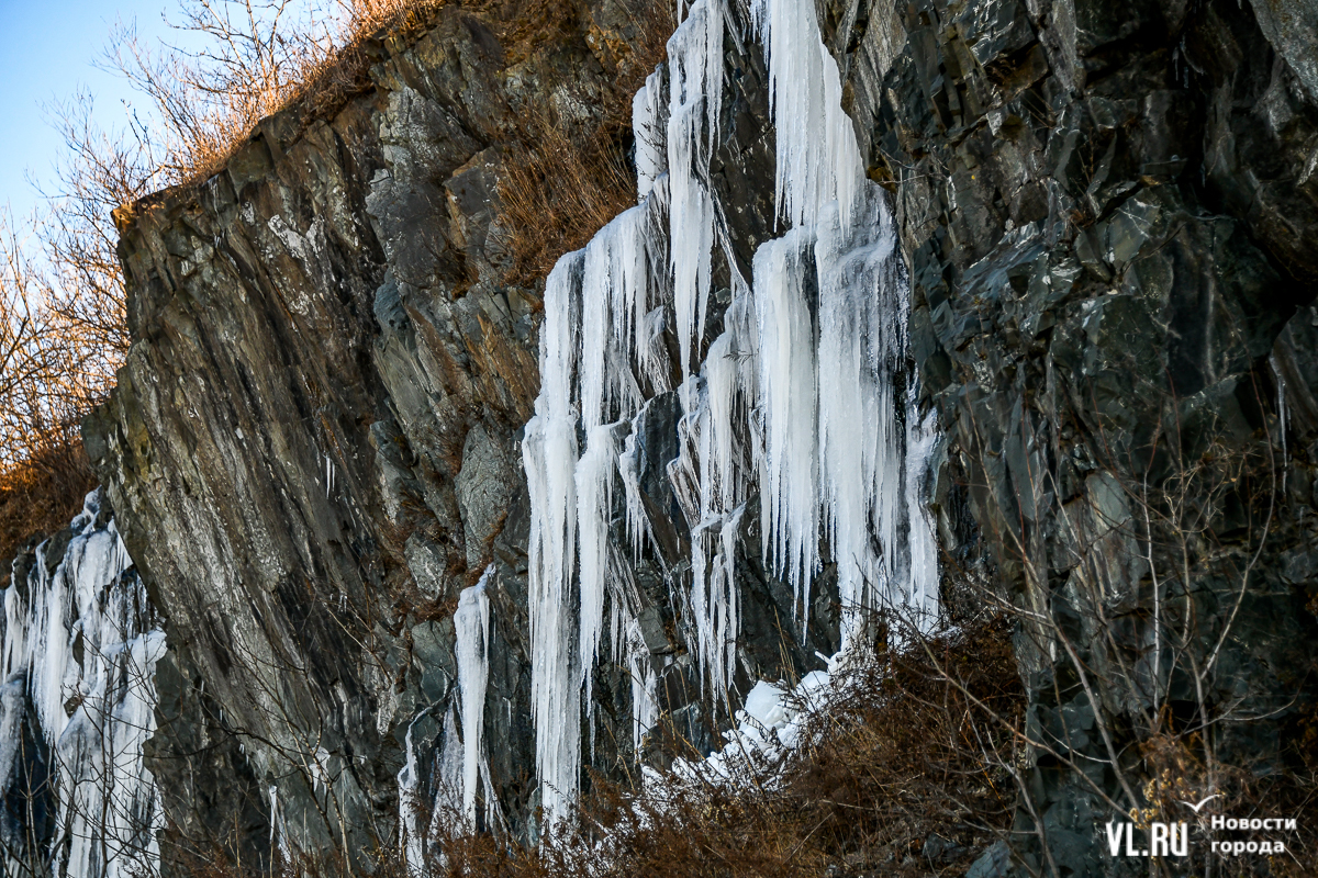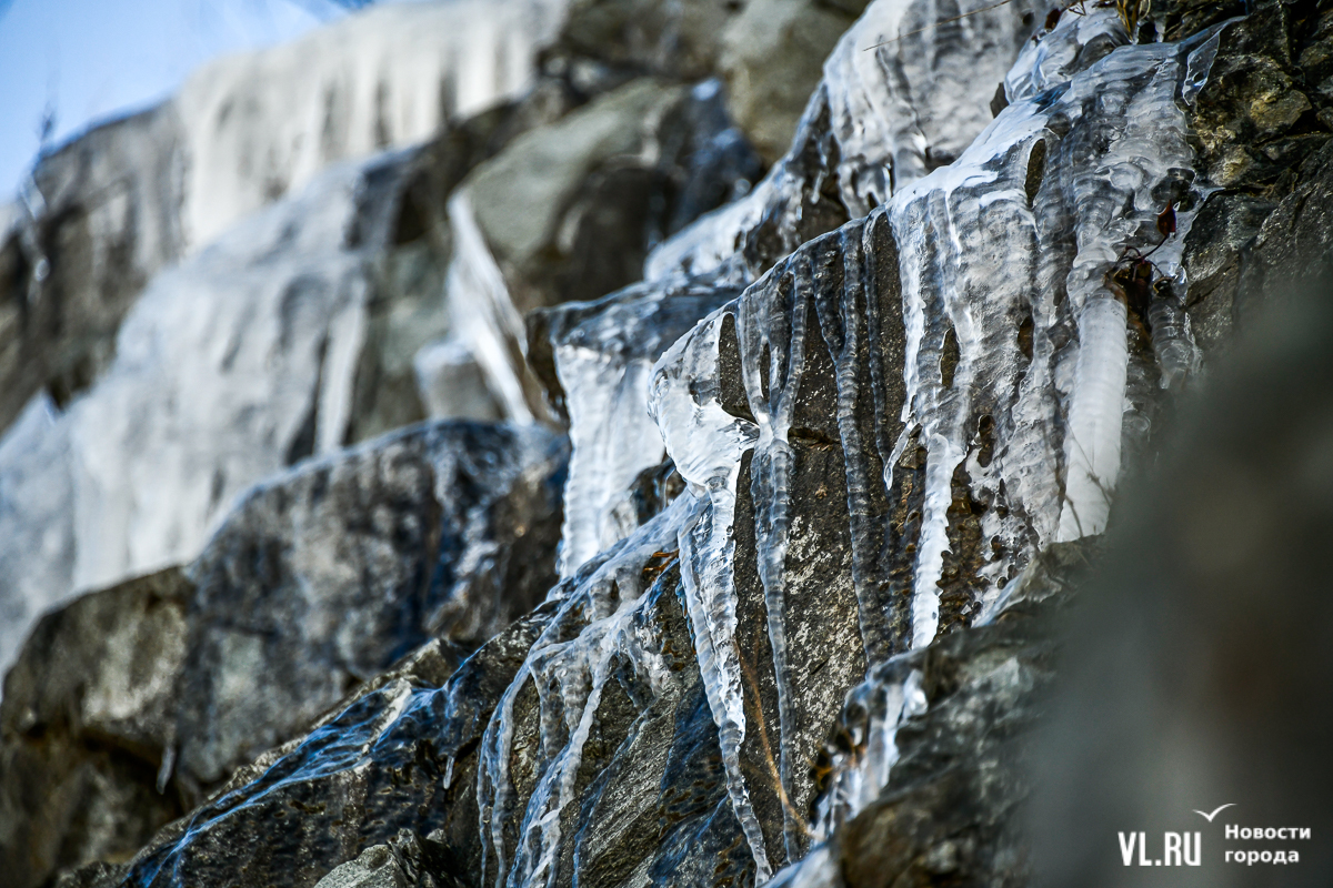 В последние дни во Владивостоке резко похолодало. Вода, которая проступает сквозь скалы, окружающие объездную трассу, замёрзла длинными сосульками.