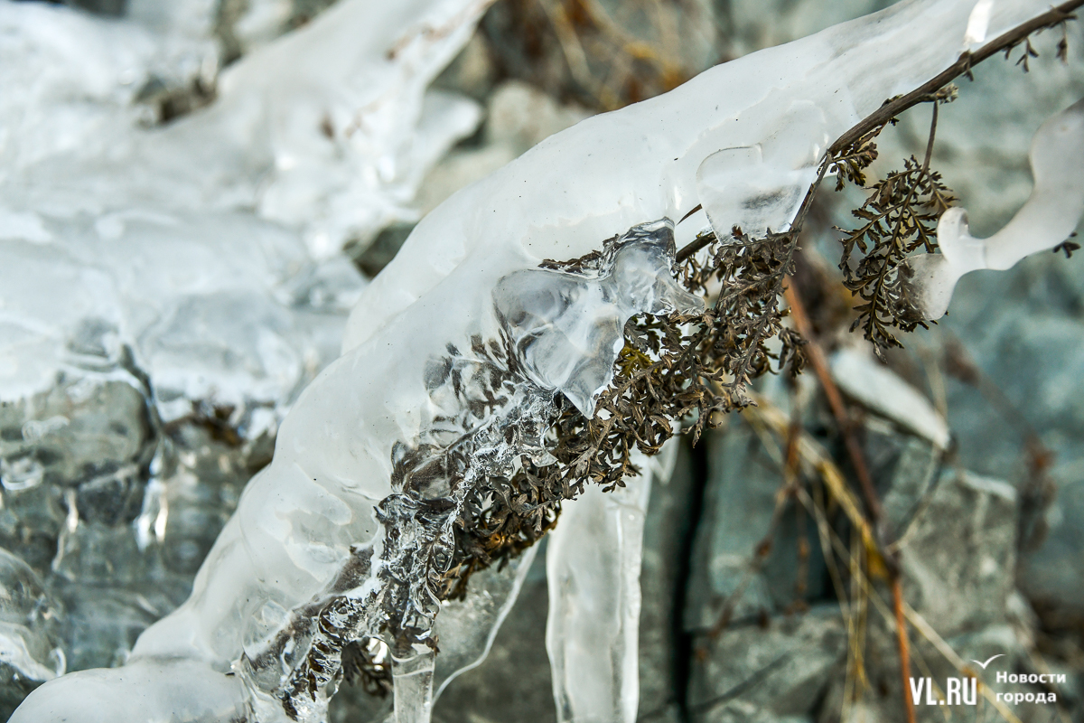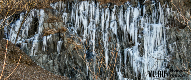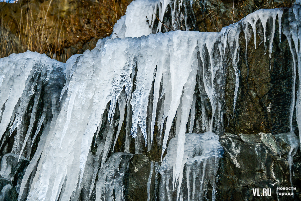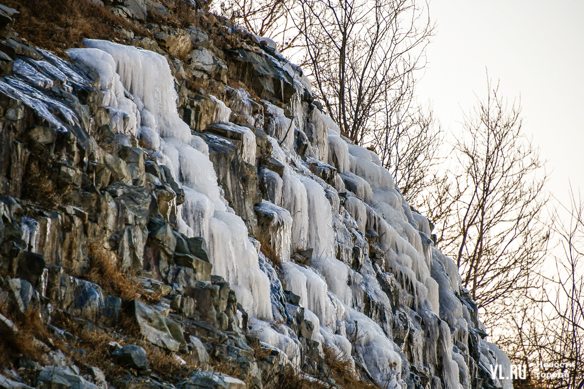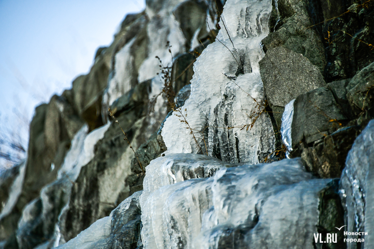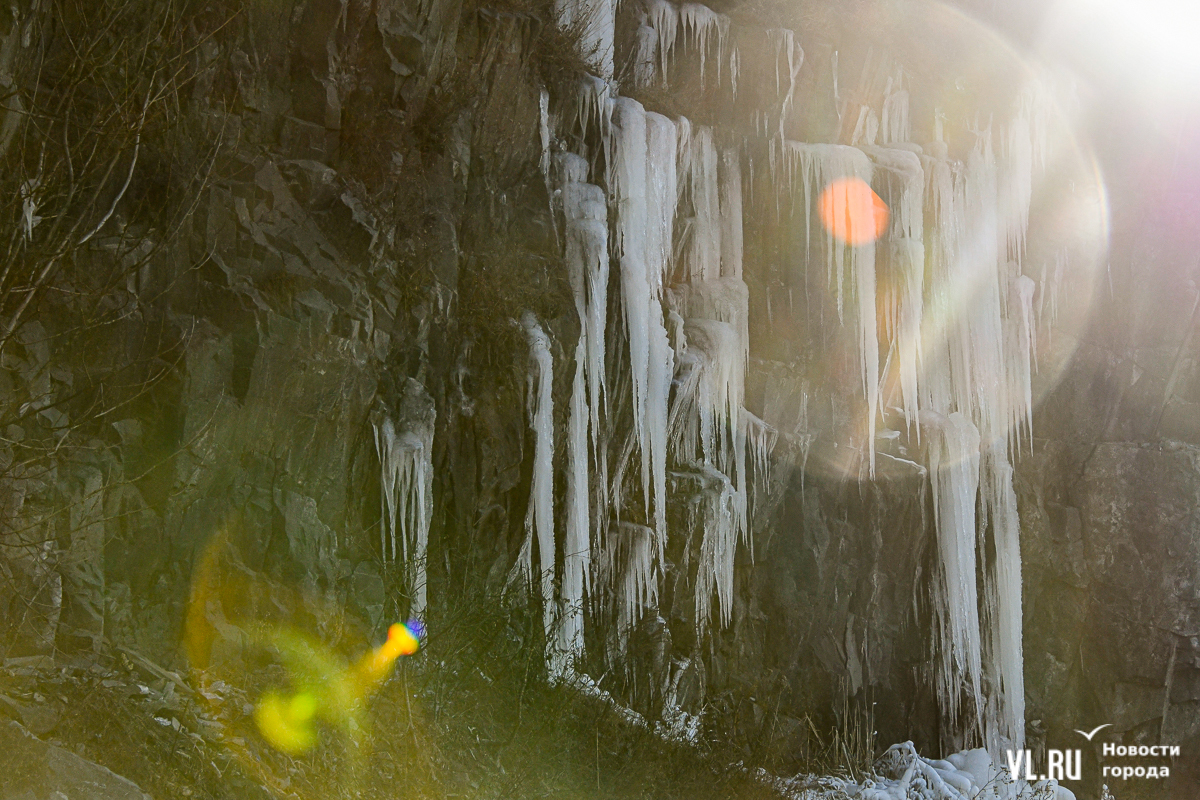 В последние дни во Владивостоке резко похолодало. Вода, которая проступает сквозь скалы, окружающие объездную трассу, замёрзла длинными сосульками.