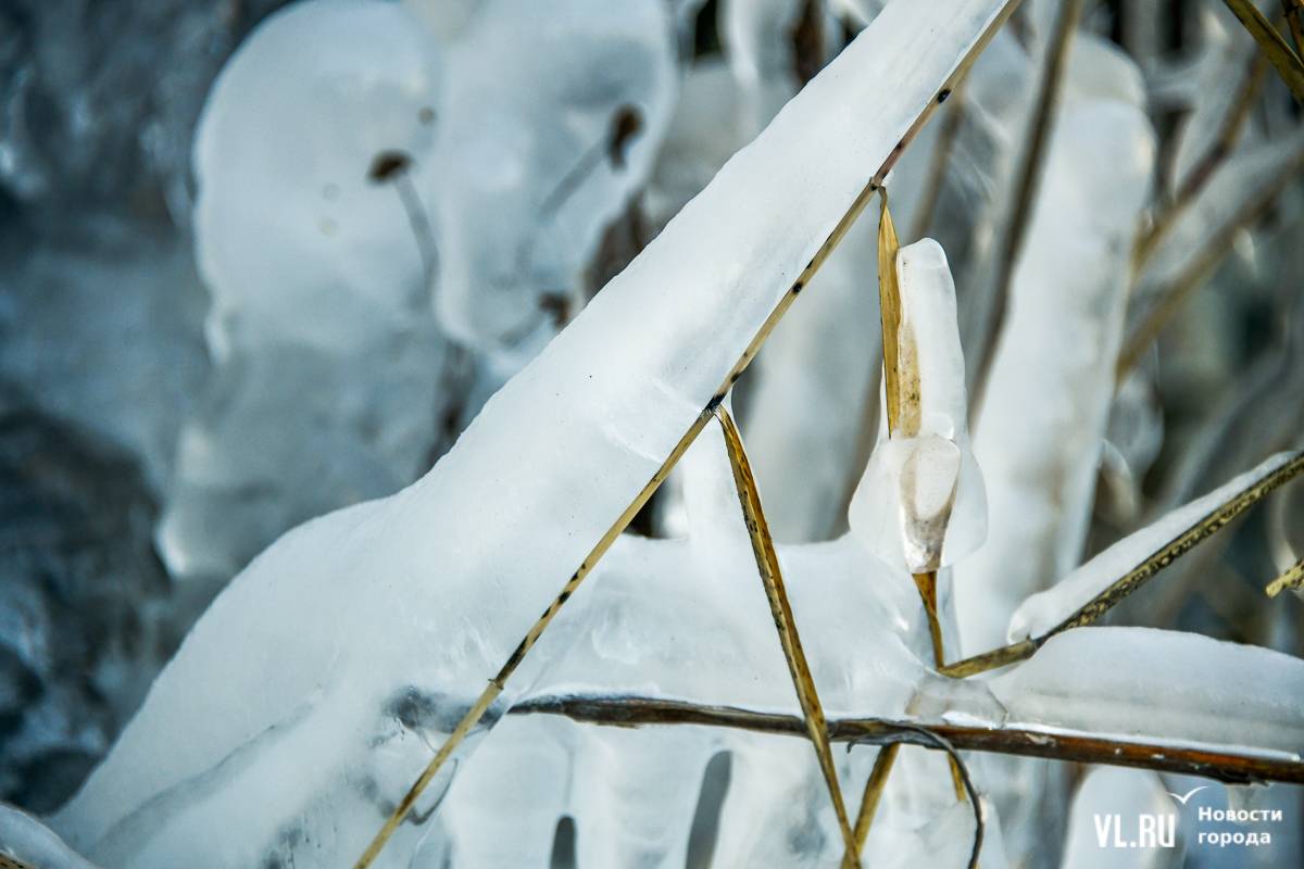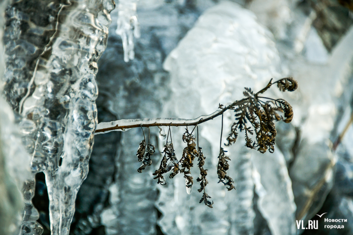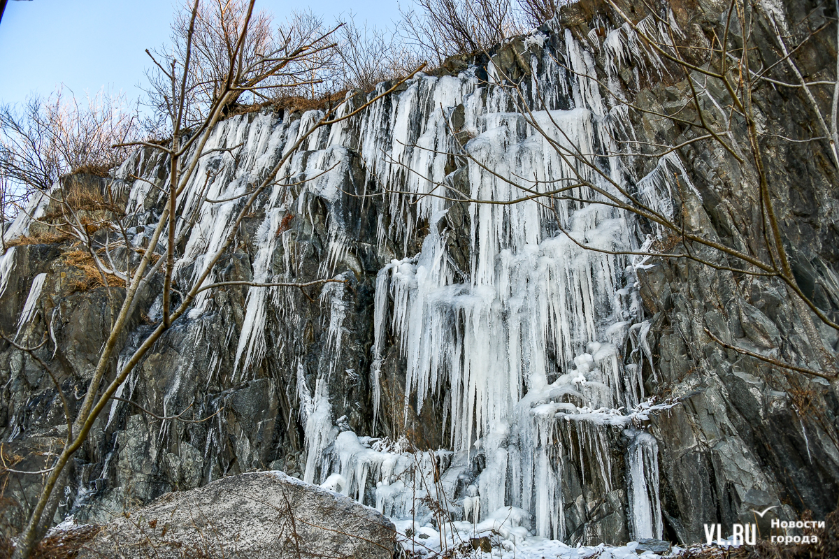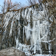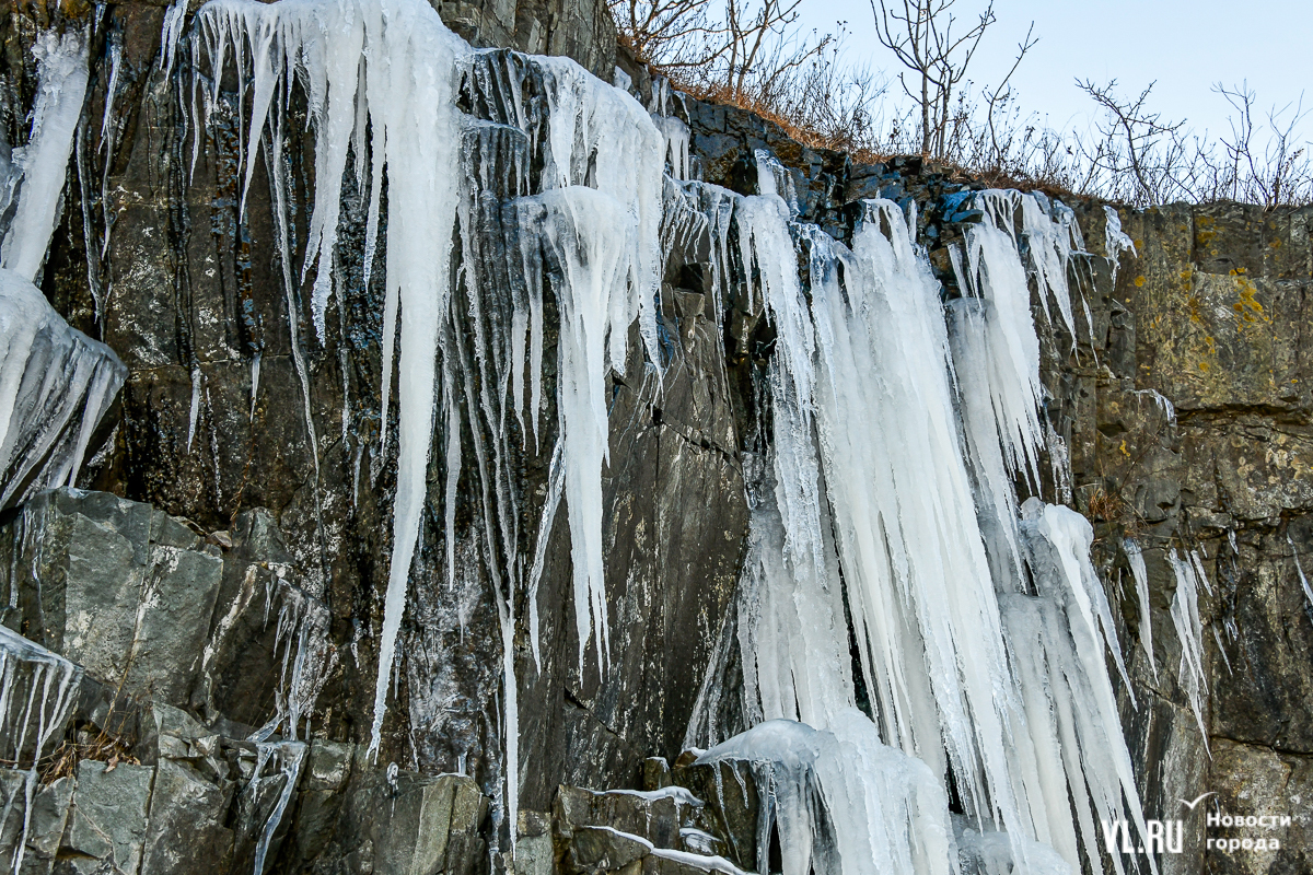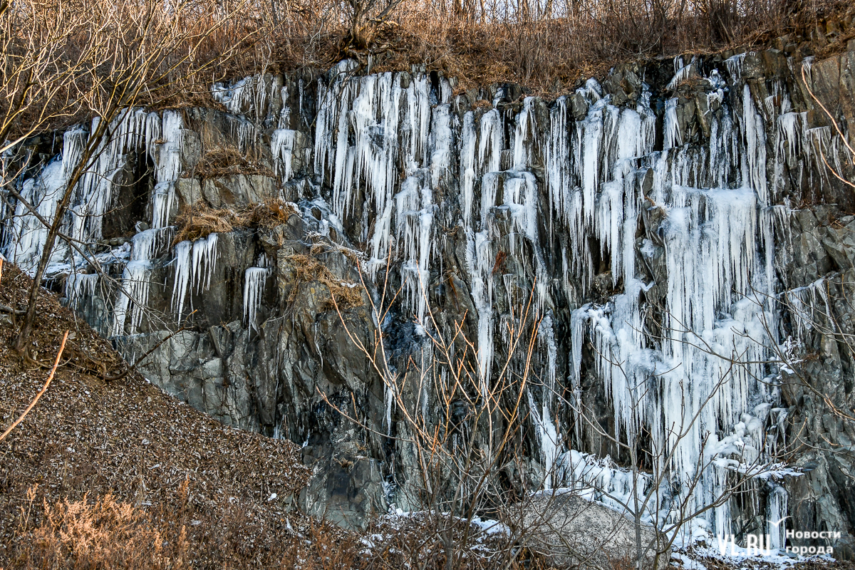 В последние дни во Владивостоке резко похолодало. Вода, которая проступает сквозь скалы, окружающие объездную трассу, замёрзла длинными сосульками.