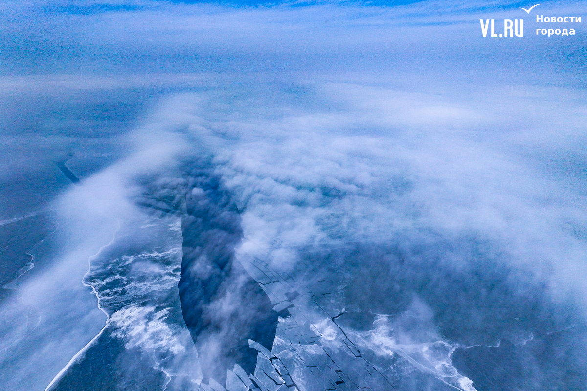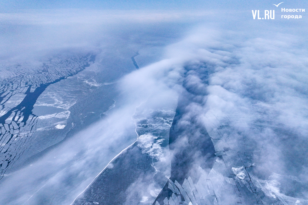 Владивосток проснулся сегодня в пелене тумана, который с восходом солнца стал постепенно подниматься, превращаясь в полупрозрачную лёгкую вуаль. Среди «перьев» тумана особенно эффектно выглядит освобождающееся ото льда море.