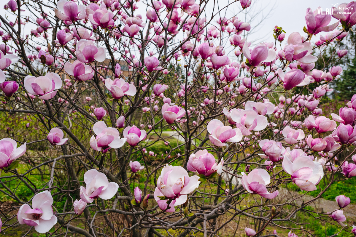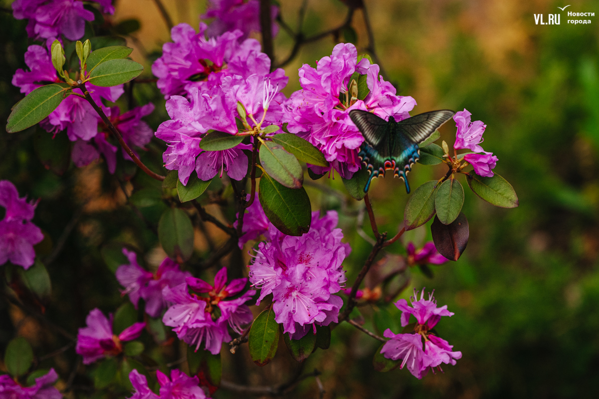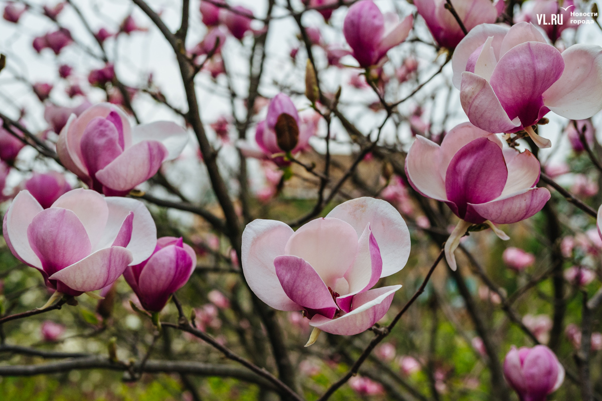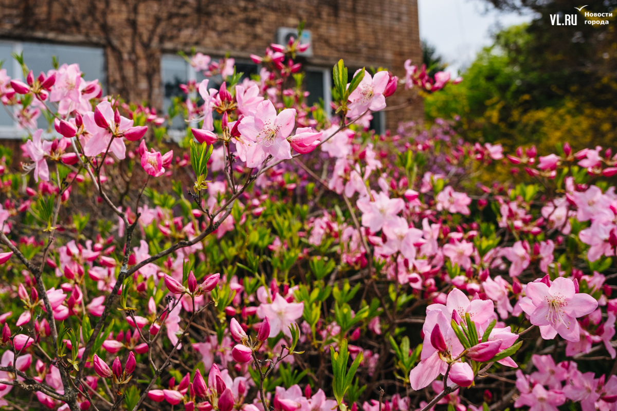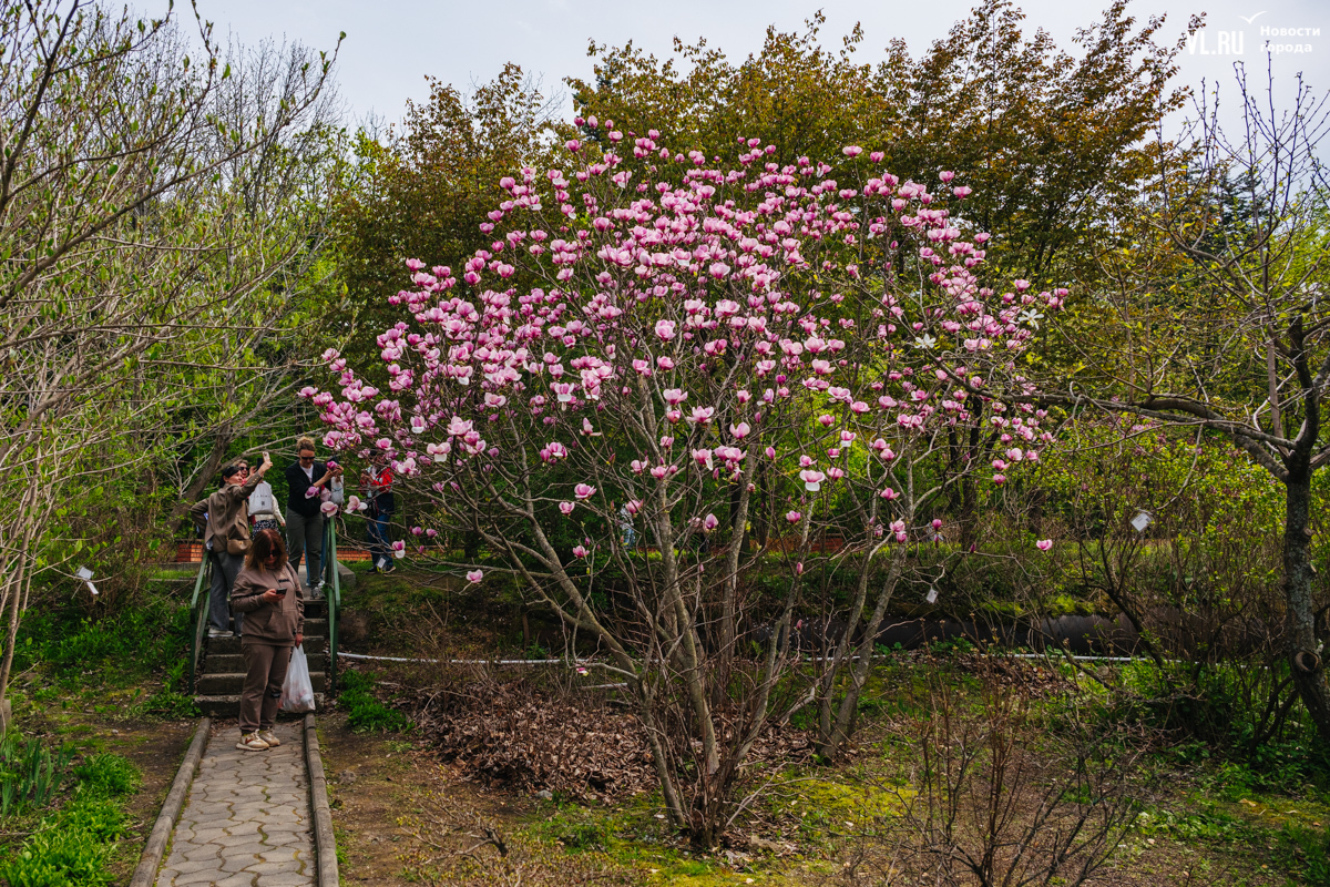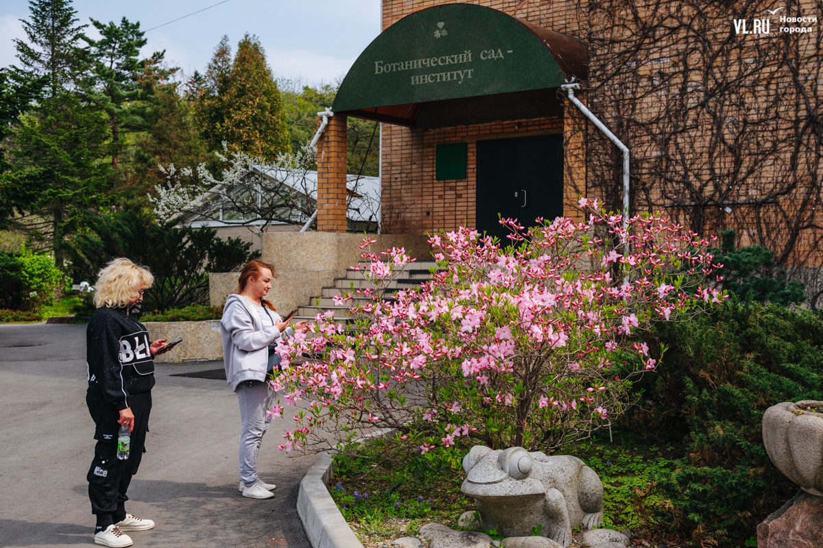 У главных ворот гостей Ботсада встречает редкий рододендрон Шлиппенбаха. Его в Приморском крае в природе можно встретить только на самом юге, в районе полуострова Гамова. Этот вид занесён в Красную книгу и отличается от своего лилового собрата, рододендрона остроконечного, более привычного жителям Владивостока, нежным розовым цветом и острой формой лепестков. Ближе к открытой экспозиции можно полюбоваться цветущей магнолией и яблонями. А вот наша приморская «сакура» – вишня Саржента – уже теряет свои хрупкие лепестки под порывами ветра, её цветение очень коротко.
