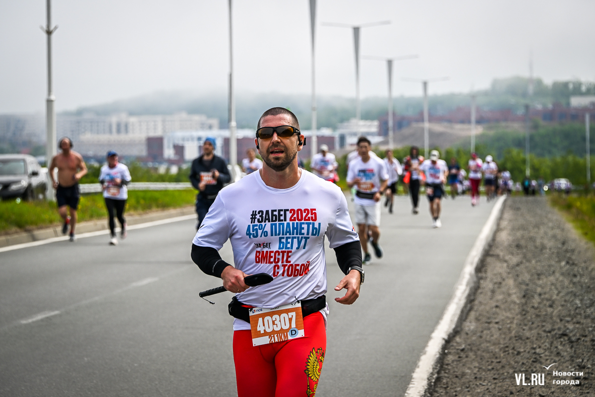 Сегодня на острове Русском всероссийский полумарафон «ЗаБег.РФ» с синхронным стартом. По Университетскому проспекту и Русскому мосту пробежали спортсмены и любители активного образа жизни в тематических футболках. Особенностью этого мероприятия стало то, что люди стартовали одновременно по всей стране, от Камчатки до Калининграда. Во Владивостоке к нему присоединились около 3,5 тысячи человек.