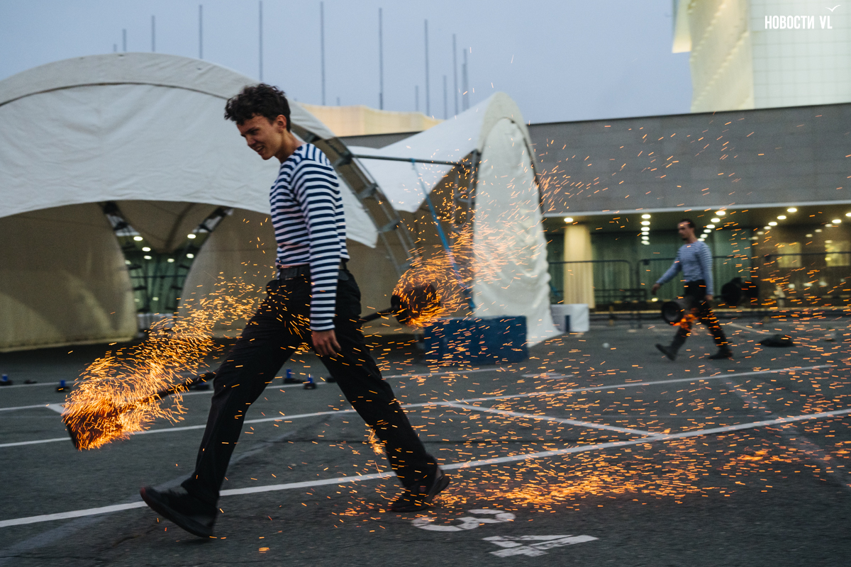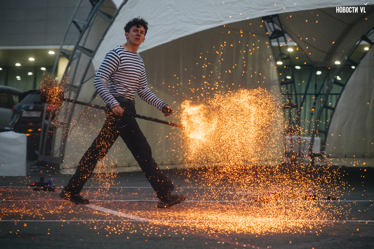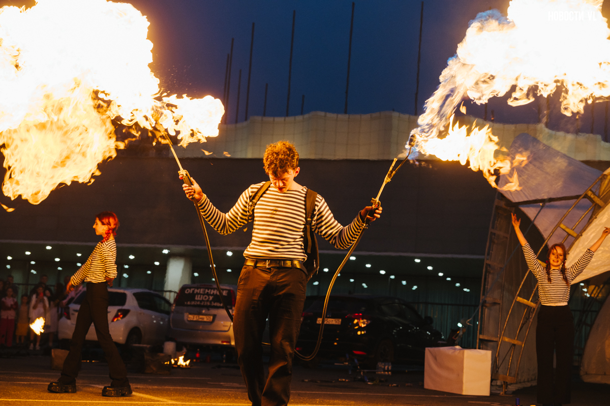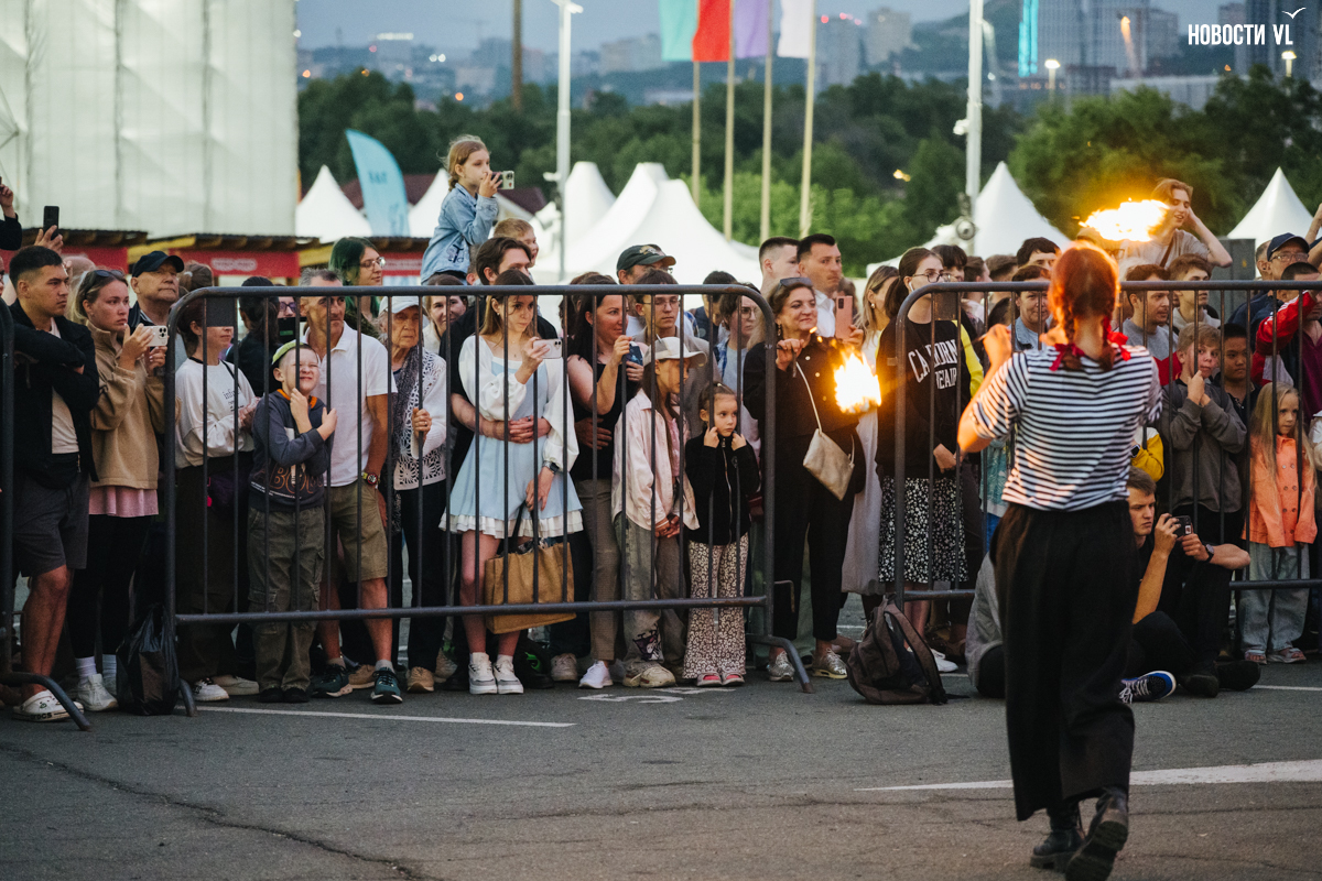 Темнело быстро, поэтому огонь казался всё ярче, а танцы – эффектнее. Да и звучание музыки, видимо, подрегулировали, и она перестала яростно дубасить по ушам. Когда заиграла песня «Владивосток-2000», под которую ребята крутили огненные веера, зрители стали подпевать. Время от времени за танцорами включались огненные фейерверки. Искры от реквизита эффектно разлетались вокруг. Дети радовались, взрослые снимали выступление на телефоны.