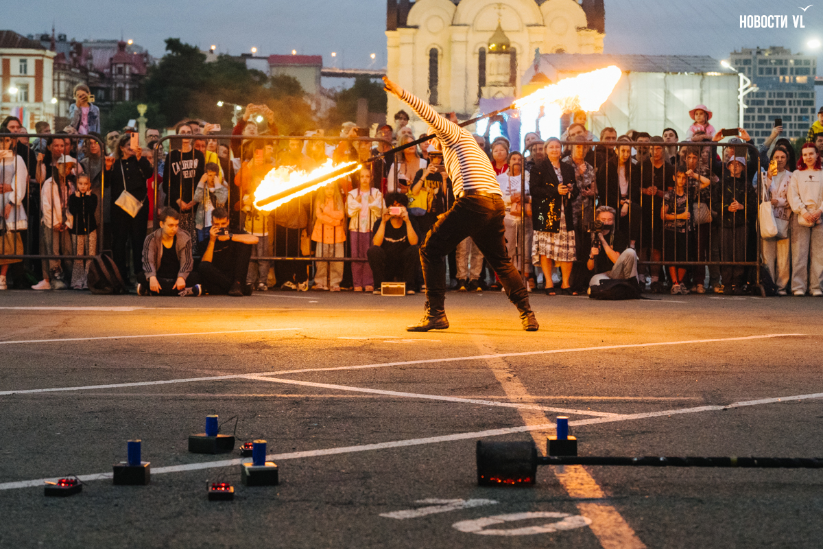 Отмечать День города «по-настоящему» во Владивостоке будут 5 июля. Но и 2-го числа, в его официальный День рождения, на площади не обошлось без праздничных мероприятий, хоть и камерных. Вечером на парковке перед зданием правительства Приморского края сперва прошёл чтецкий спектакль, затем непрофессиональные певцы исполнили несколько композиций, а уже в сумерках перед горожанами выступила пиротехническая группа с огненным шоу.