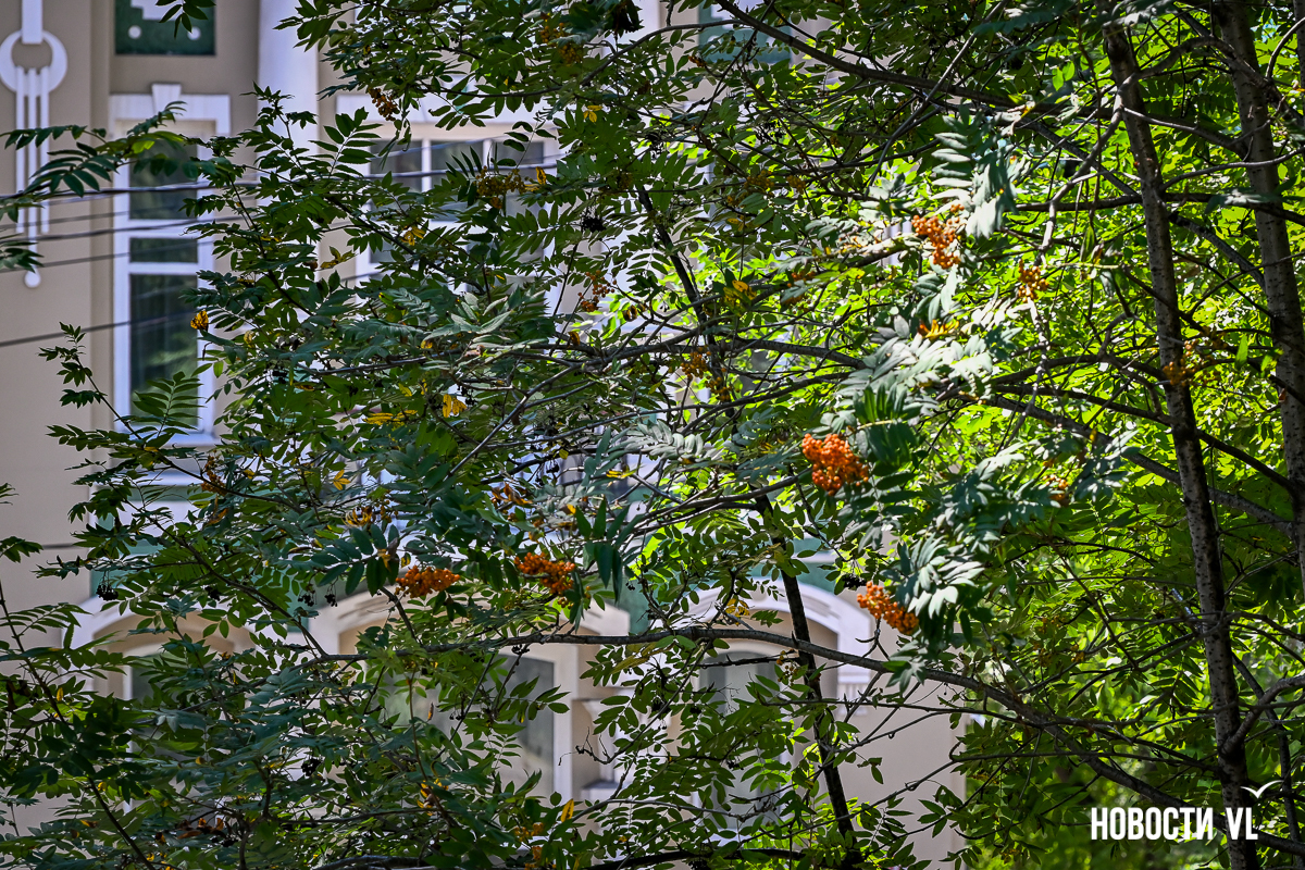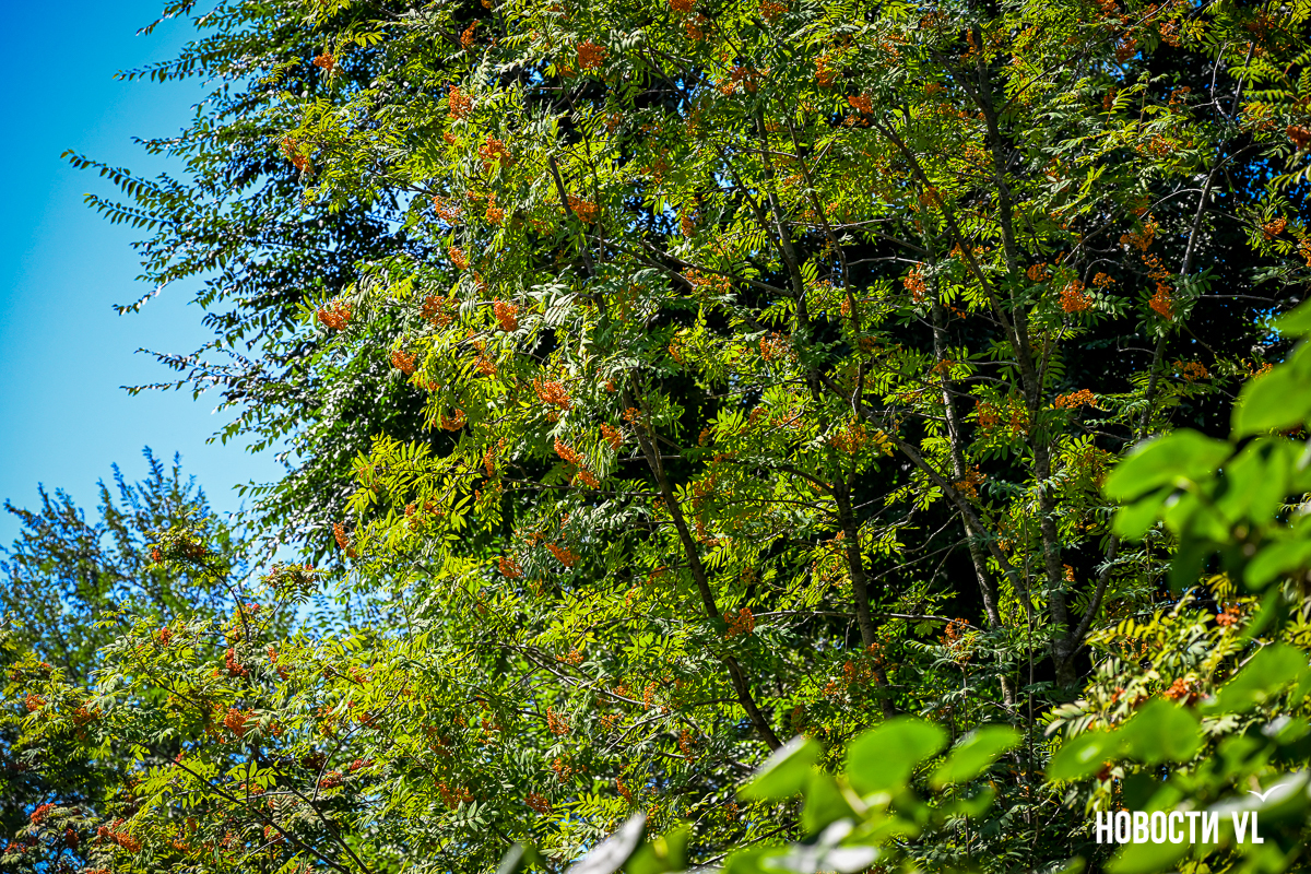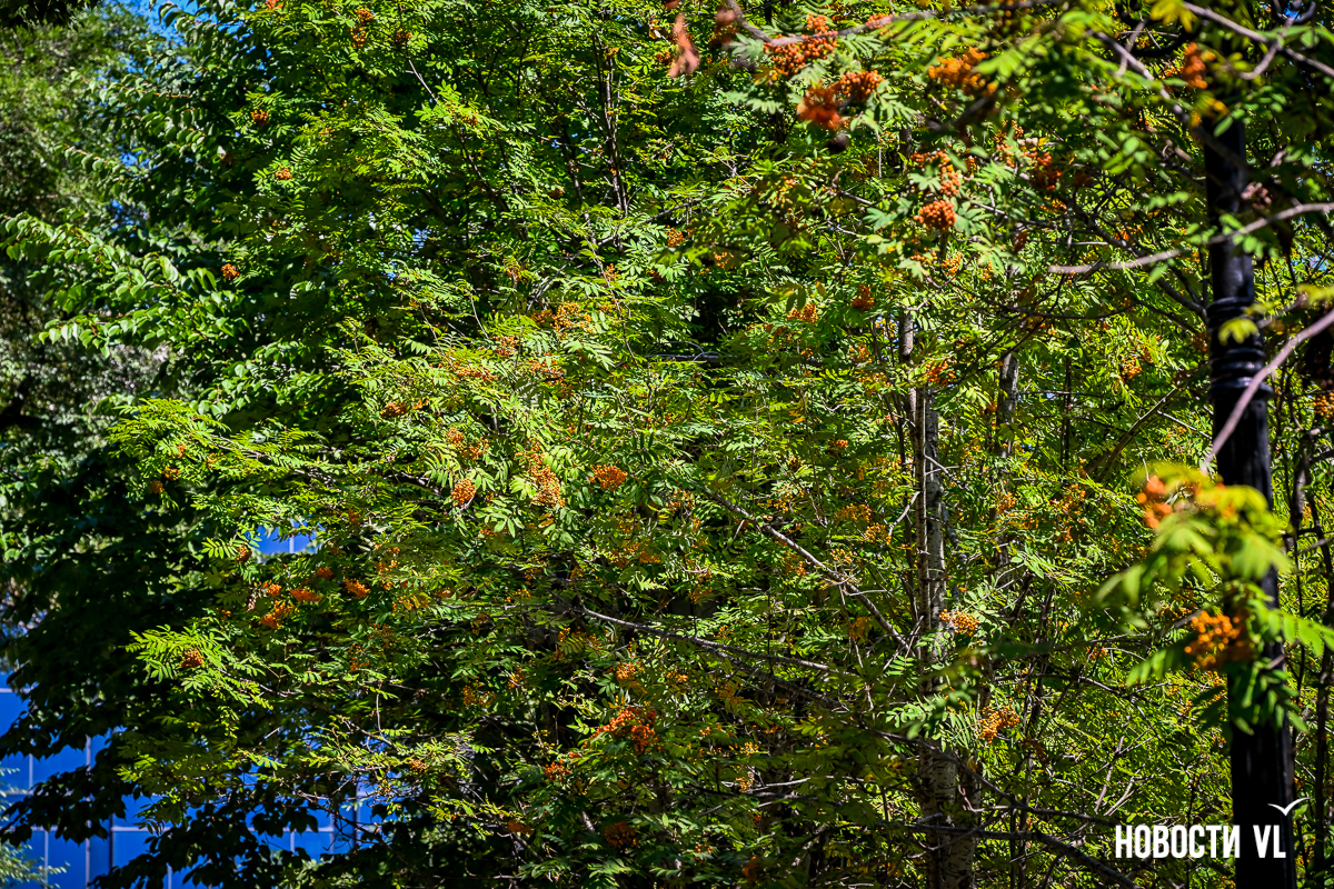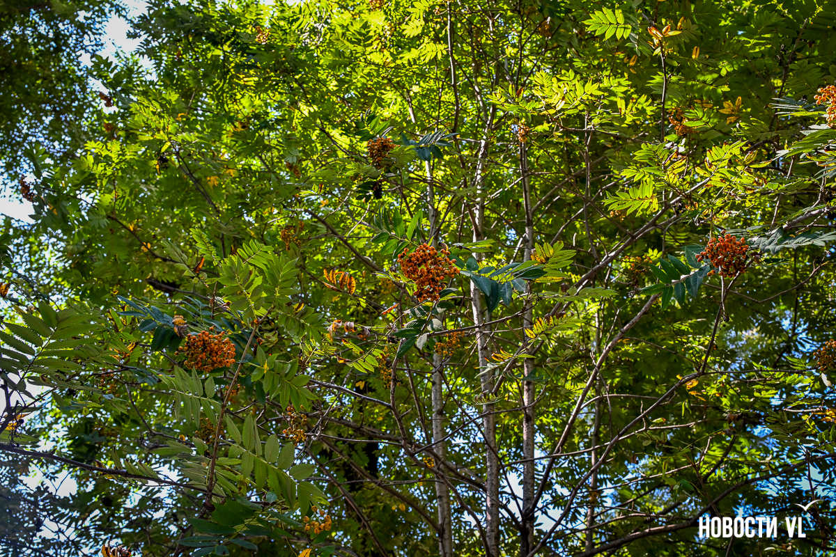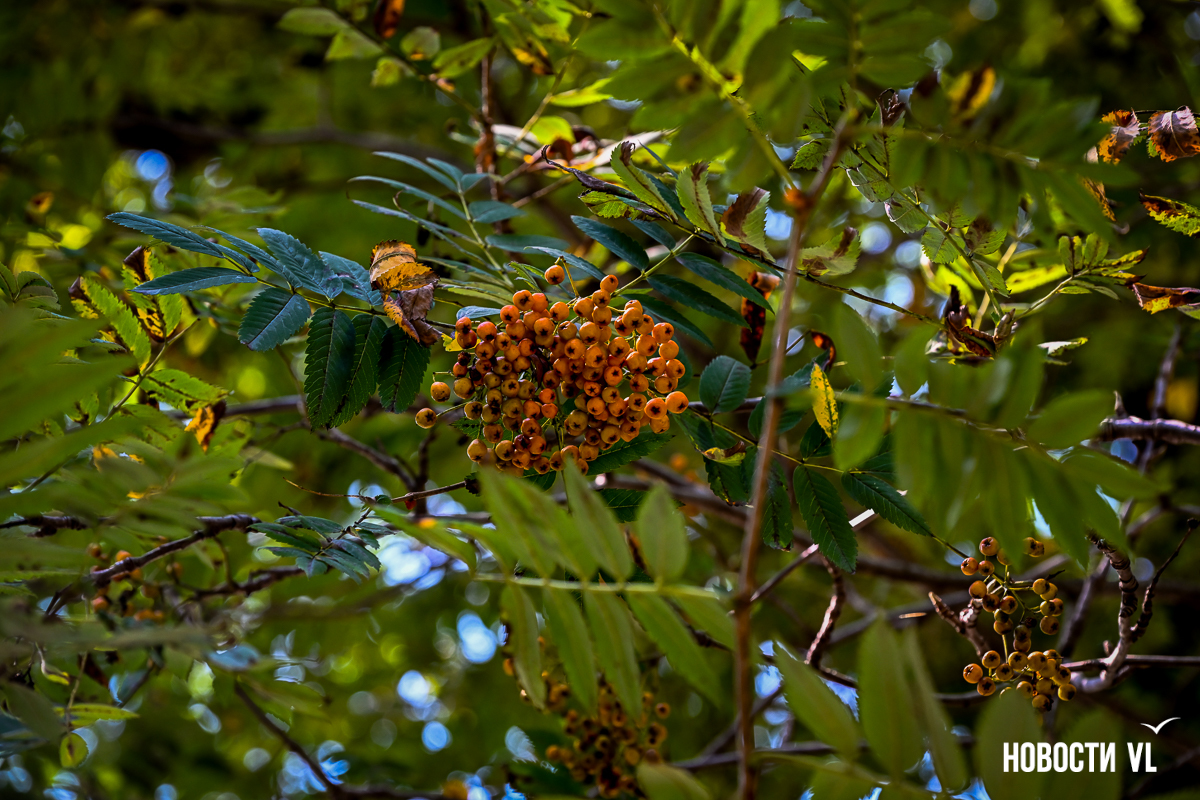 Рябины кострами во Владивостоке не горят – плоды местного вида, рябины амурской, оранжевые. Алеть они начнут зимой, хотя и сейчас выглядят красиво. Тонкие ветви свисают под тяжестью гроздьев всё ниже, и каждый желающий может сделать с ними или на их фоне фотографию «имени 3 сентября».