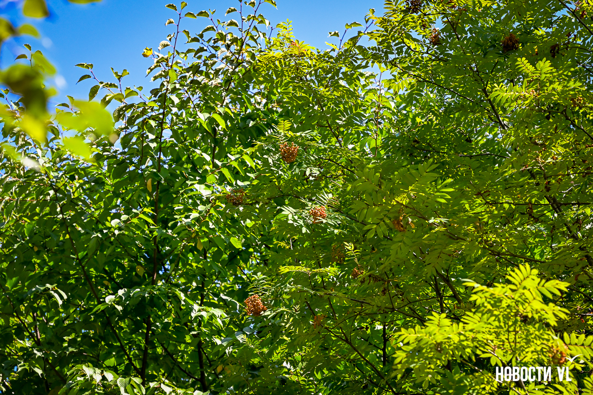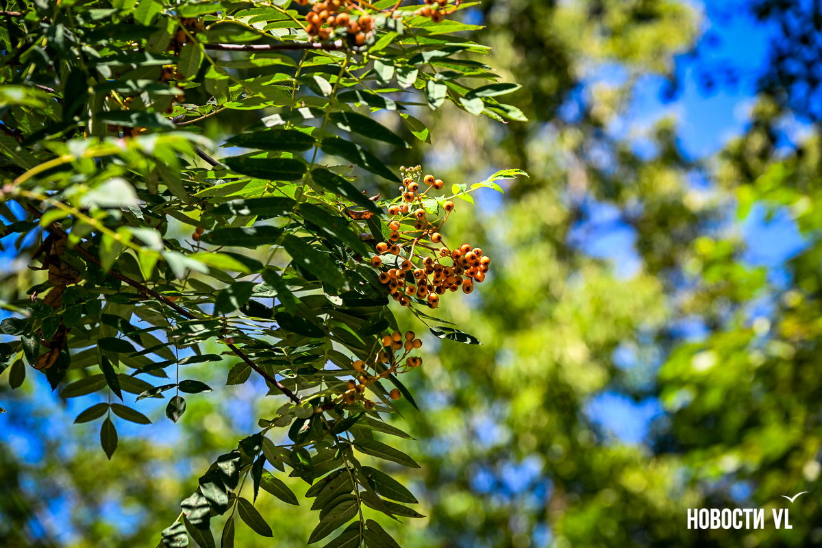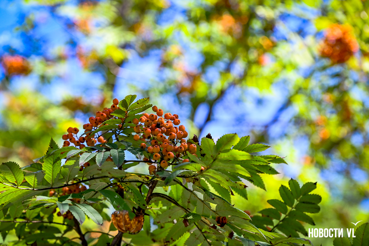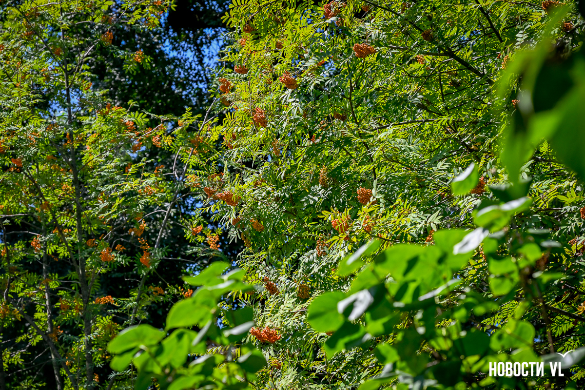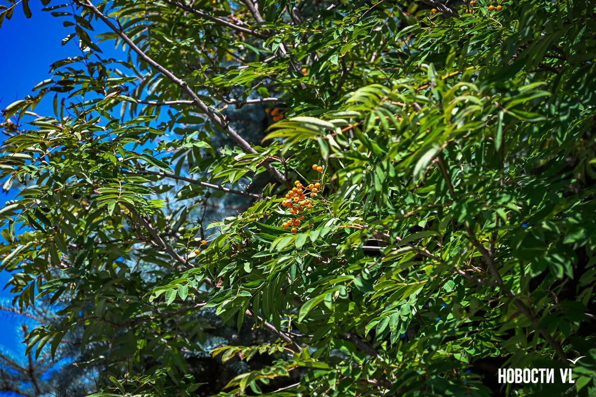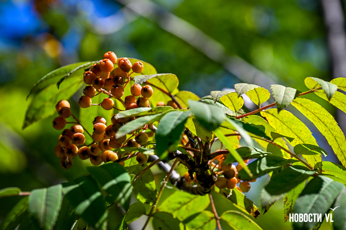 Рябины кострами во Владивостоке не горят – плоды местного вида, рябины амурской, оранжевые. Алеть они начнут зимой, хотя и сейчас выглядят красиво. Тонкие ветви свисают под тяжестью гроздьев всё ниже, и каждый желающий может сделать с ними или на их фоне фотографию «имени 3 сентября».