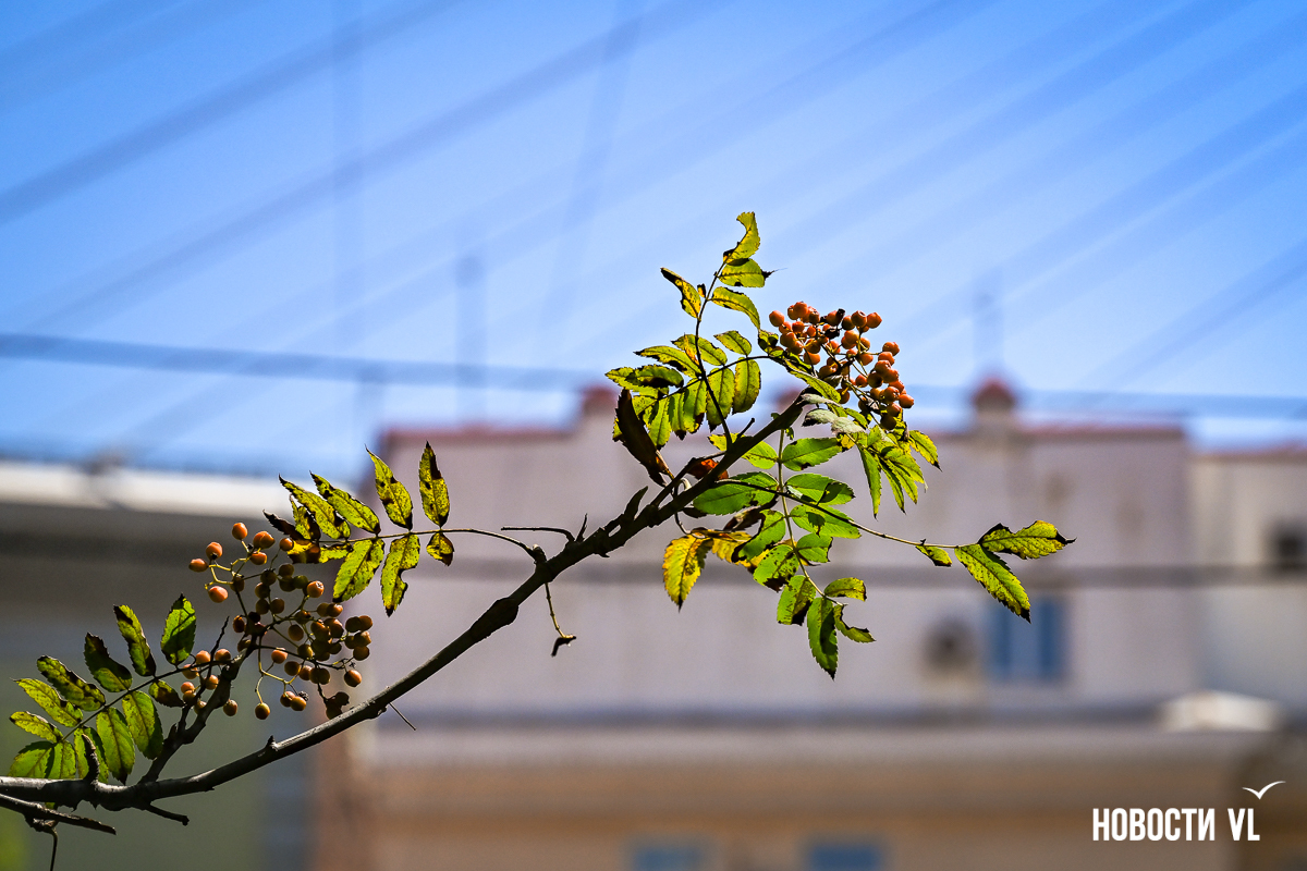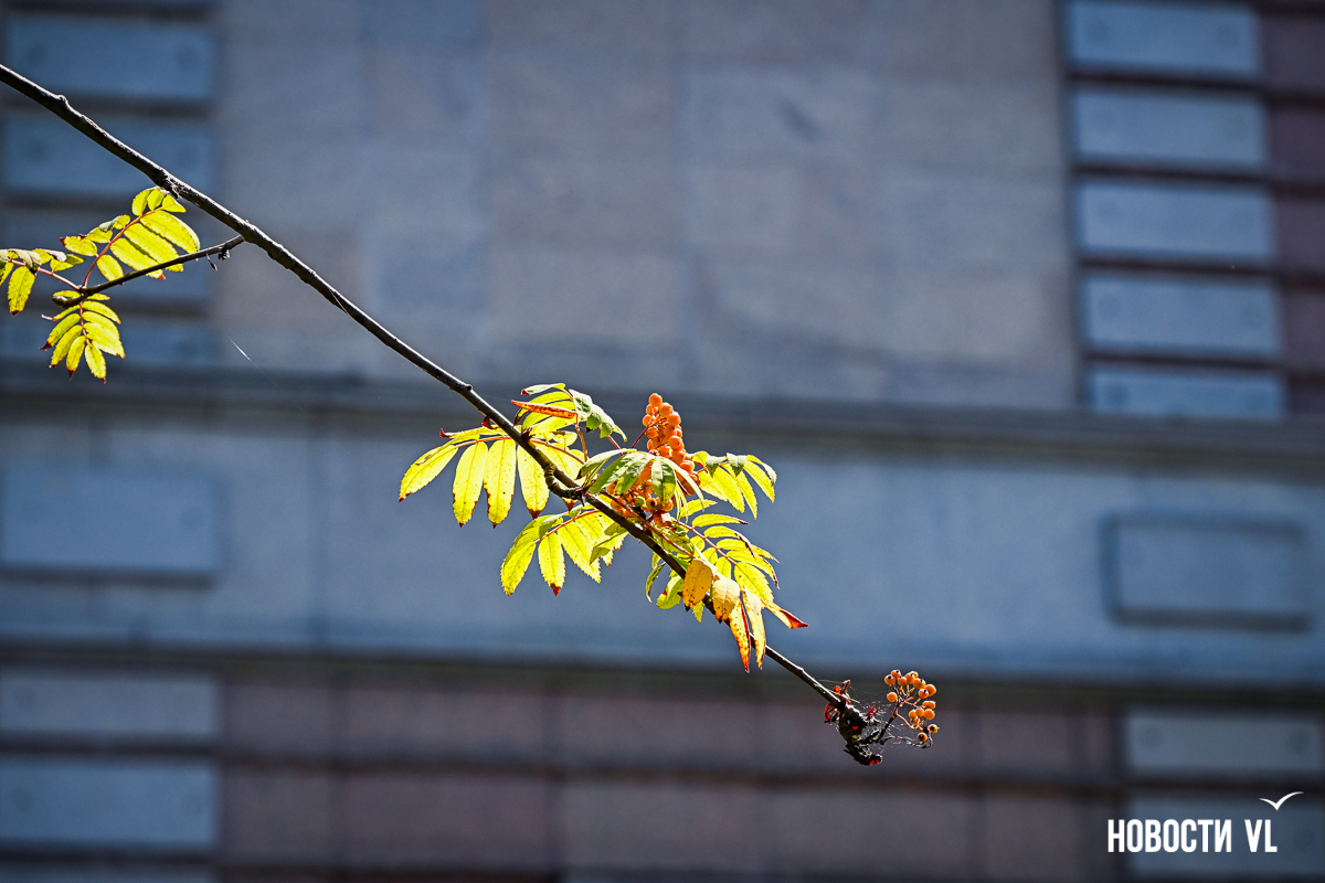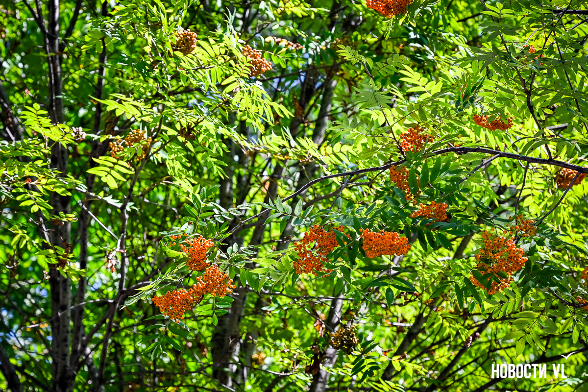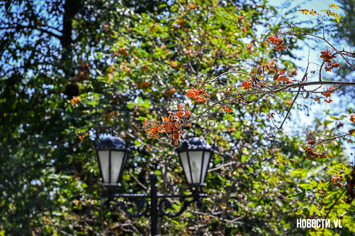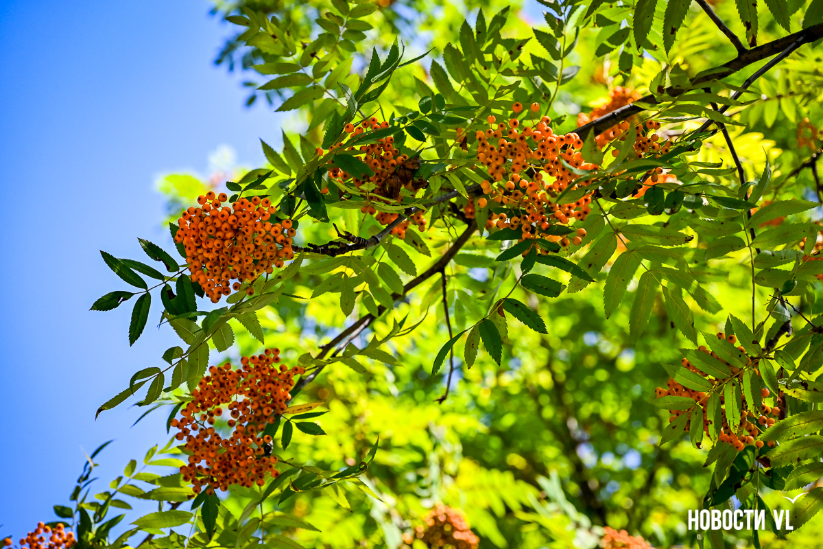Рябины кострами во Владивостоке не горят – плоды местного вида, рябины амурской, оранжевые. Алеть они начнут зимой, хотя и сейчас выглядят красиво. Тонкие ветви свисают под тяжестью гроздьев всё ниже, и каждый желающий может сделать с ними или на их фоне фотографию «имени 3 сентября».