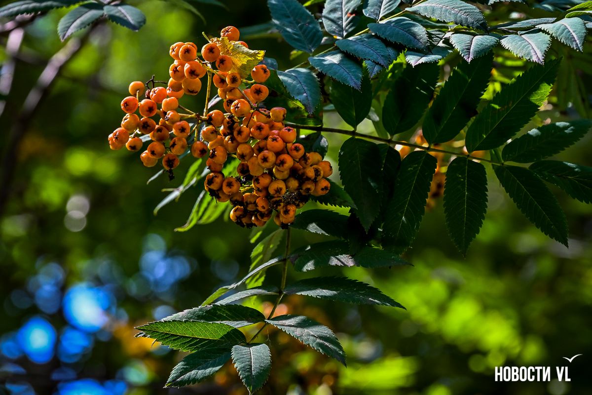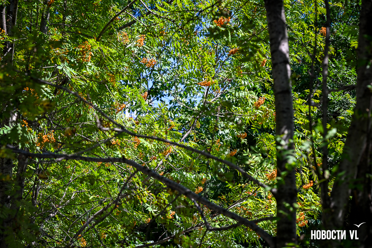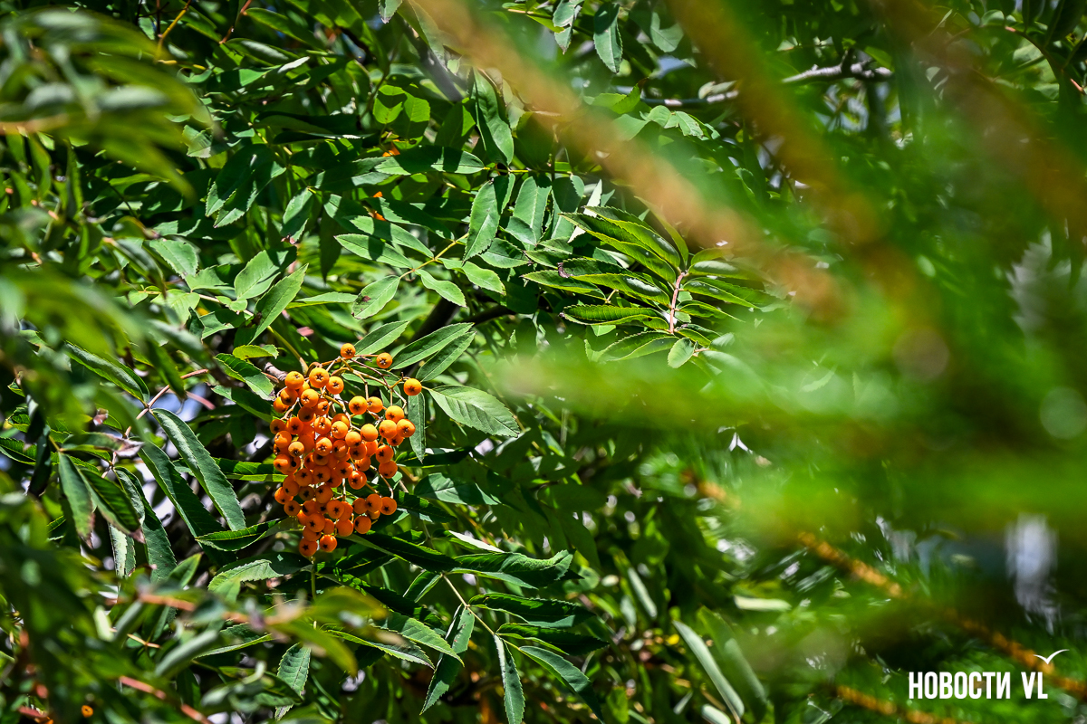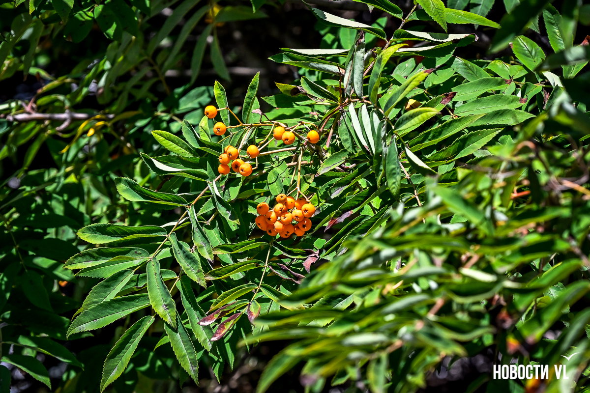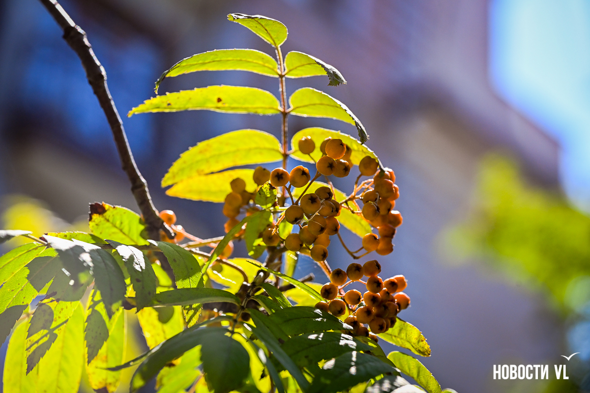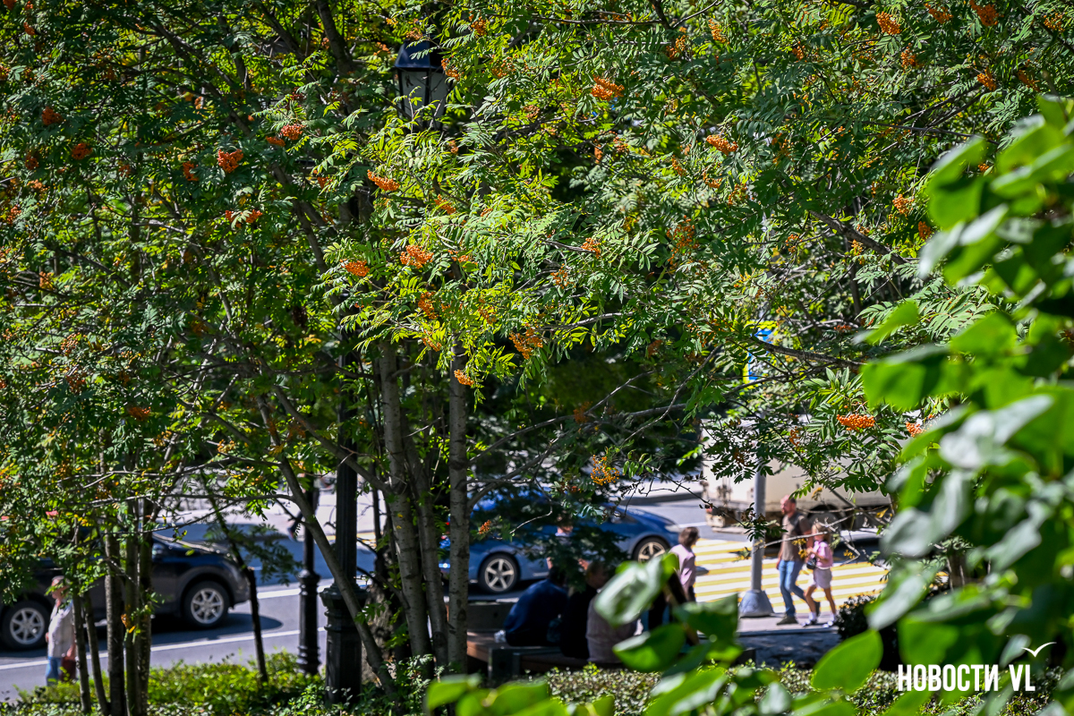 Рябины кострами во Владивостоке не горят – плоды местного вида, рябины амурской, оранжевые. Алеть они начнут зимой, хотя и сейчас выглядят красиво. Тонкие ветви свисают под тяжестью гроздьев всё ниже, и каждый желающий может сделать с ними или на их фоне фотографию «имени 3 сентября».