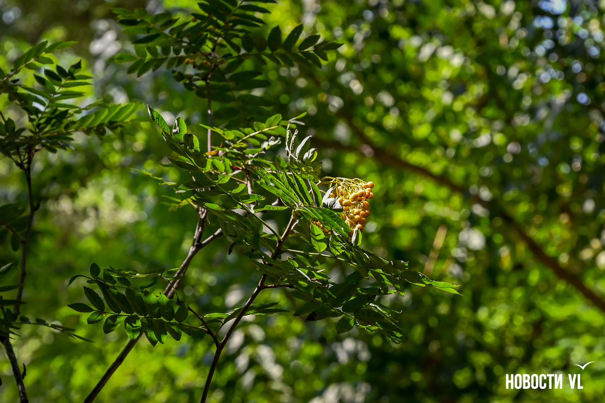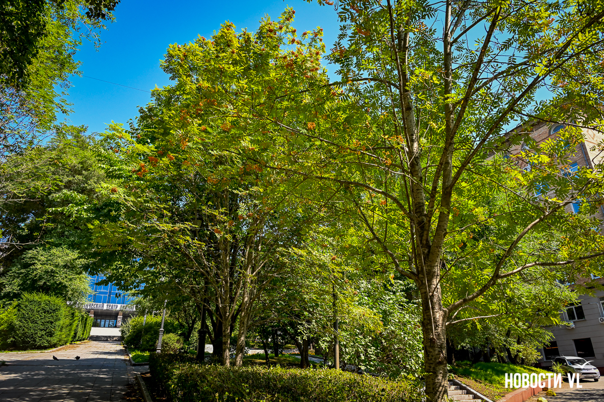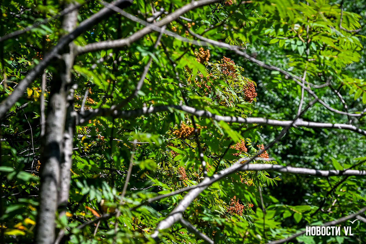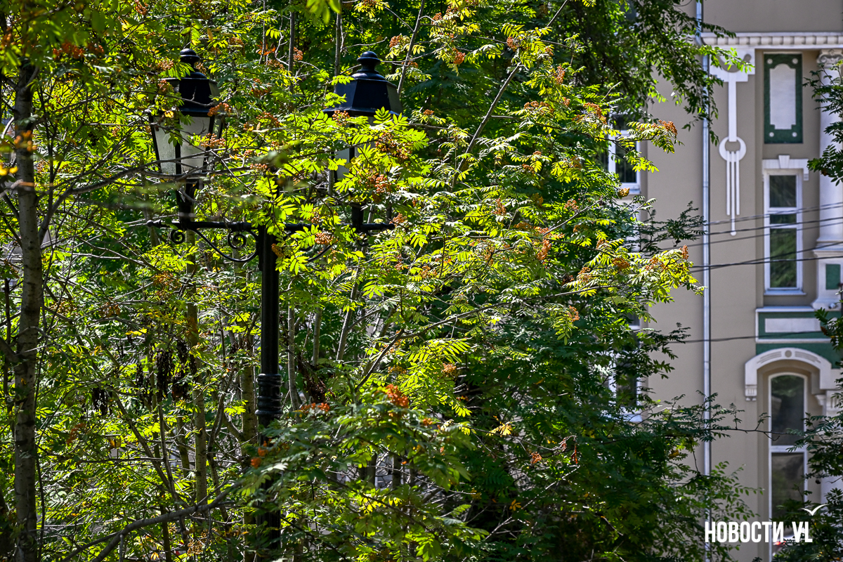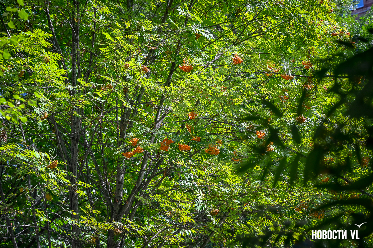 Рябины кострами во Владивостоке не горят – плоды местного вида, рябины амурской, оранжевые. Алеть они начнут зимой, хотя и сейчас выглядят красиво. Тонкие ветви свисают под тяжестью гроздьев всё ниже, и каждый желающий может сделать с ними или на их фоне фотографию «имени 3 сентября».