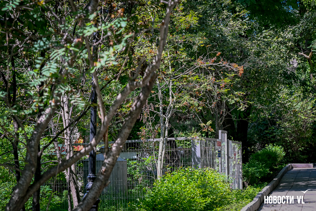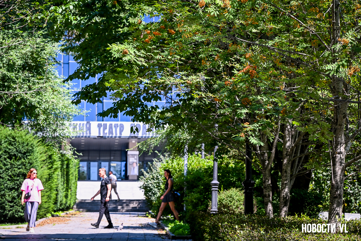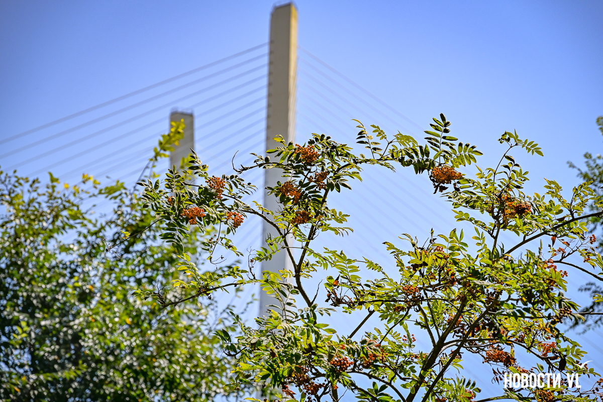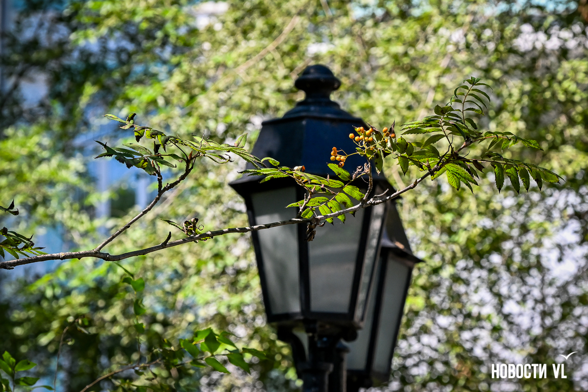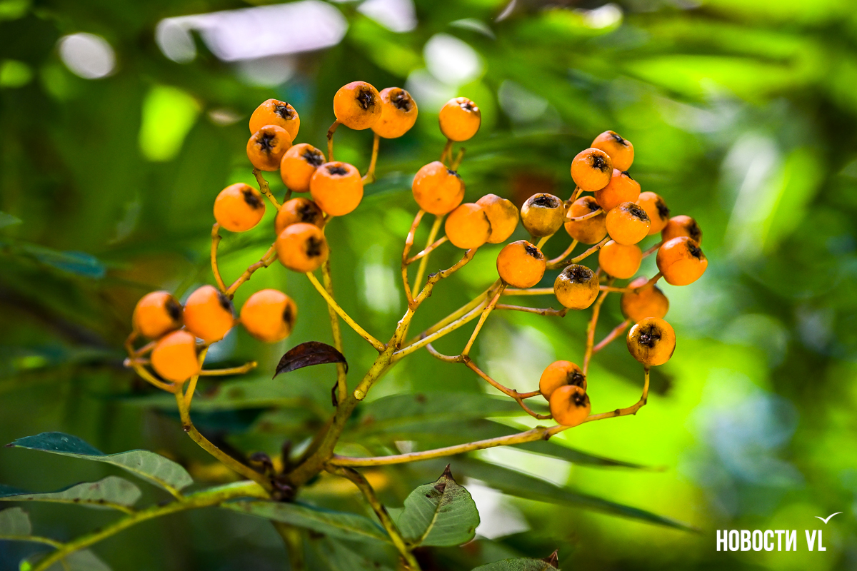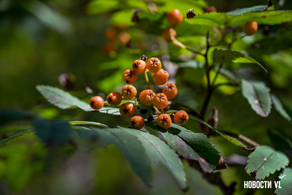 Рябины кострами во Владивостоке не горят – плоды местного вида, рябины амурской, оранжевые. Алеть они начнут зимой, хотя и сейчас выглядят красиво. Тонкие ветви свисают под тяжестью гроздьев всё ниже, и каждый желающий может сделать с ними или на их фоне фотографию «имени 3 сентября».