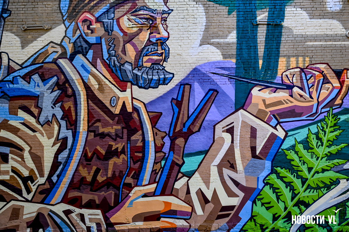 Сергей Иман работает в полигональном стиле, когда объект изображают через геометрические формы. Хорошо видно, что герои граффити – Дерсу Узала, Арсеньев, его помощники, компас, тигр – разбиты на фрагменты.