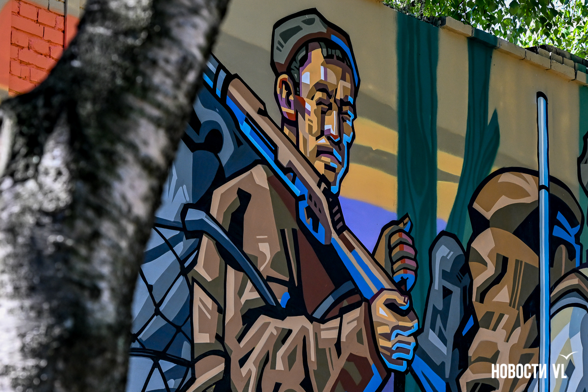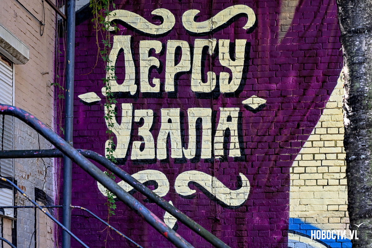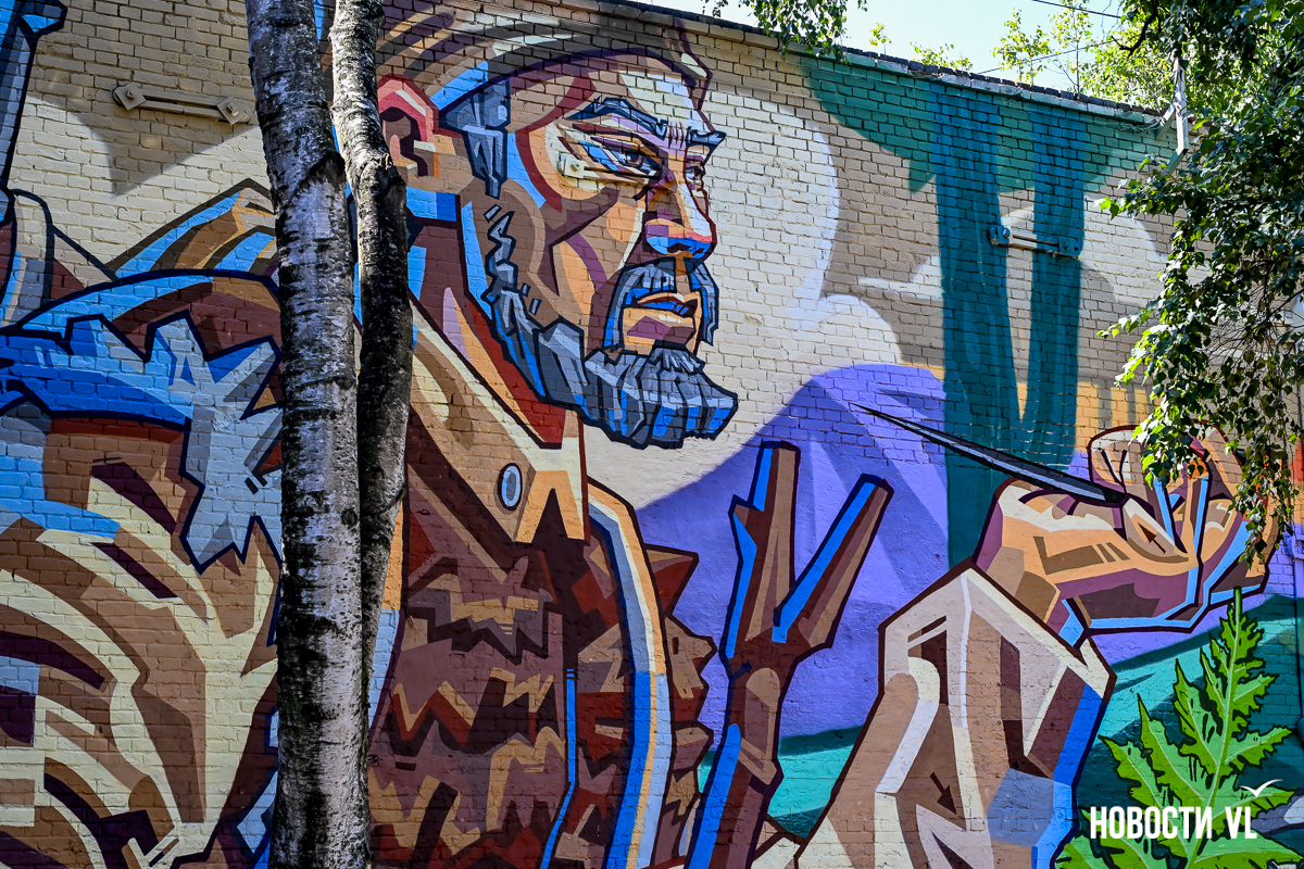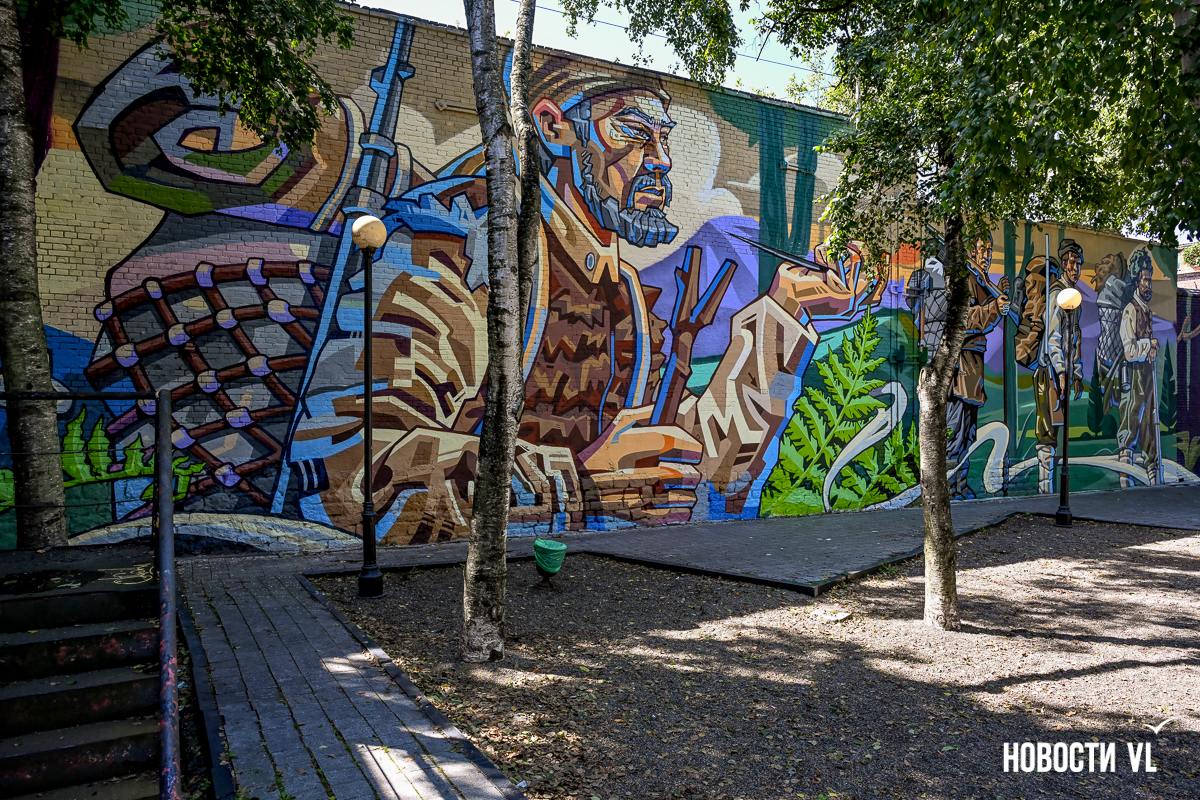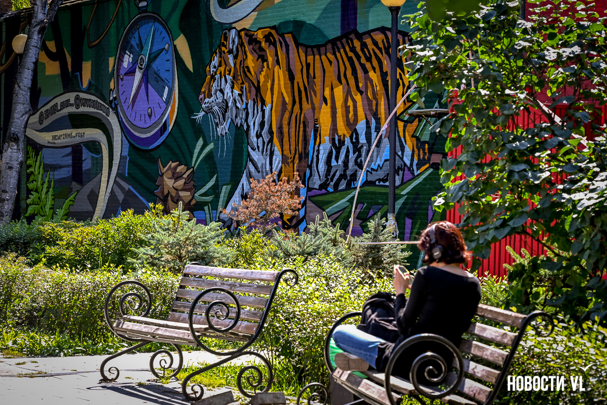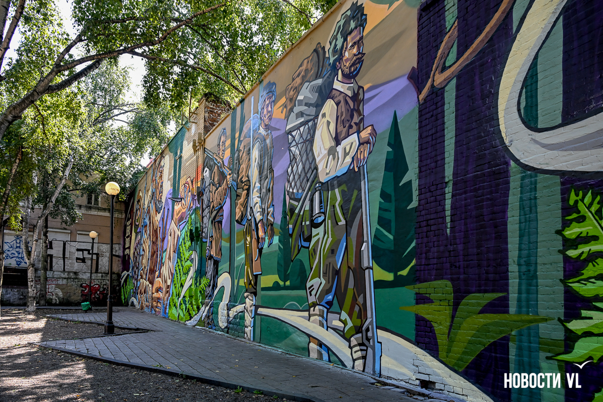 В центре Владивостока – новое граффити. Стену у сквера городов-побратимов на углу Пограничной и Семёновской теперь покрывает красочная история экспедиции Владимира Арсеньева. Она удачно «вписалась» в небольшой сквер, и нарисованная зелень кажется продолжением живой. В ней изображены Дерсу Узала, путешественник Арсеньев, уже второй, и ещё один тигр – шестой за это лето.