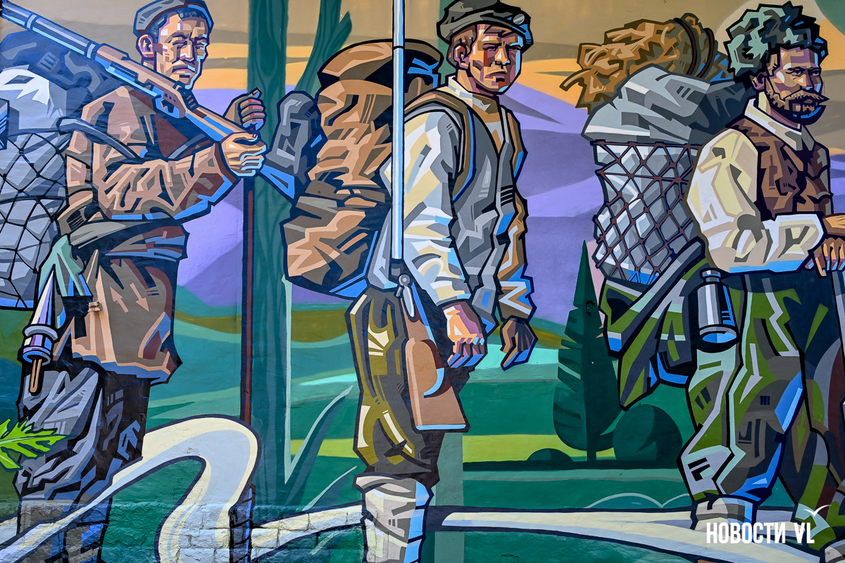 «Эскиз всем понравился, но потом организаторы «переиграли»: так как сквер исторический, хорошо бы взять такое направление. Мы решили развить историю с Дерсу Узала. Он здесь раньше тоже был, но занимал небольшой фрагмент поверхности. Мы объединили историей о таёжных экспедициях Владимира Арсеньева всю стену. Здесь хорошо прослеживается стиль Сергея, он делит рисунок плоскостями. Мы пошли в этом направлении, это его техника».