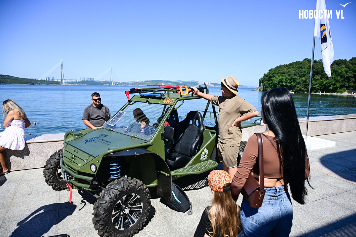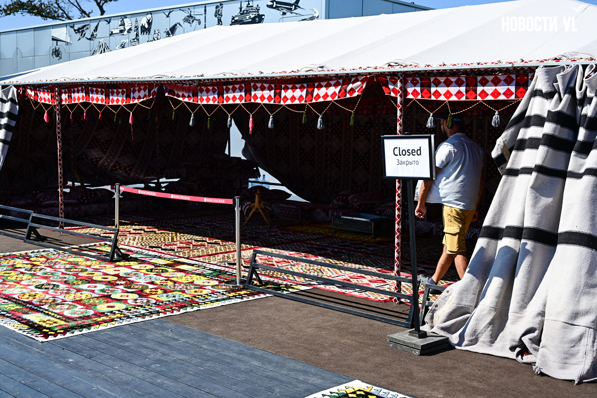 О том, чем наполнена «Улица Дальнего Востока» в этом году, мы уже рассказывали, но такой она была для гостей ВЭФ. Для обычных горожан выставку открывают после форума. Обычно на все выходные и в какой-то из будних дней. Но в этом году она выпала на воскресенье, понедельник и вторник. Поэтому (и потому что день выдался жарким – погода как раз для поездки на пляж) ближе к обеду дорогу в сторону Русского острова сковала длинная пробка. Горожане жарились в машинах от остановки «Катерная».
