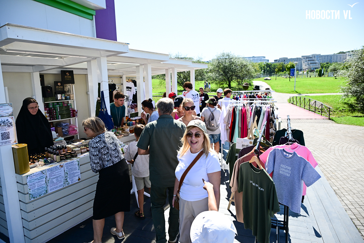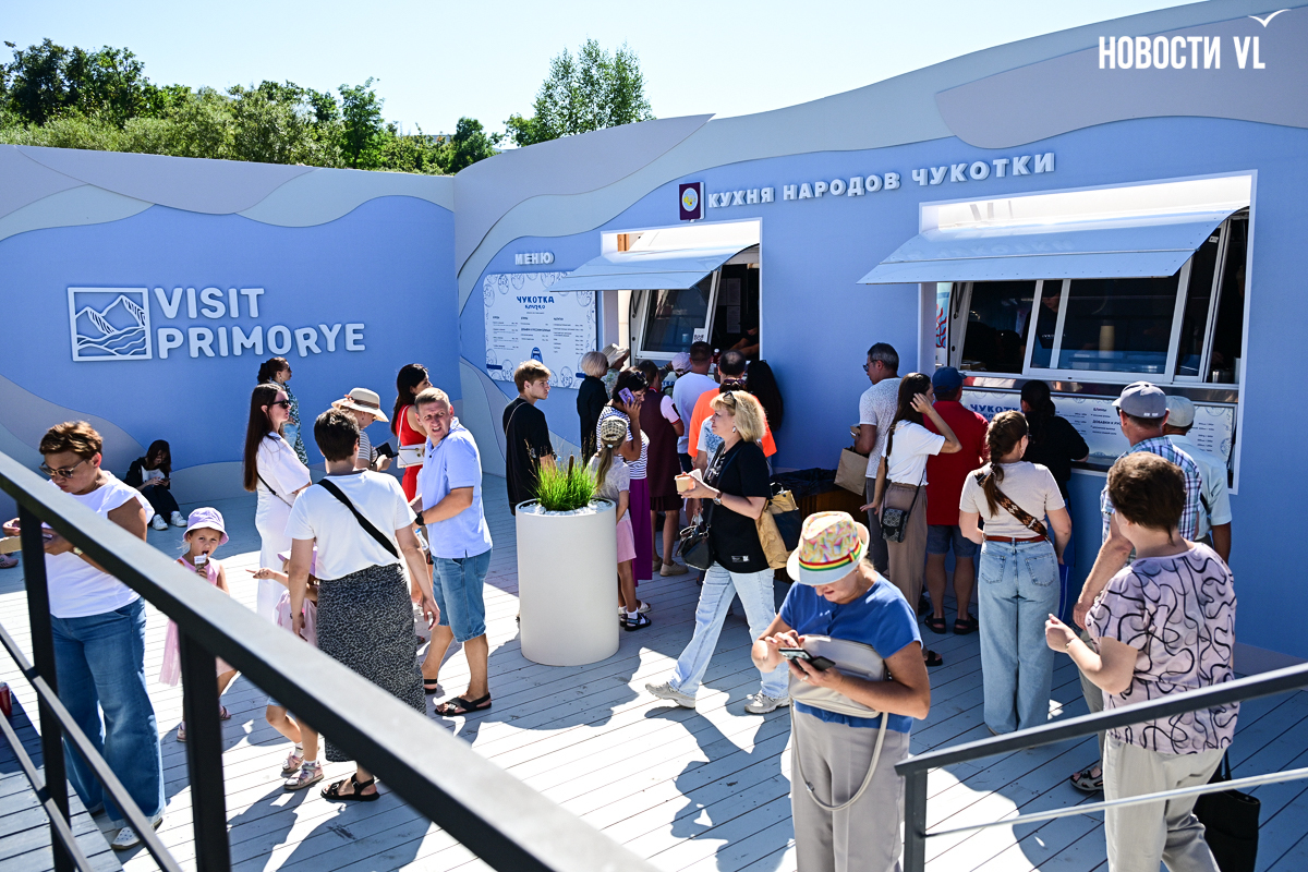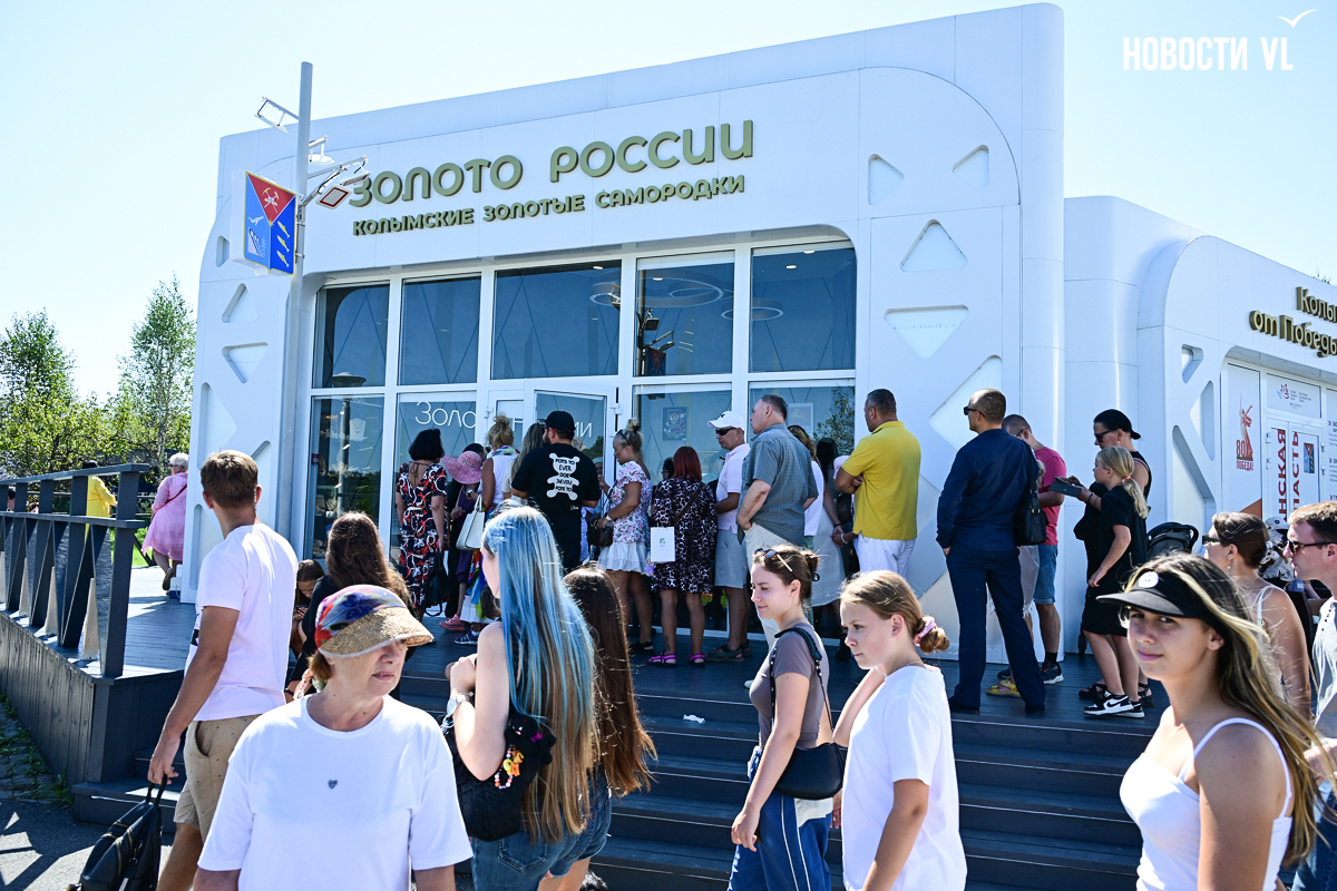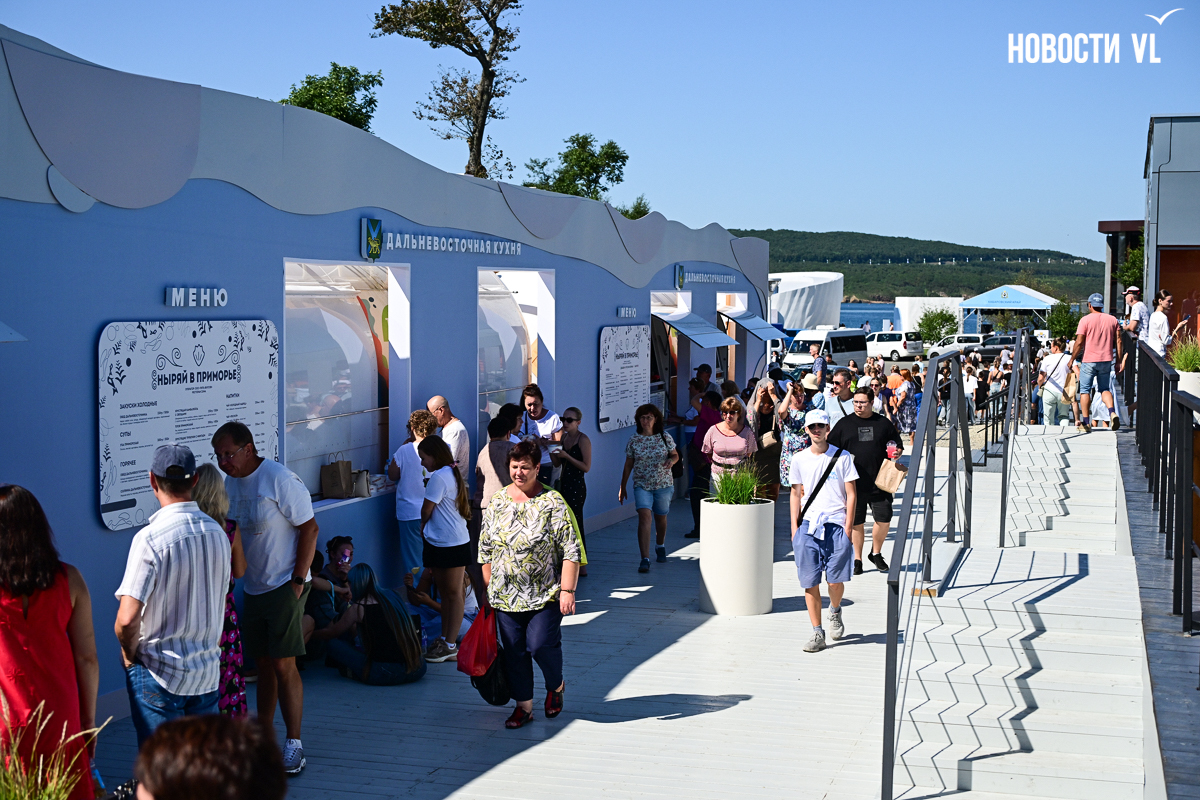 Очереди в павильоны с товарами местных производителей, одеждой с Камчатки и золотом из Якутии гигантские. Причём пиво, например, уже разобрали, а одежда и сувениры остались лишь нескольких размеров и цветов. То же самое касается рыбного рынка. Самая длинная очередь выстроилась за мороженым, но и у обычных заведений, продающих блины и плов, людей хватает, хотя многих позиций нет в меню.