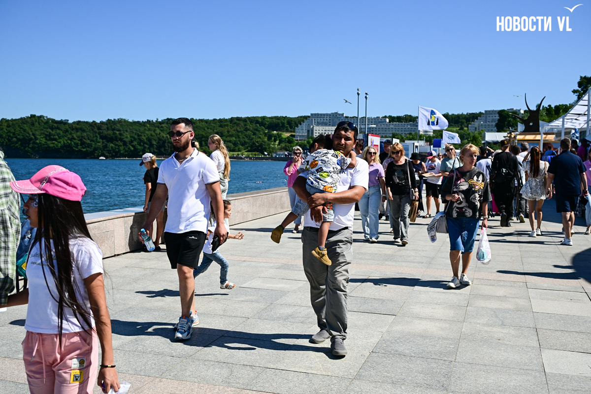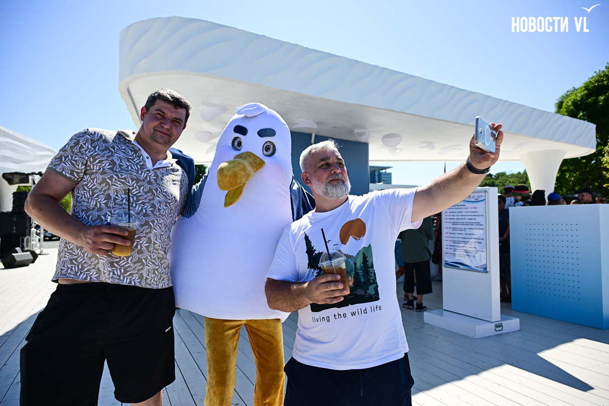 Всюду поют, гуляют аниматоры в костюмах чаек на ходулях, танцуют в нарядных костюмах местные коллективы. Горожан, конечно, тянет к сценам, но по большей части к тем, что находятся в тени и под навесом. Кто-то прикрывается газетой, кто-то обмахивается флаером, полученным в каком-то из павильонов, остальные прикладывают к лицу бутылки. Есть те, кто подготовился и захватил с собой купальник, и пока на набережной гудит праздник, на пляже жарятся на солнце и охлаждаются в морской воде отдыхающие.