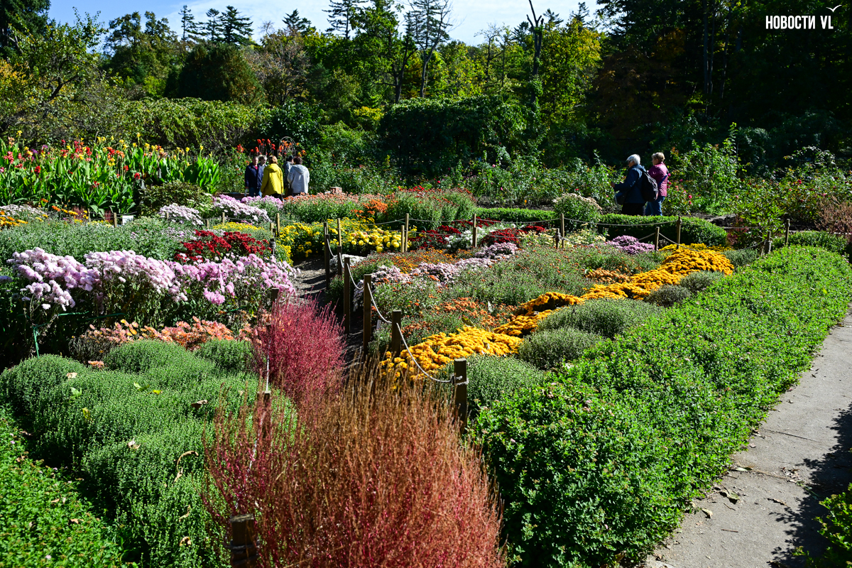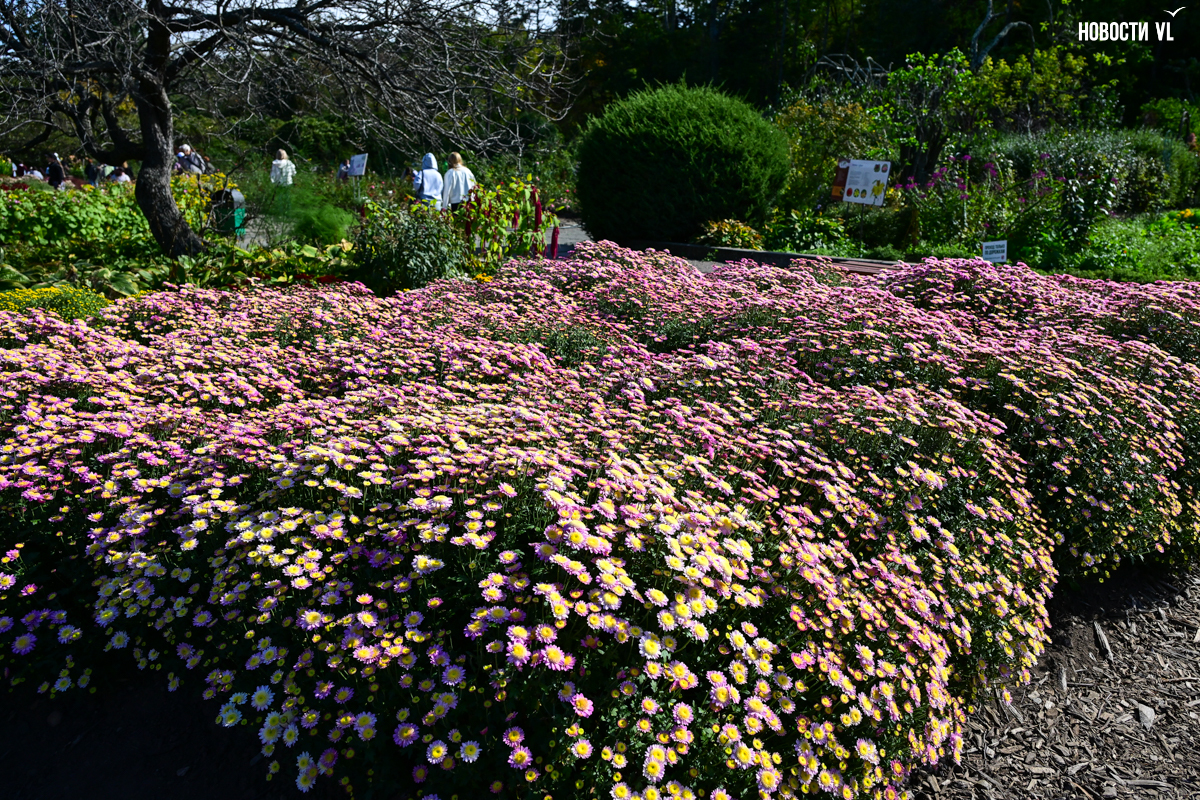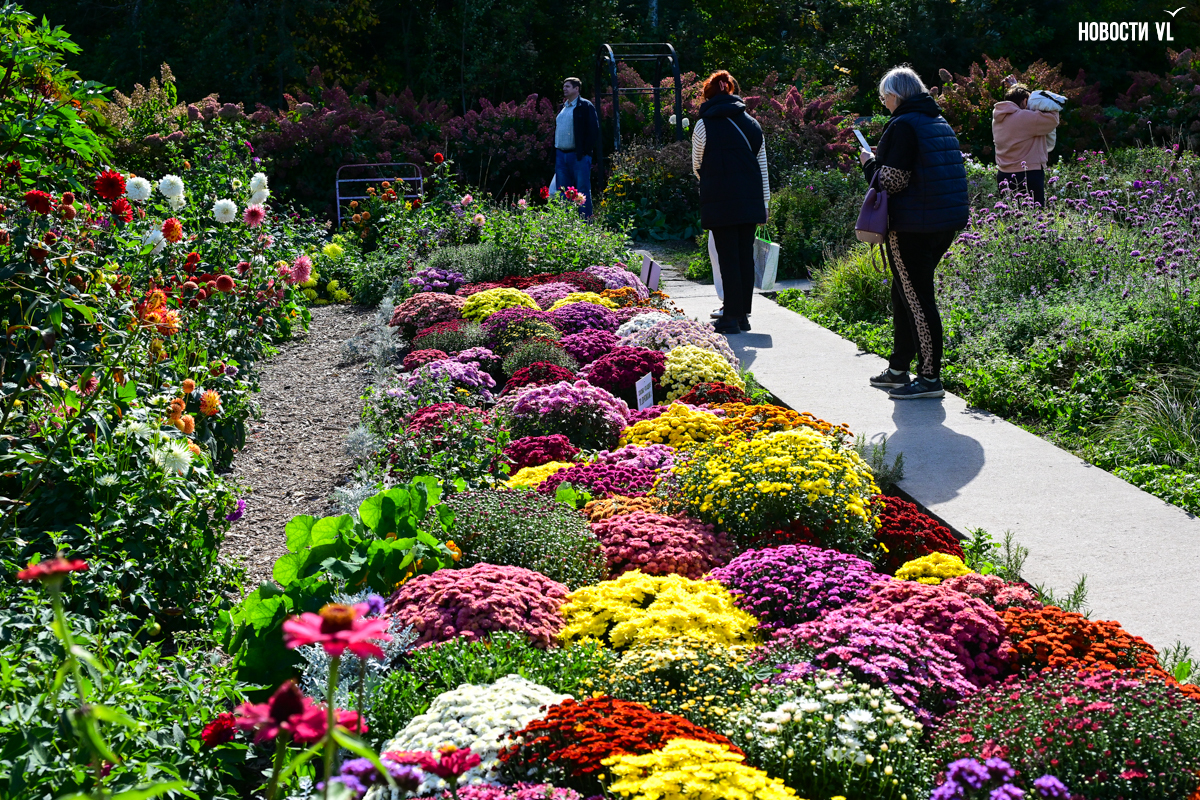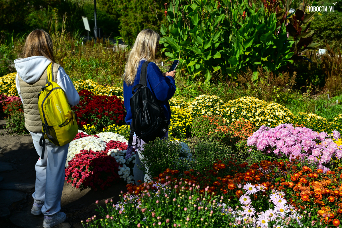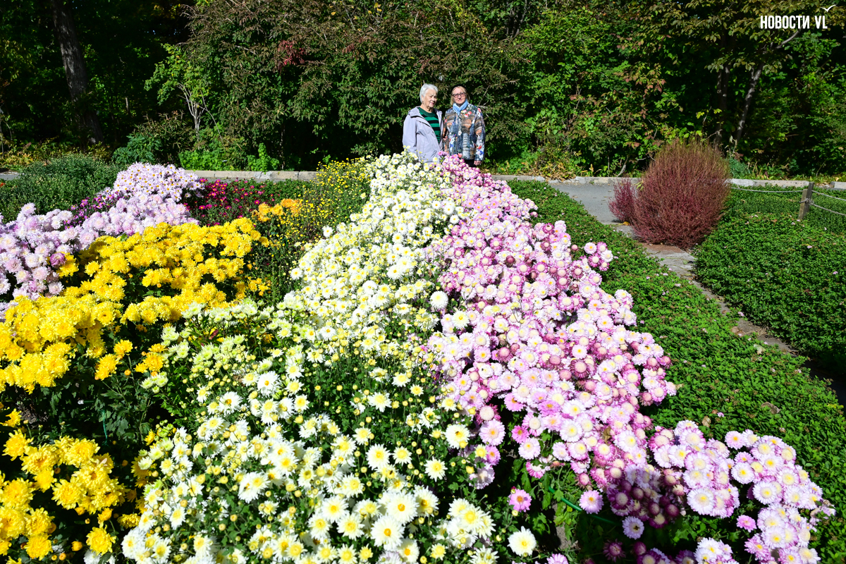 Главные цветы и запах тёплой осени – конечно, хризантемы. В Ботаническом саду растёт две их группы – мультифлора и корейские. И те, и другие в нашем климате начинают зацветать примерно в конце сентября и, если бы не заморозки, могли бы радовать своей красотой ещё 2 месяца. Но в Приморье эти цветки замерзают при первых серьёзных похолоданиях, хотя, например, хризантема корейская способна спокойно переносить кратковременные заморозки до −4 °C, так что даже после первых ночных холодов они ещё побудут красивыми.