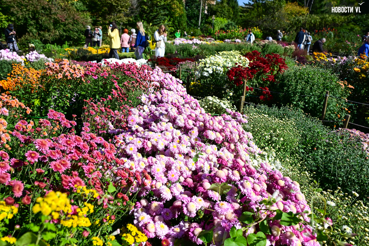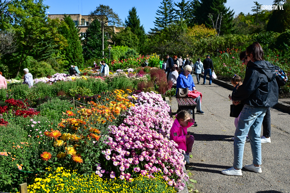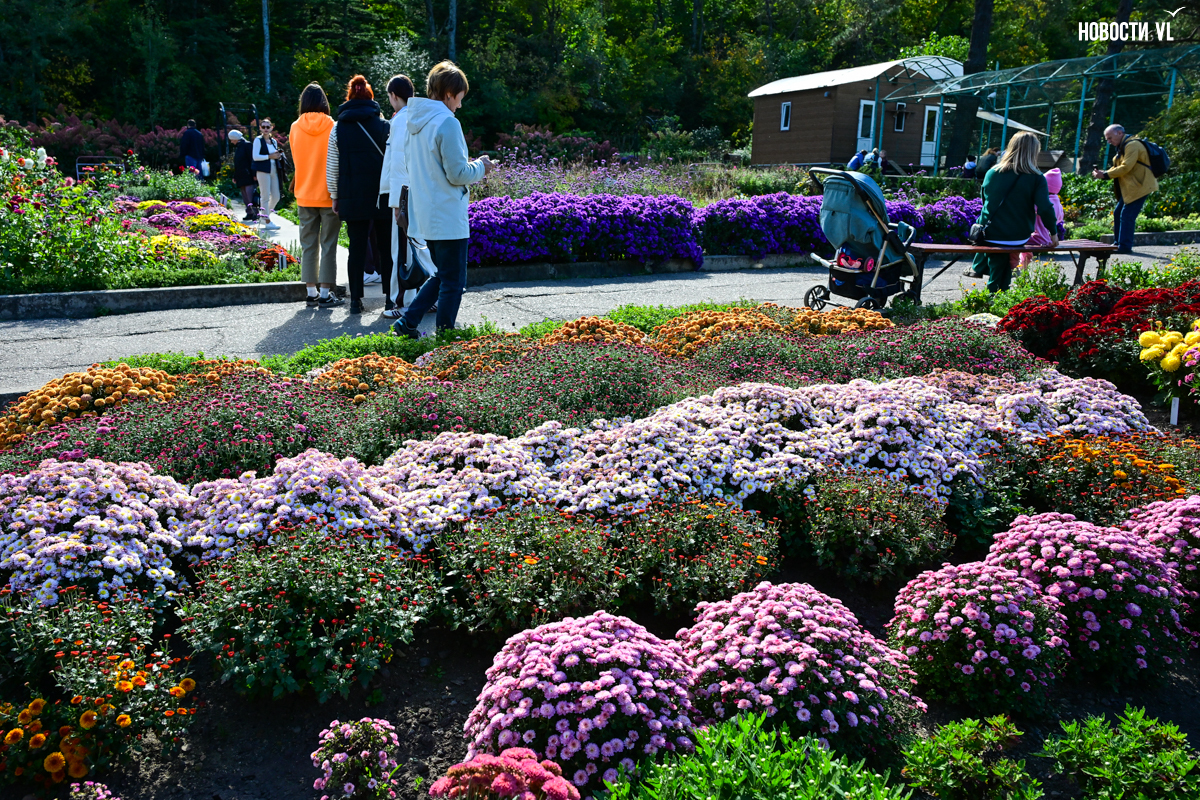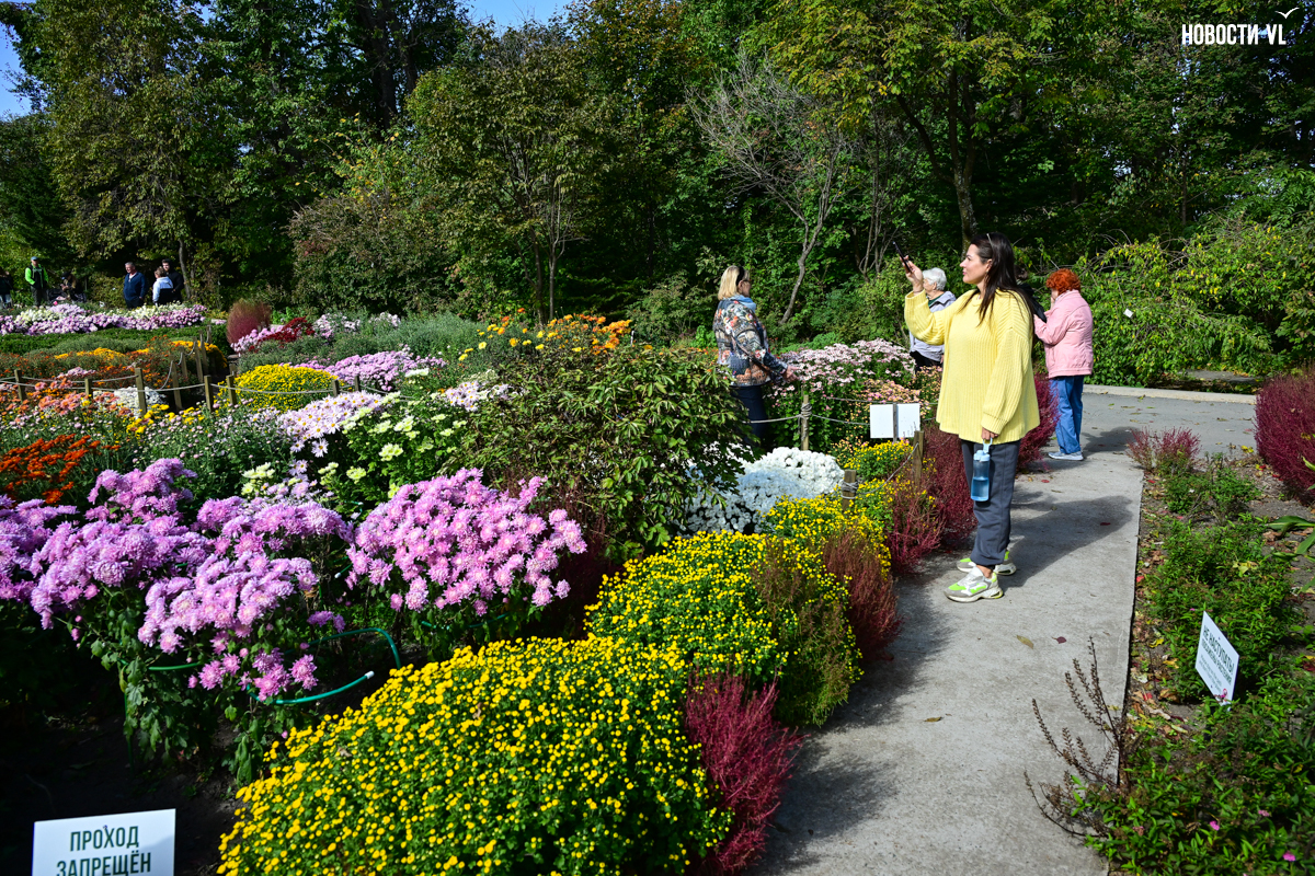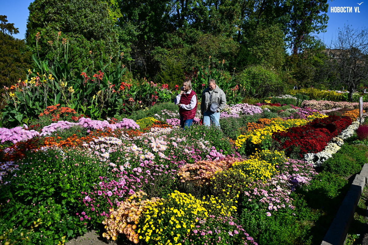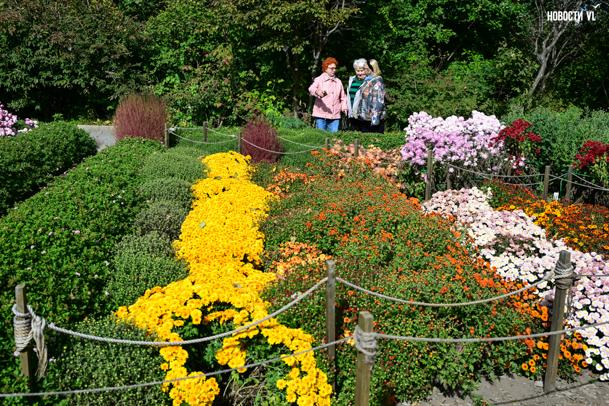 Главные цветы и запах тёплой осени – конечно, хризантемы. В Ботаническом саду растёт две их группы – мультифлора и корейские. И те, и другие в нашем климате начинают зацветать примерно в конце сентября и, если бы не заморозки, могли бы радовать своей красотой ещё 2 месяца. Но в Приморье эти цветки замерзают при первых серьёзных похолоданиях, хотя, например, хризантема корейская способна спокойно переносить кратковременные заморозки до −4 °C, так что даже после первых ночных холодов они ещё побудут красивыми.