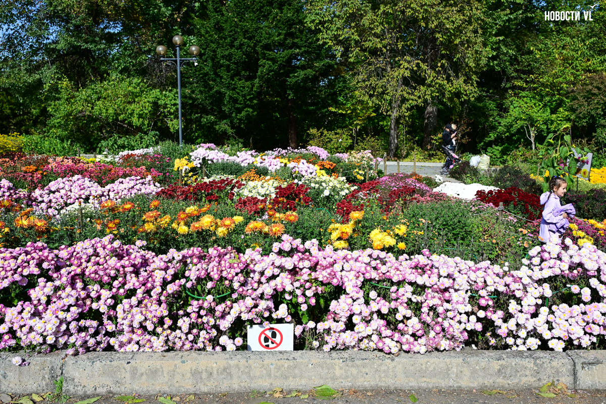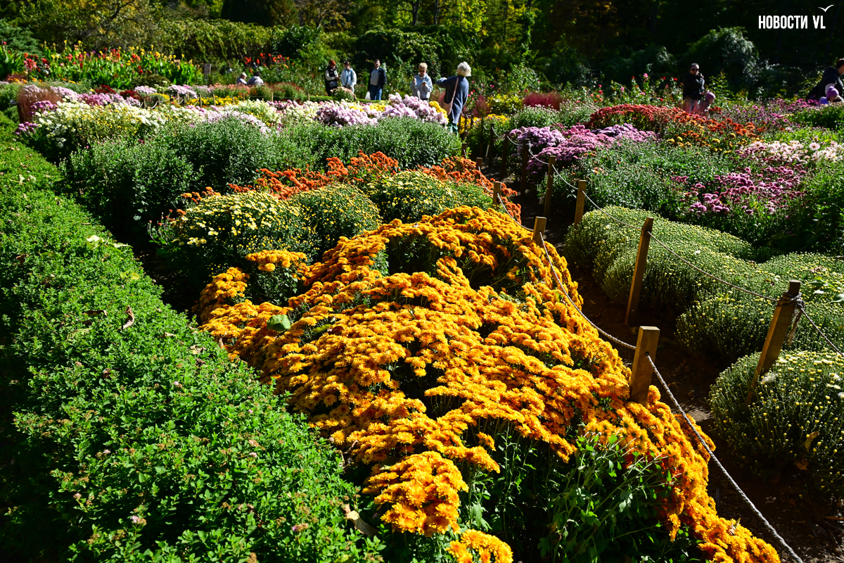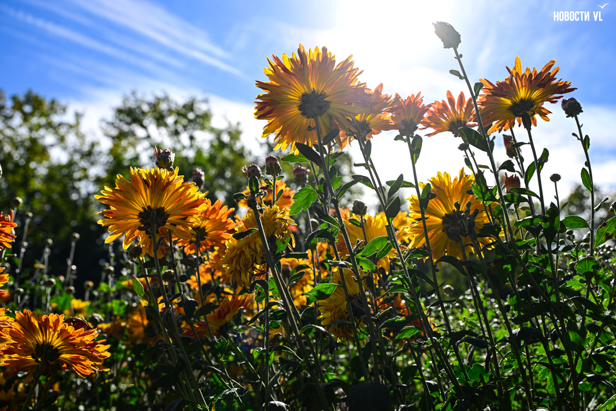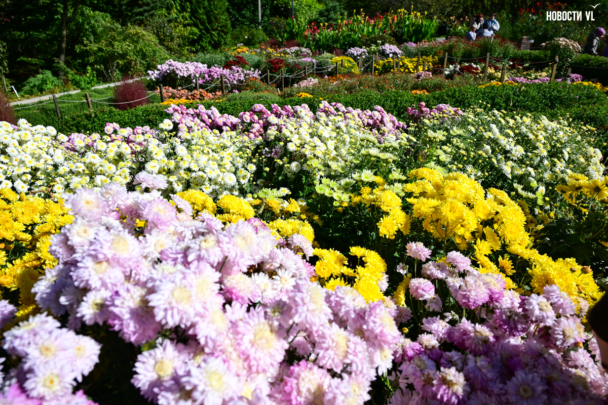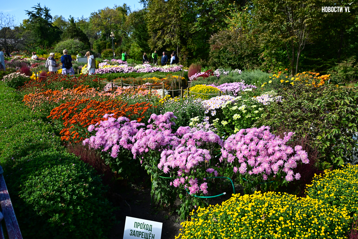 Главные цветы и запах тёплой осени – конечно, хризантемы. В Ботаническом саду растёт две их группы – мультифлора и корейские. И те, и другие в нашем климате начинают зацветать примерно в конце сентября и, если бы не заморозки, могли бы радовать своей красотой ещё 2 месяца. Но в Приморье эти цветки замерзают при первых серьёзных похолоданиях, хотя, например, хризантема корейская способна спокойно переносить кратковременные заморозки до −4 °C, так что даже после первых ночных холодов они ещё побудут красивыми.