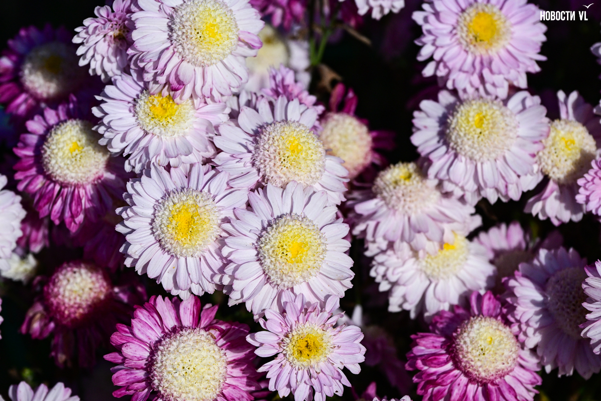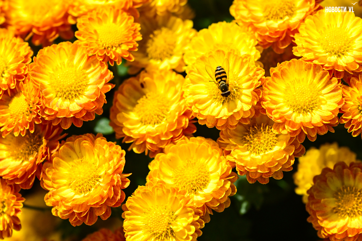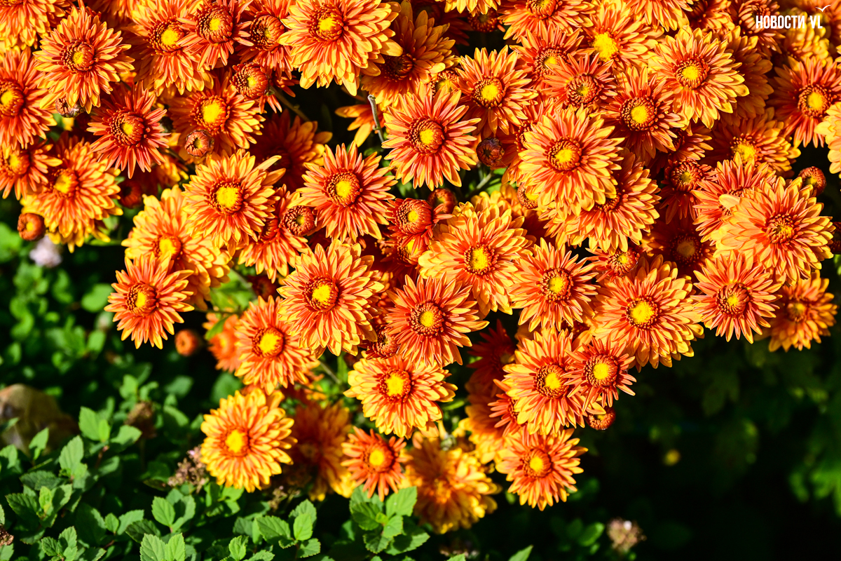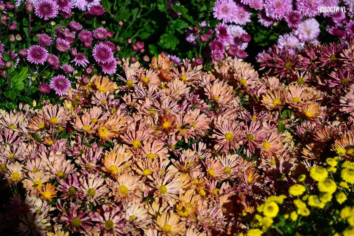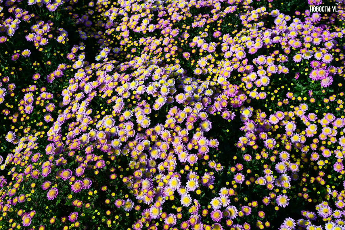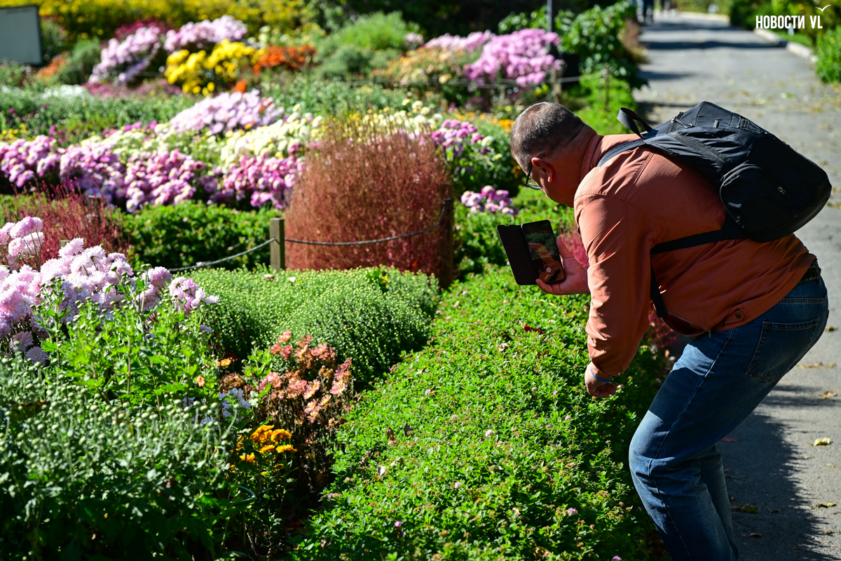 Главные цветы и запах тёплой осени – конечно, хризантемы. В Ботаническом саду растёт две их группы – мультифлора и корейские. И те, и другие в нашем климате начинают зацветать примерно в конце сентября и, если бы не заморозки, могли бы радовать своей красотой ещё 2 месяца. Но в Приморье эти цветки замерзают при первых серьёзных похолоданиях, хотя, например, хризантема корейская способна спокойно переносить кратковременные заморозки до −4 °C, так что даже после первых ночных холодов они ещё побудут красивыми.