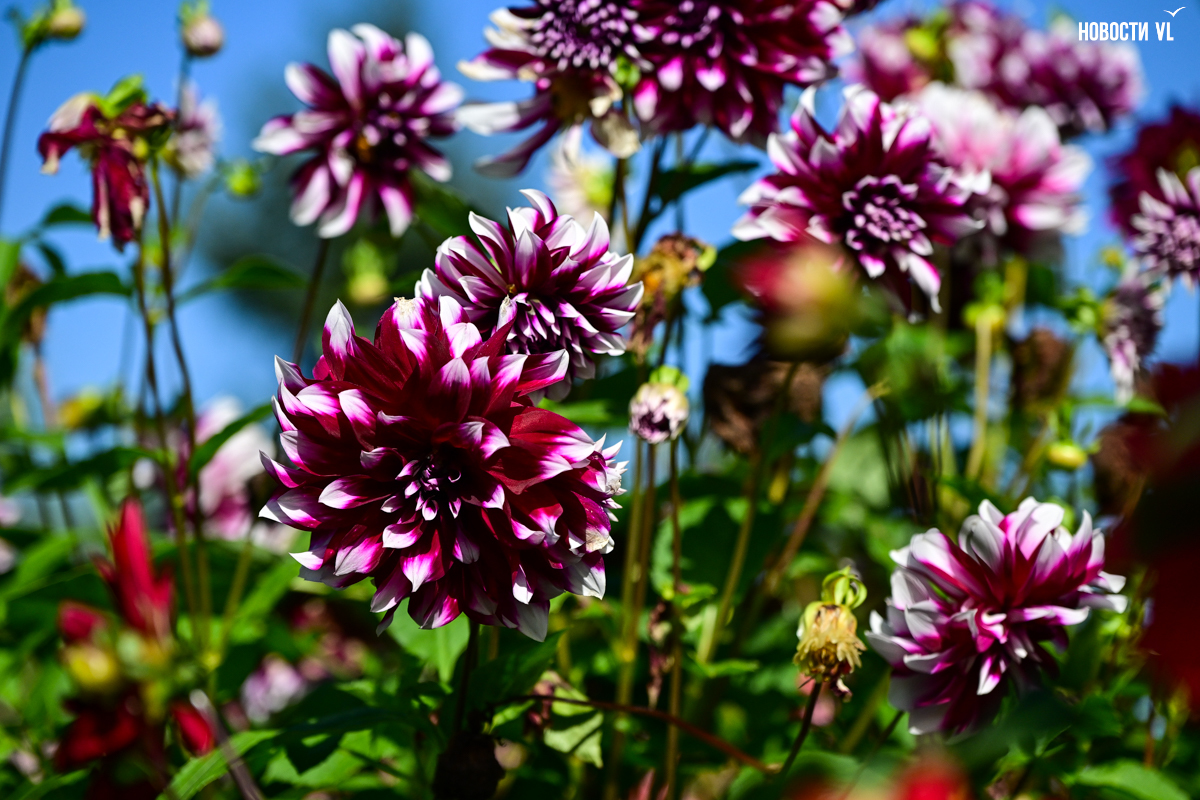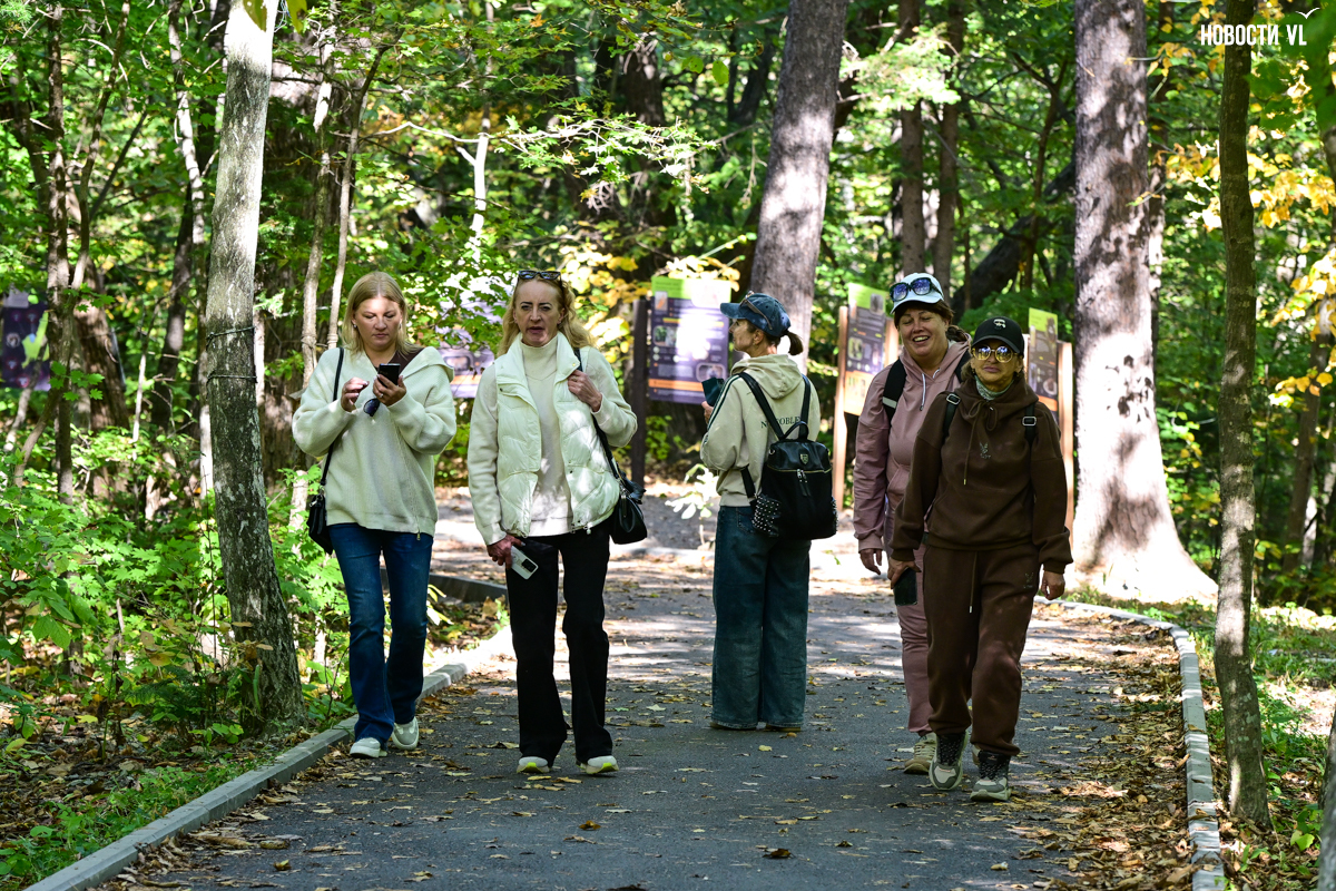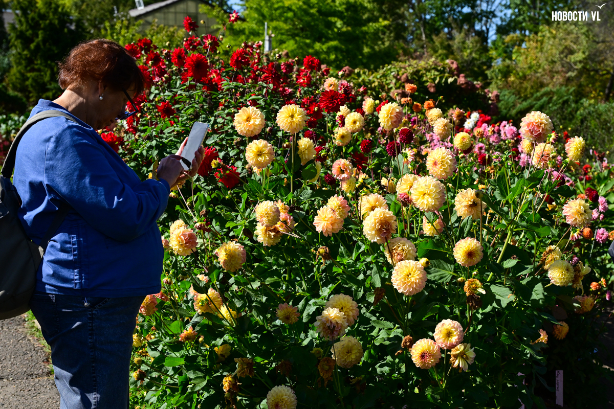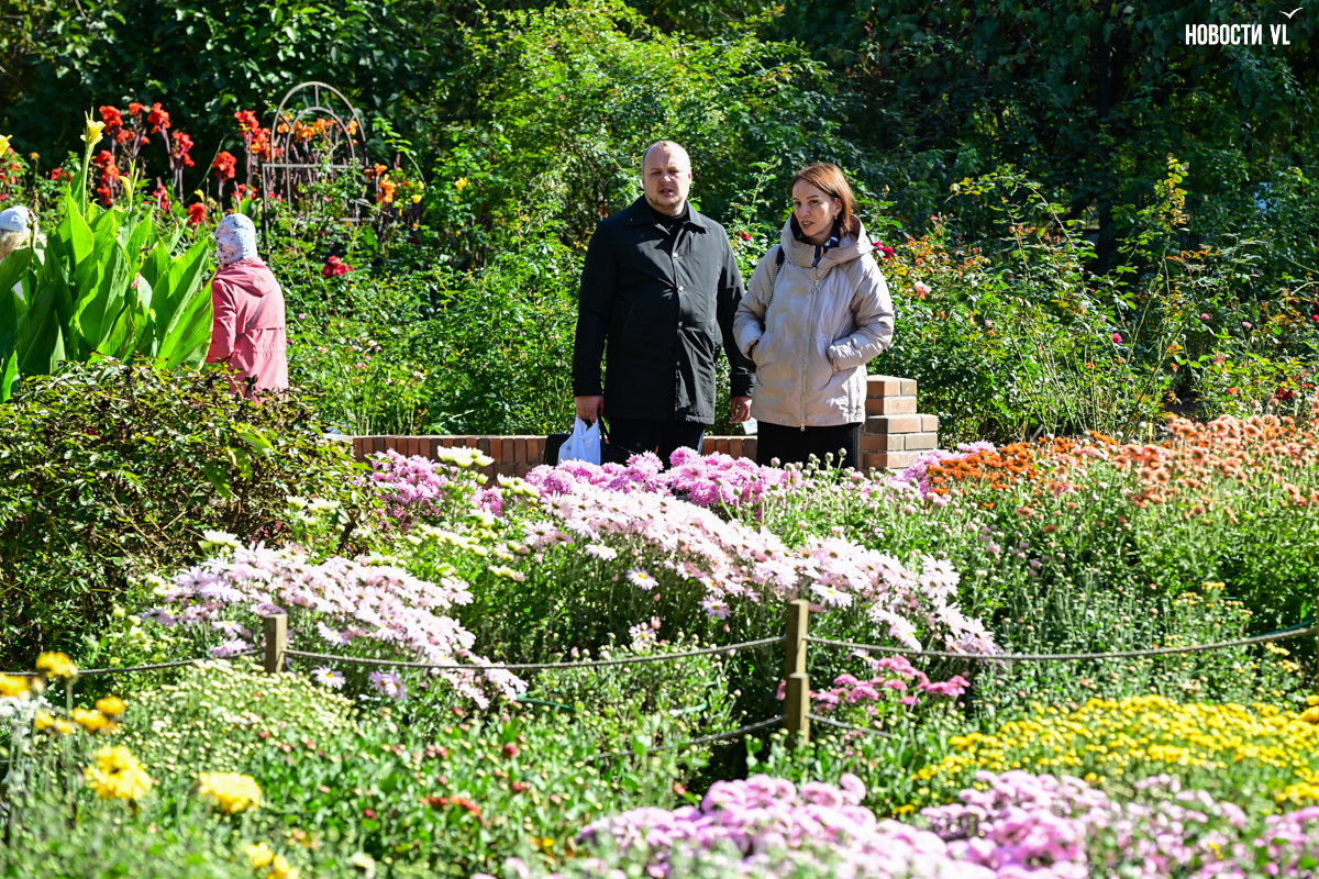 На этой неделе осень сменила жаркую летнюю погоду, а воздух во Владивостоке стал прохладным и прозрачным. И сразу многие горожане устремились в Ботанический сад ДВО РАН, чтобы насладиться одновременным увяданием и расцветом природы. На входе – очереди, по тропинкам открытой экспозиции даже в будний день гуляют десятки людей. На солнце ещё горят георгины, цветут облака хризантем. Деревья осень пока едва тронула, алые клёны приходится выискивать, полностью окраситься они должны примерно через неделю, но на экологических тропах уже можно похрустеть опавшей листвой.