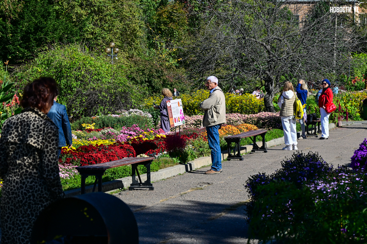 Хризантемы в Ботаническом саду сейчас не продают. Горожане делают свои букеты из жёлтых листьев. Многие ходят, размахивая такими или собирая подобные близким. Приезжают семьями, с совсем маленькими детьми в колясках, парами и компанией друзей.